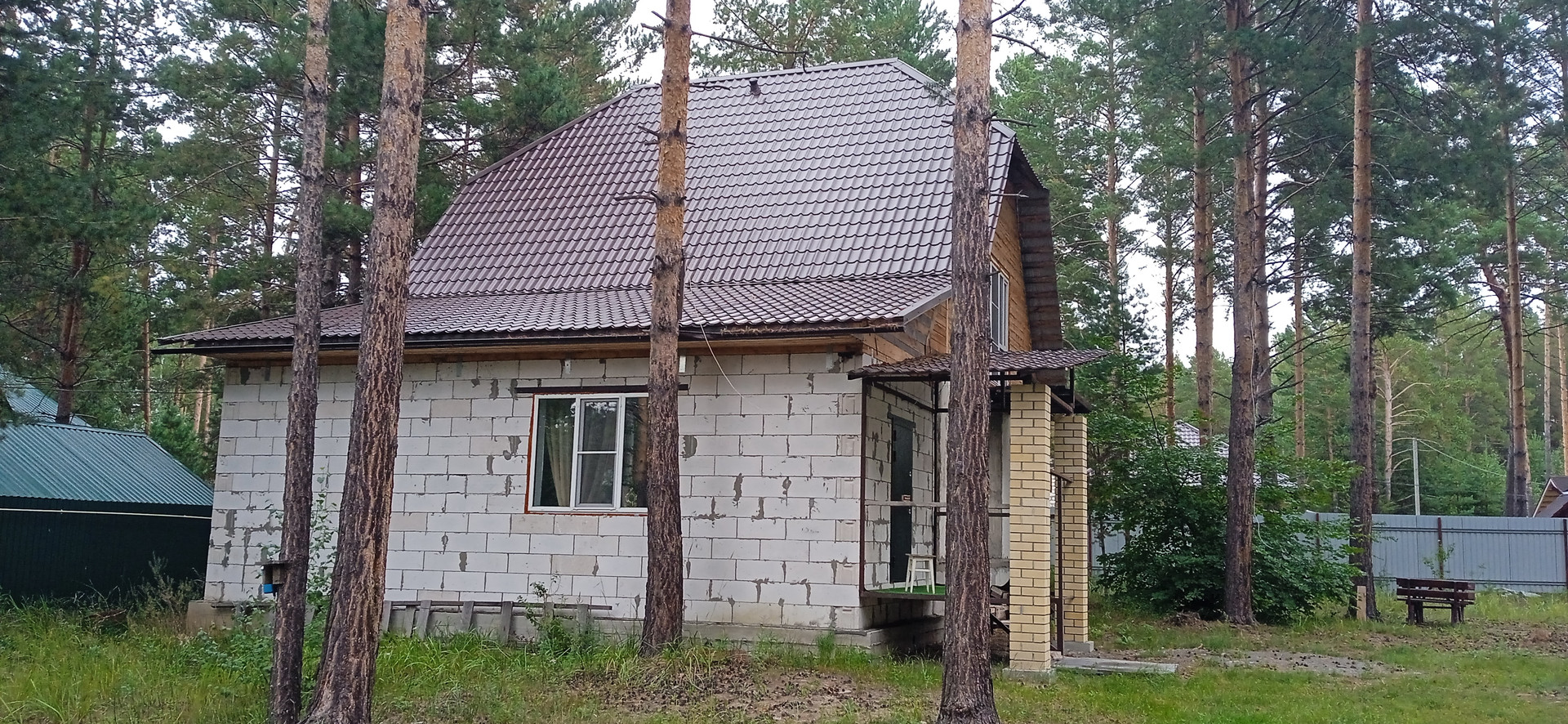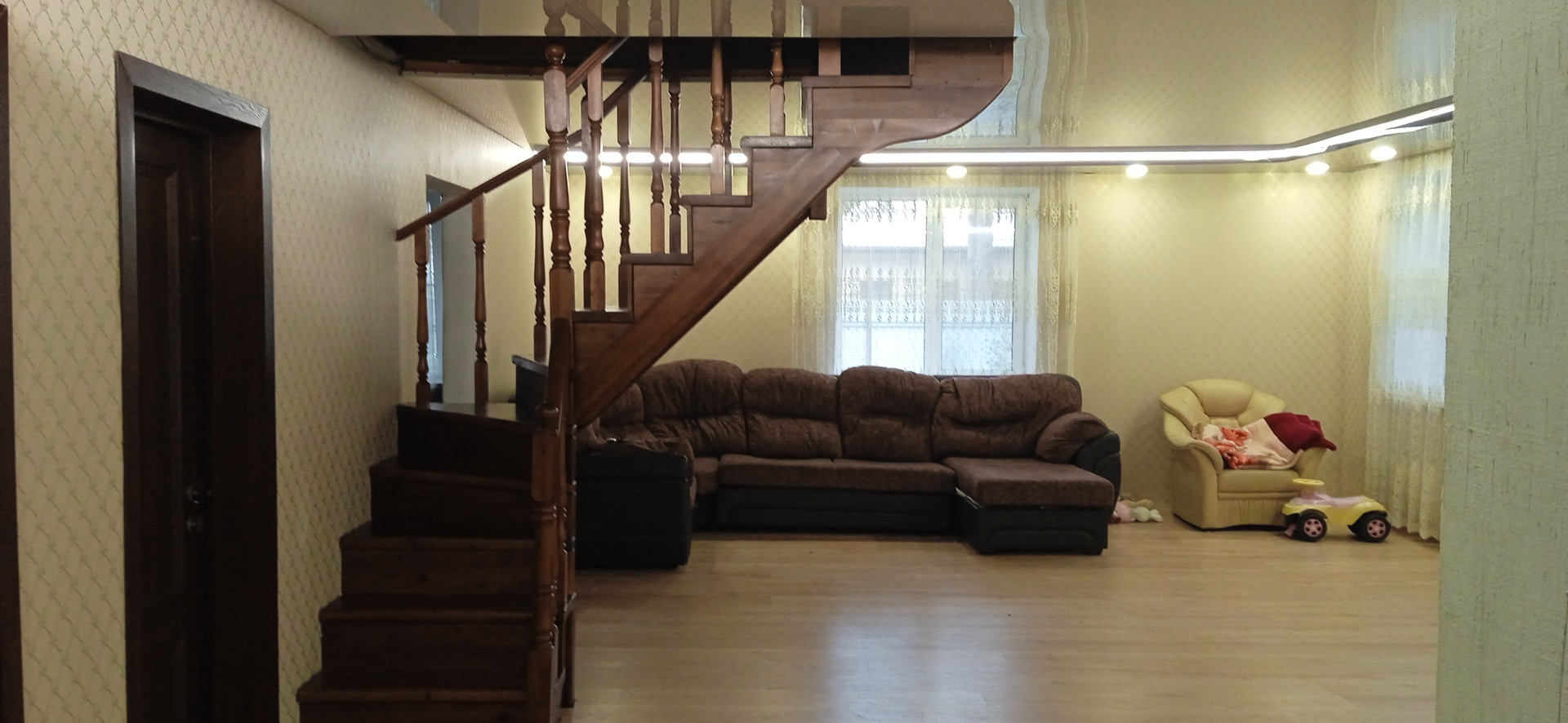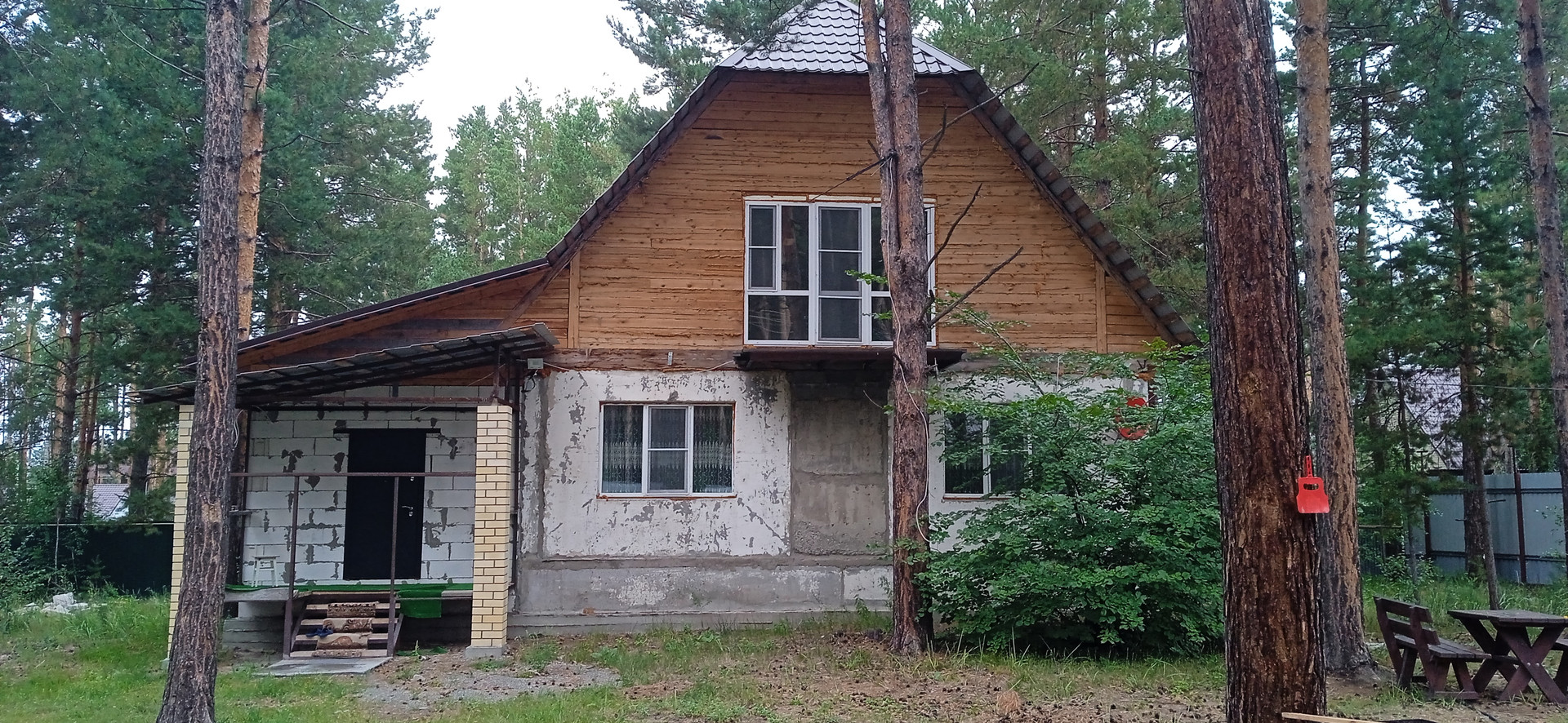 Дом строился основательно для семьи с ребятишками, пол первого этажа и перекрытие второго этажа из плит. Второй этаж из бруса 150х150.