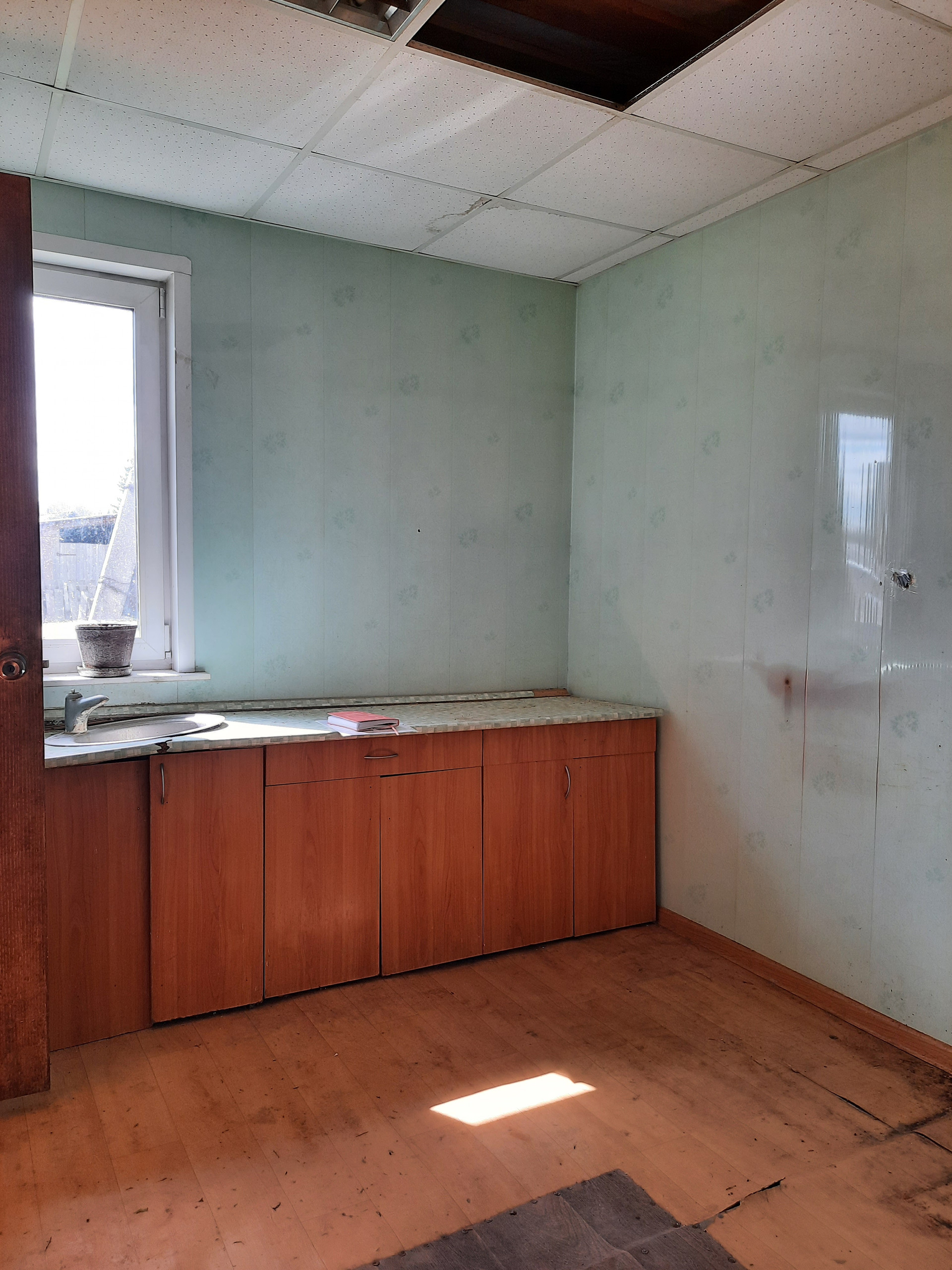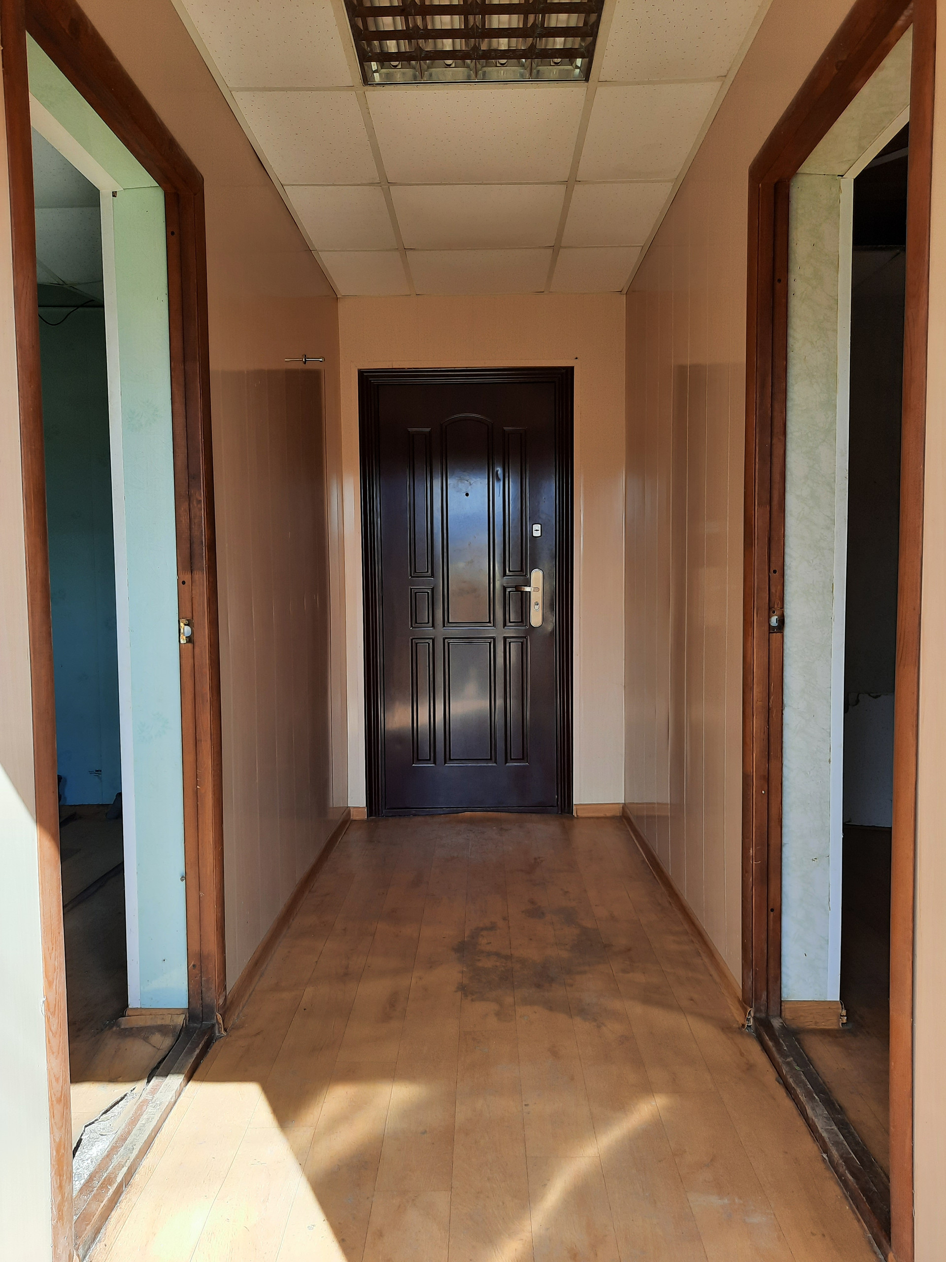 В квартире бетонированные полы, сверху - линолеум. Потолки - плитка "Байкал" + потолочные светильники. Стены на кухне, в кладовке и в прихожей - пластиковые панели, в комнатах покрашены. По всей квартире на окнах установлены стеклопакеты, стоят хорошие межкомнатные двери, входные двери - железные.