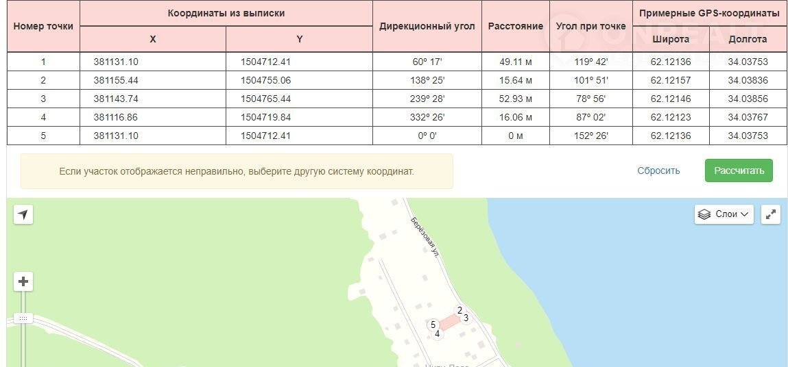 Координаты участка: 62.12157 34.03836