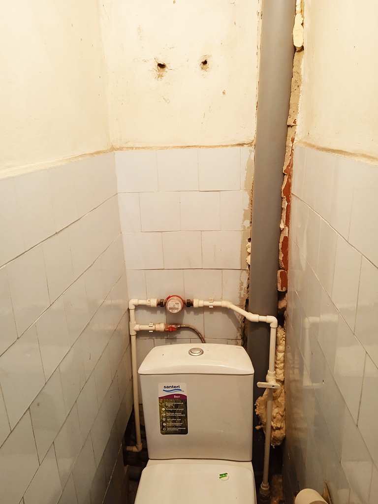 Санузел раздельный, пластиковые трубы, имеются счетчики воды и газа.