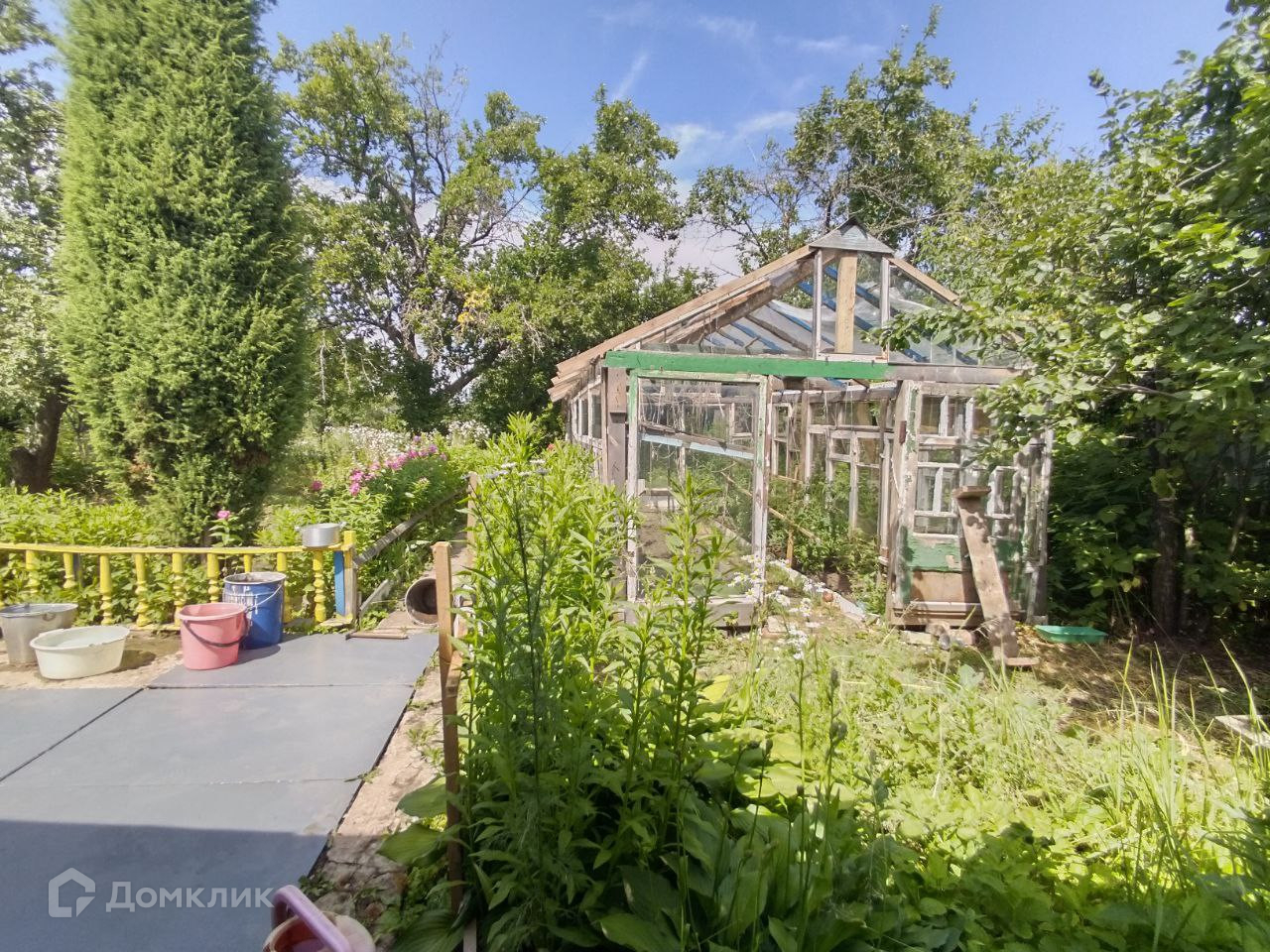 Множество плодовых деревьев и кустарников. Огород + большая теплица.