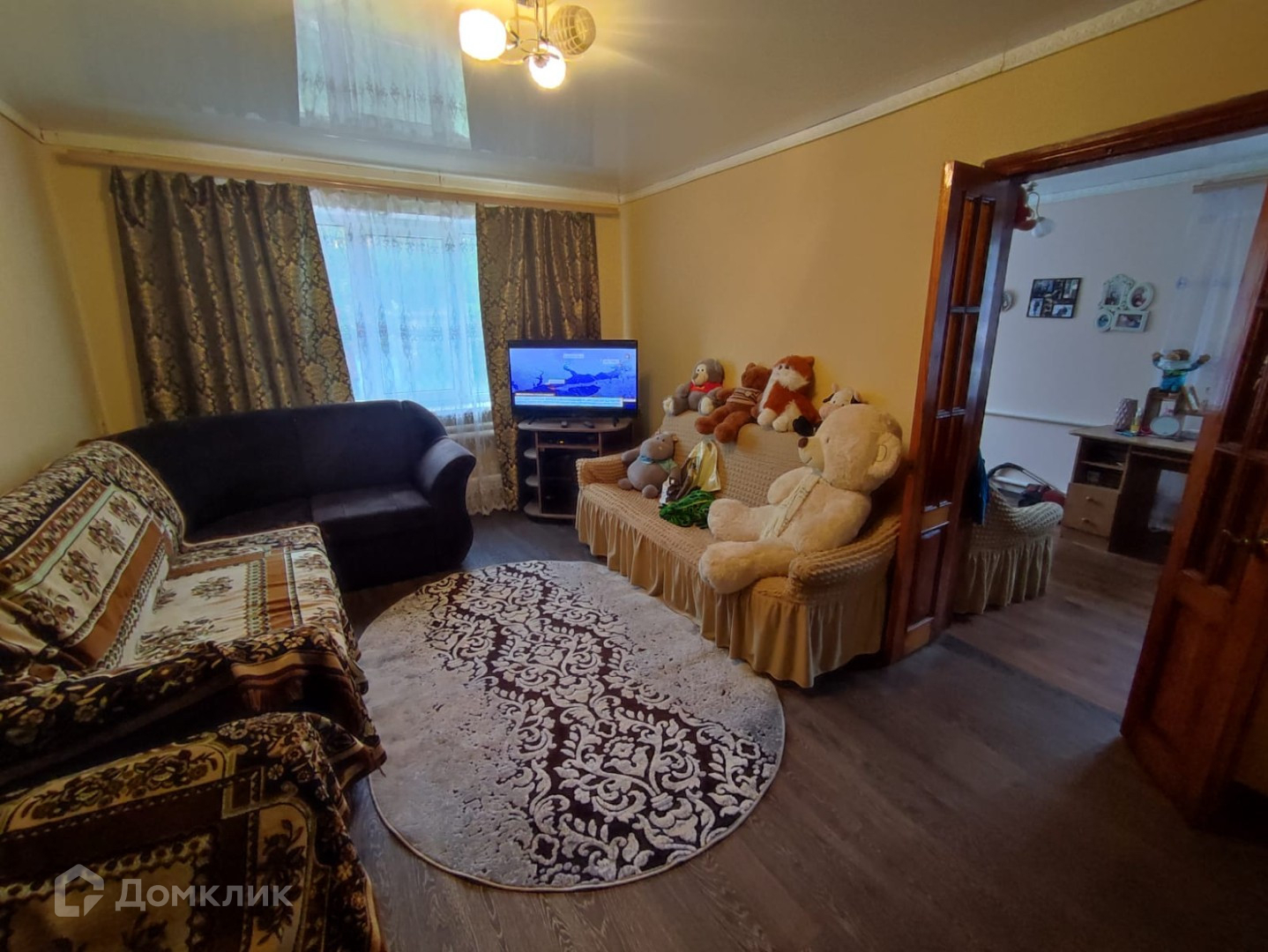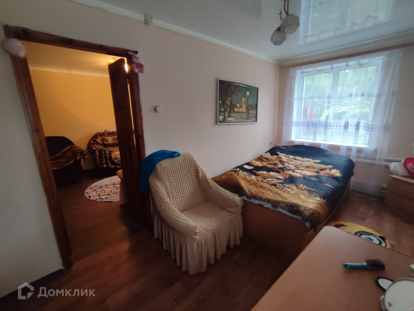 Общей площадью 43 кв.м. Так же к квартире прилагается участок земли, на котором есть жилой однокомнатный дом, со всеми коммуникациями, все входит в стоимость.