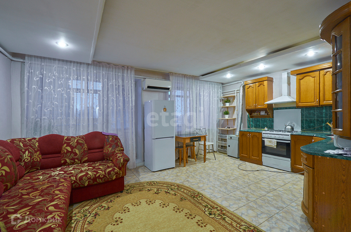 В квартире качественный ремонт: в коридоре и кухне-гостиной на полу плитка, двух уровневые потолки, в двух изолированных комнатах натяжные потолки, ванная комната раздельно и все в плитке, окна пластиковые, газовое отопление в квартире, боллер на горячую воду, кондиционер.