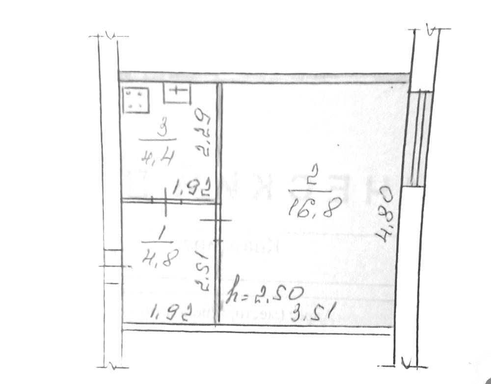 Общая площадь – 26 кв.м. Жилая комната – 16, 8 кв.м. Площадь кухни- 4, 5 кв.м.