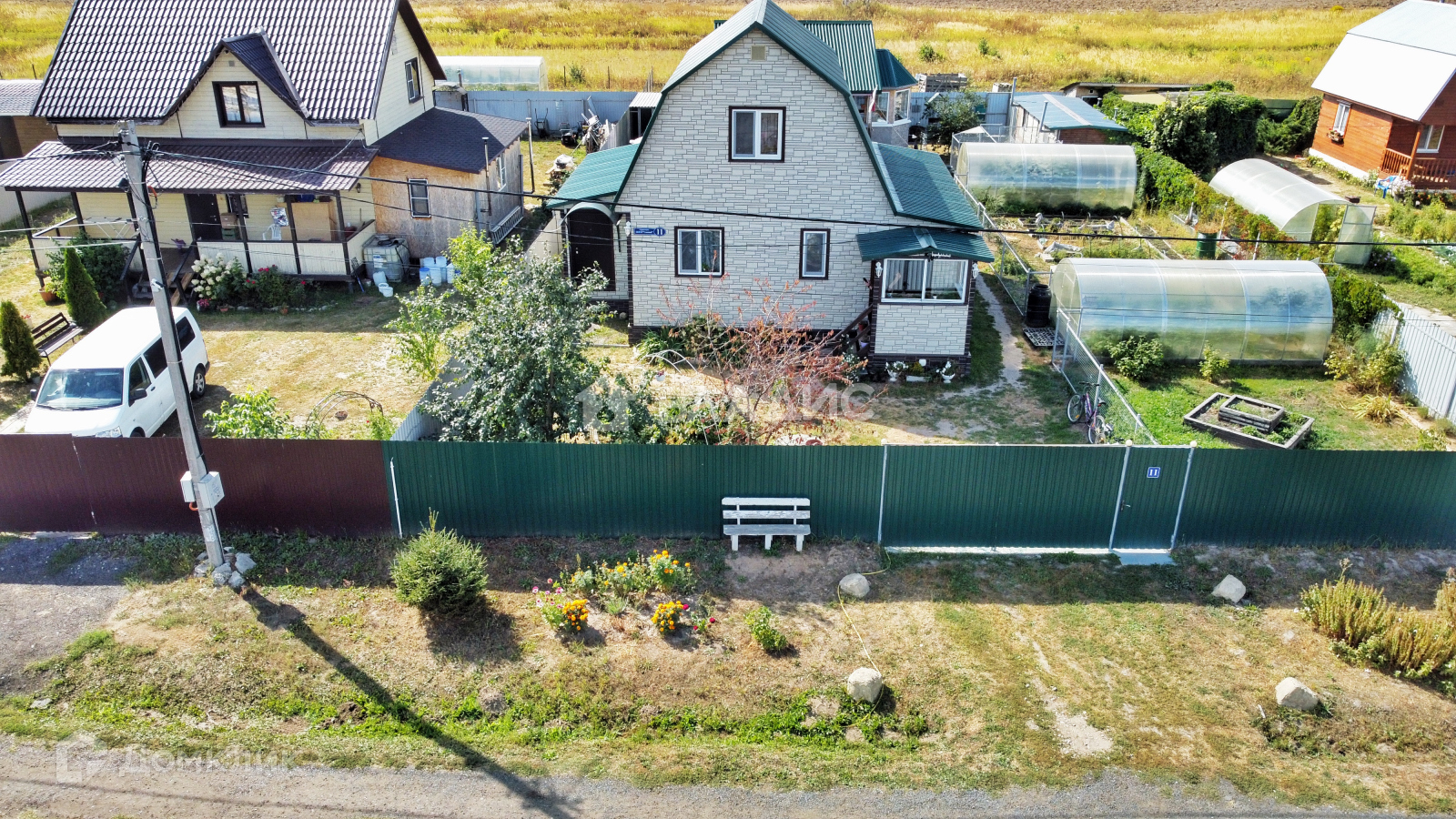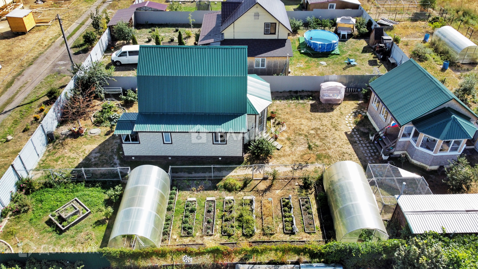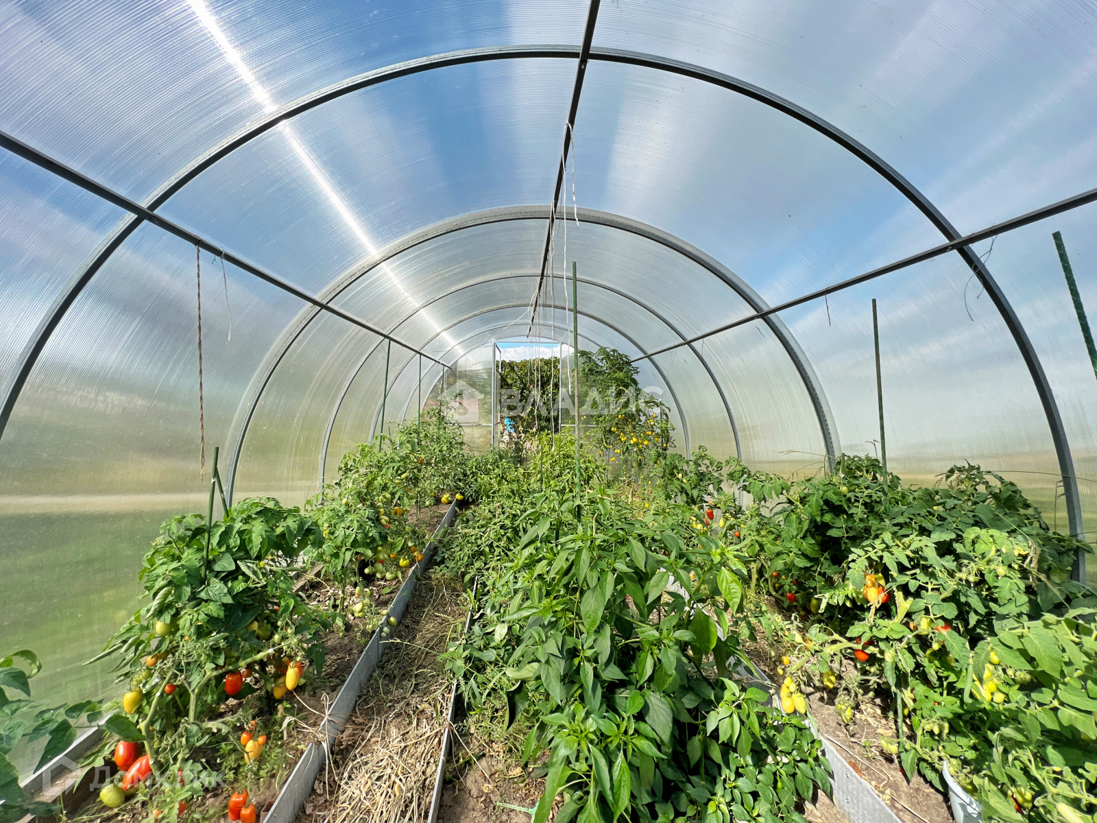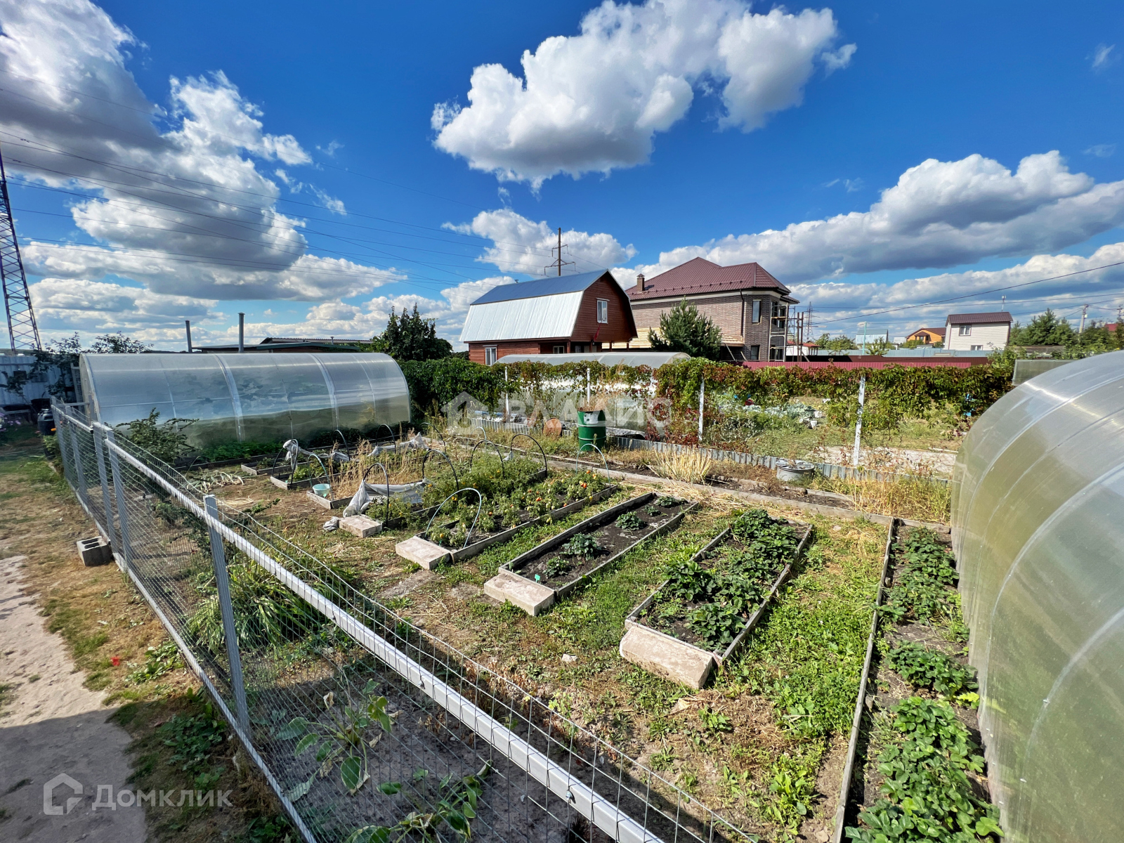 На участке есть 2 теплицы (6х2 основание кирпич), поднятые грядки, огород обнесен отдельным забором.