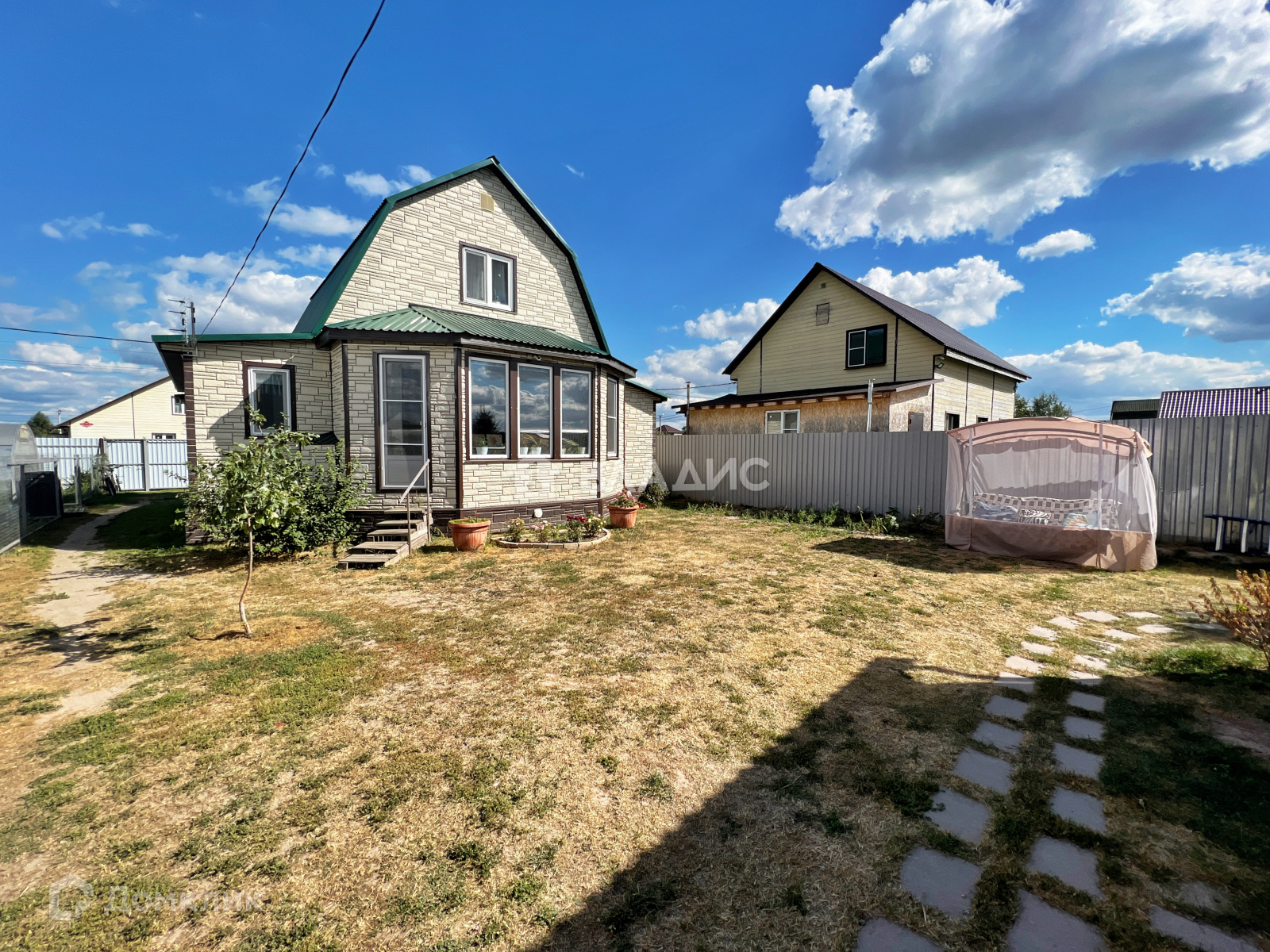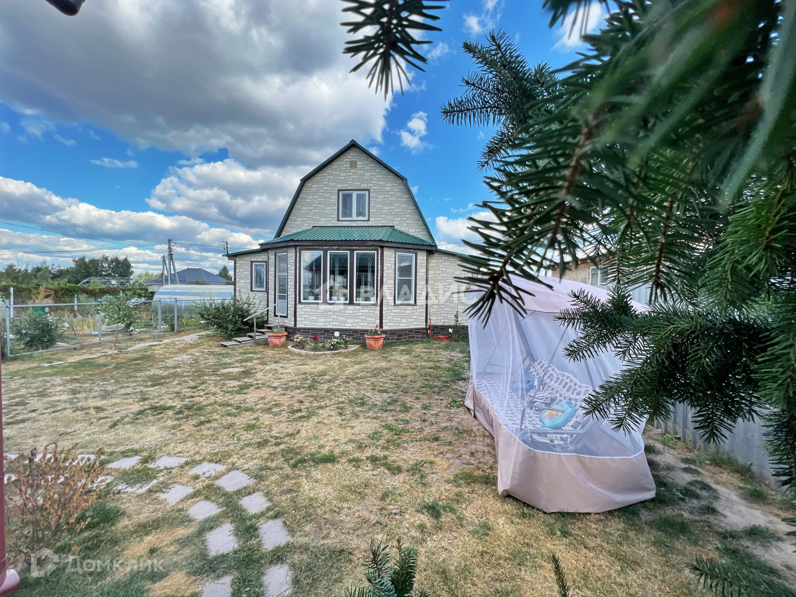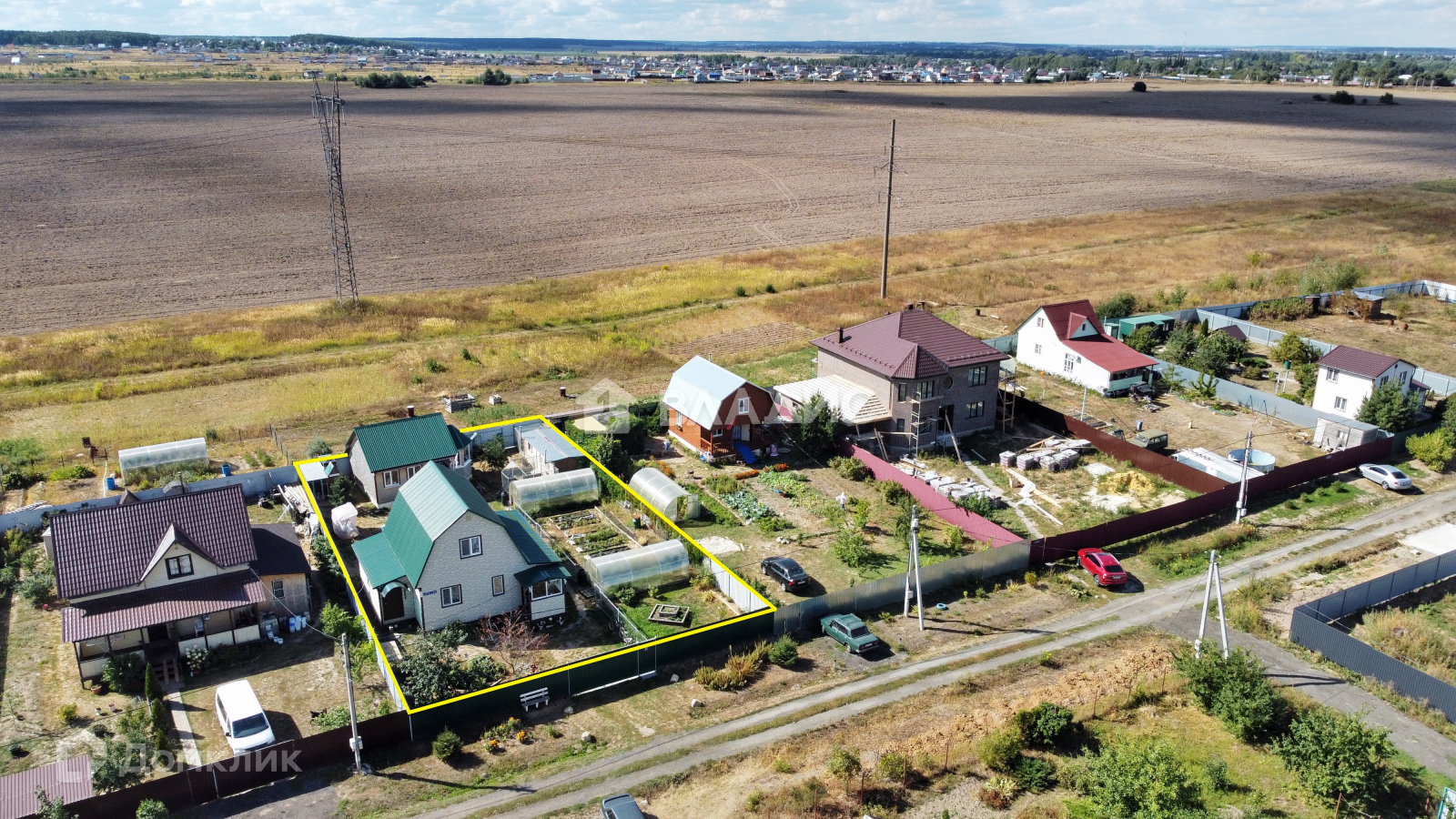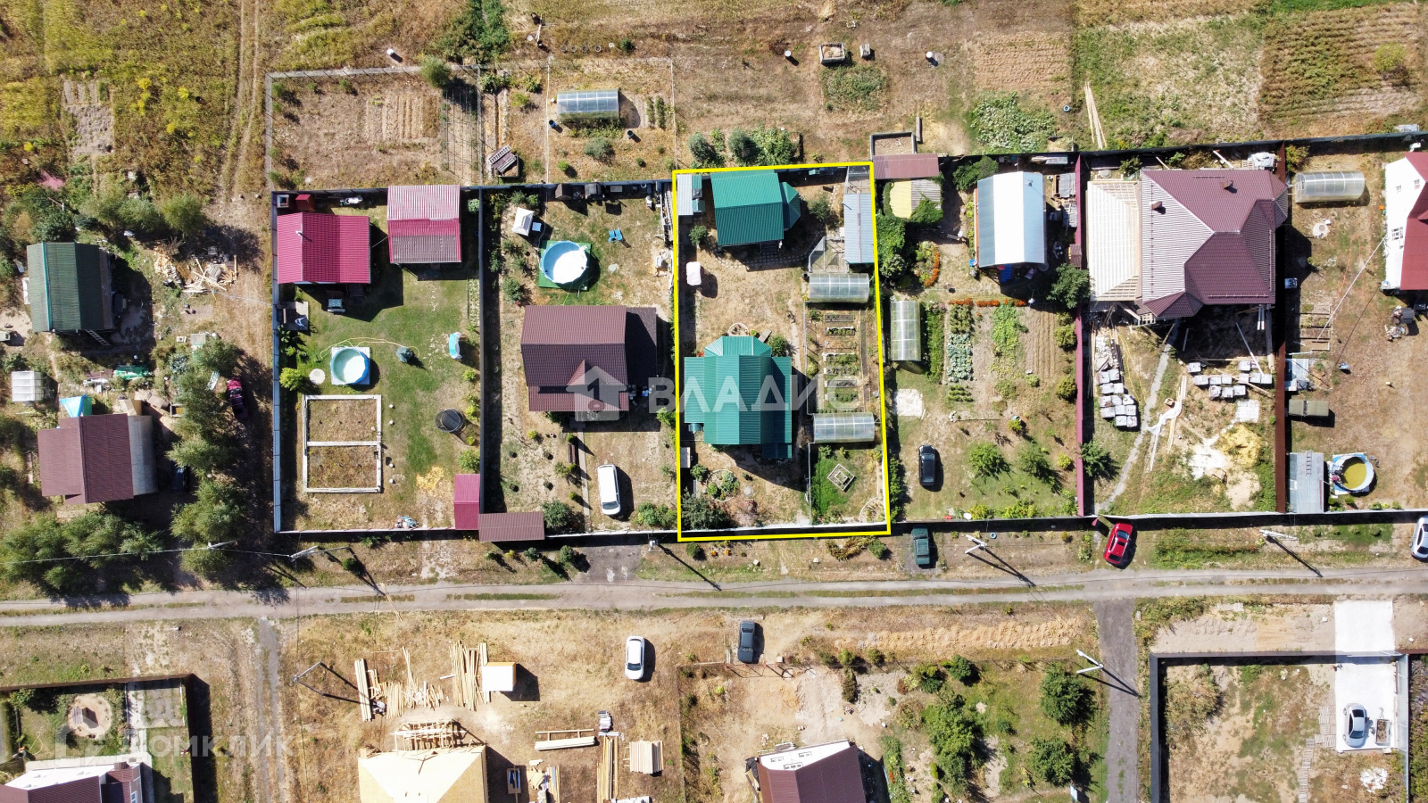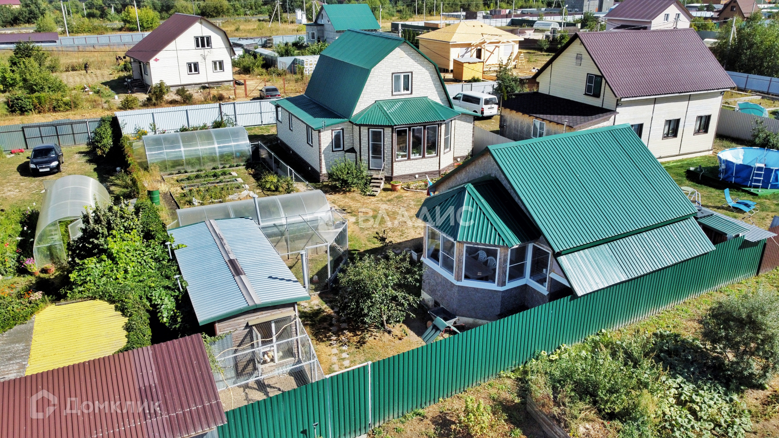 На участке есть 2 теплицы (6х2 основание кирпич), поднятые грядки, огород обнесен отдельным забором.