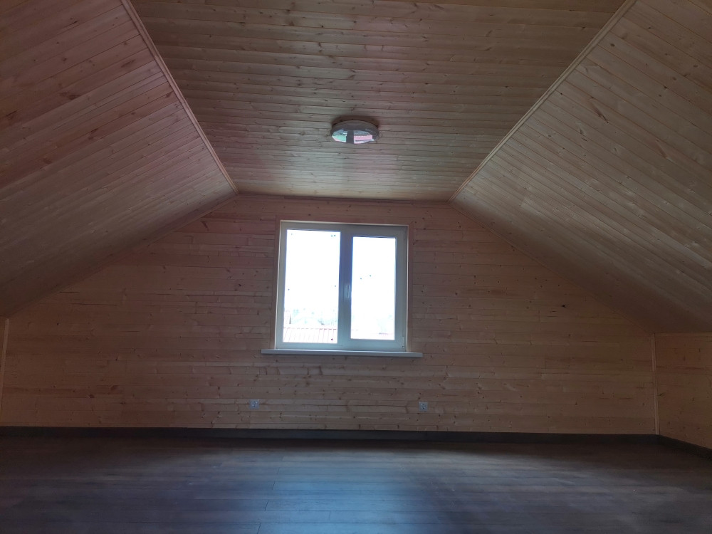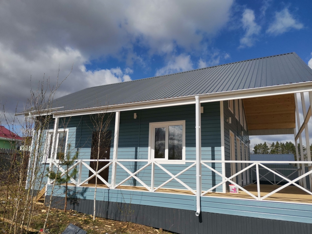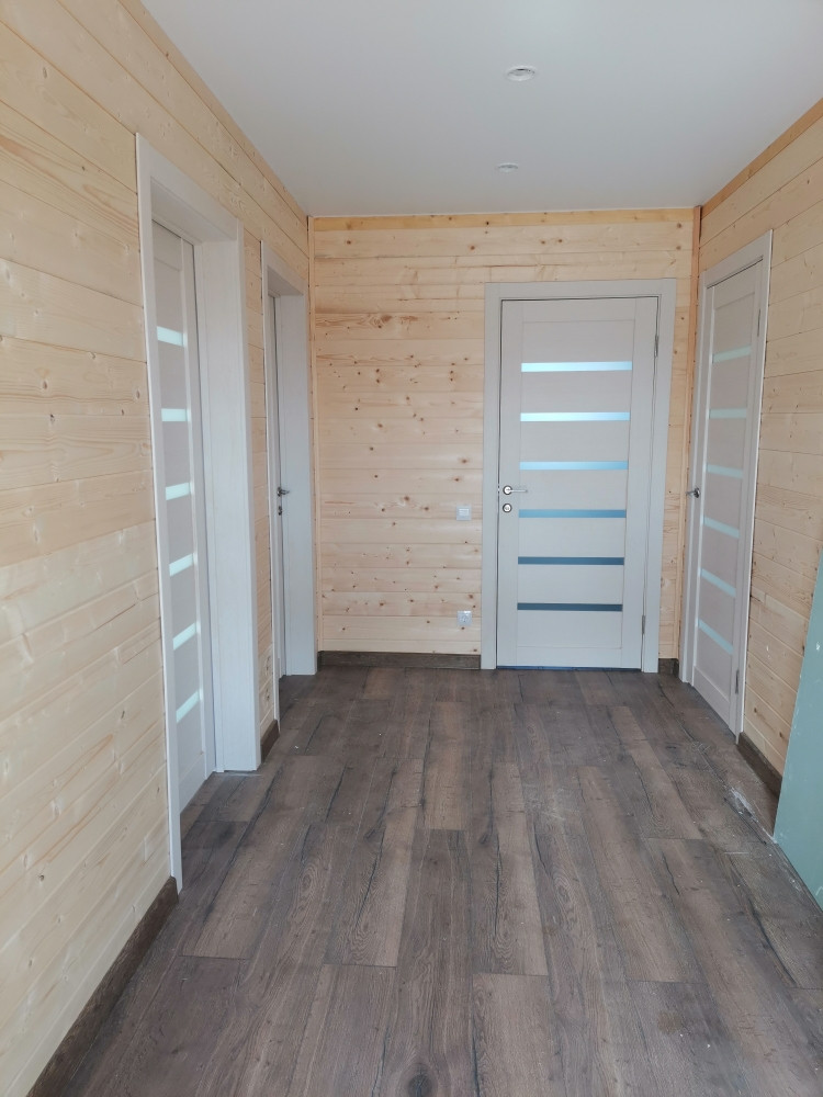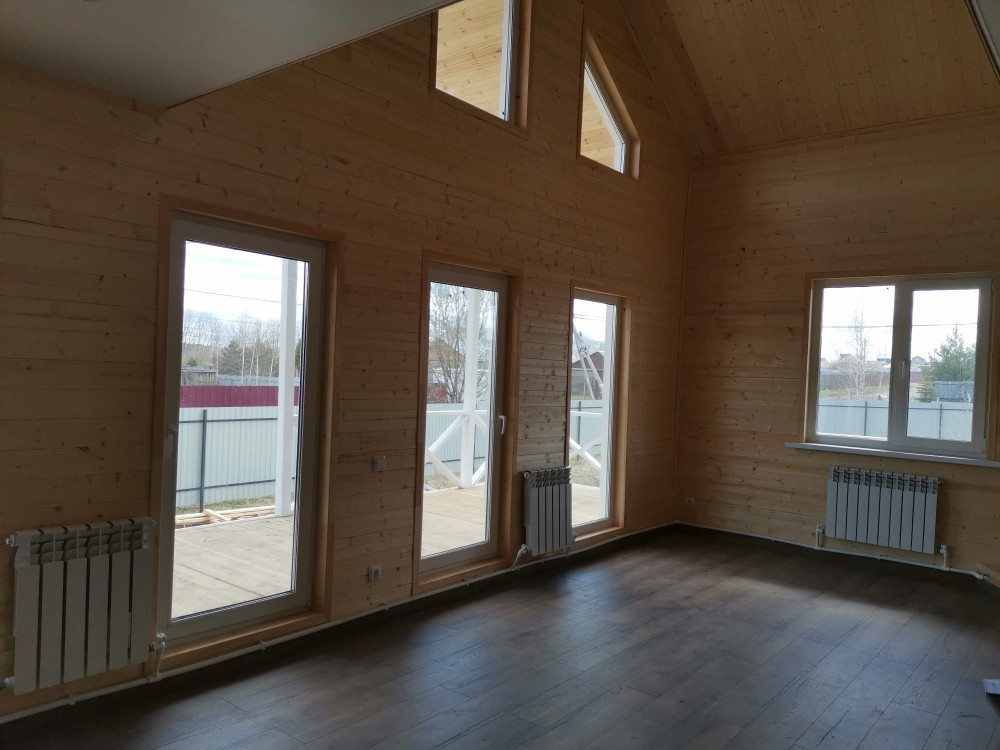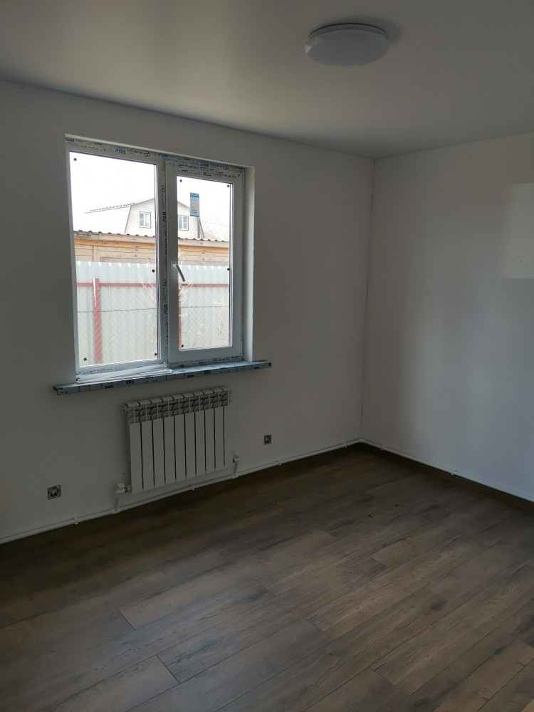 Дом каркасный на свайно-винтовом фундаменте, S-120кв.м. Утепление - мин.вата 150мм, электричество - 15кВт подключено и разведено по дому, отопление - электрокотел, вода - скважина, канализация - септик (2+2 кольца), идет газификация поселка. Современная планировка.  В доме полностью выполнена отделка: пол- ламина, натяжные потолки, межкомнатные двери, сантехника.