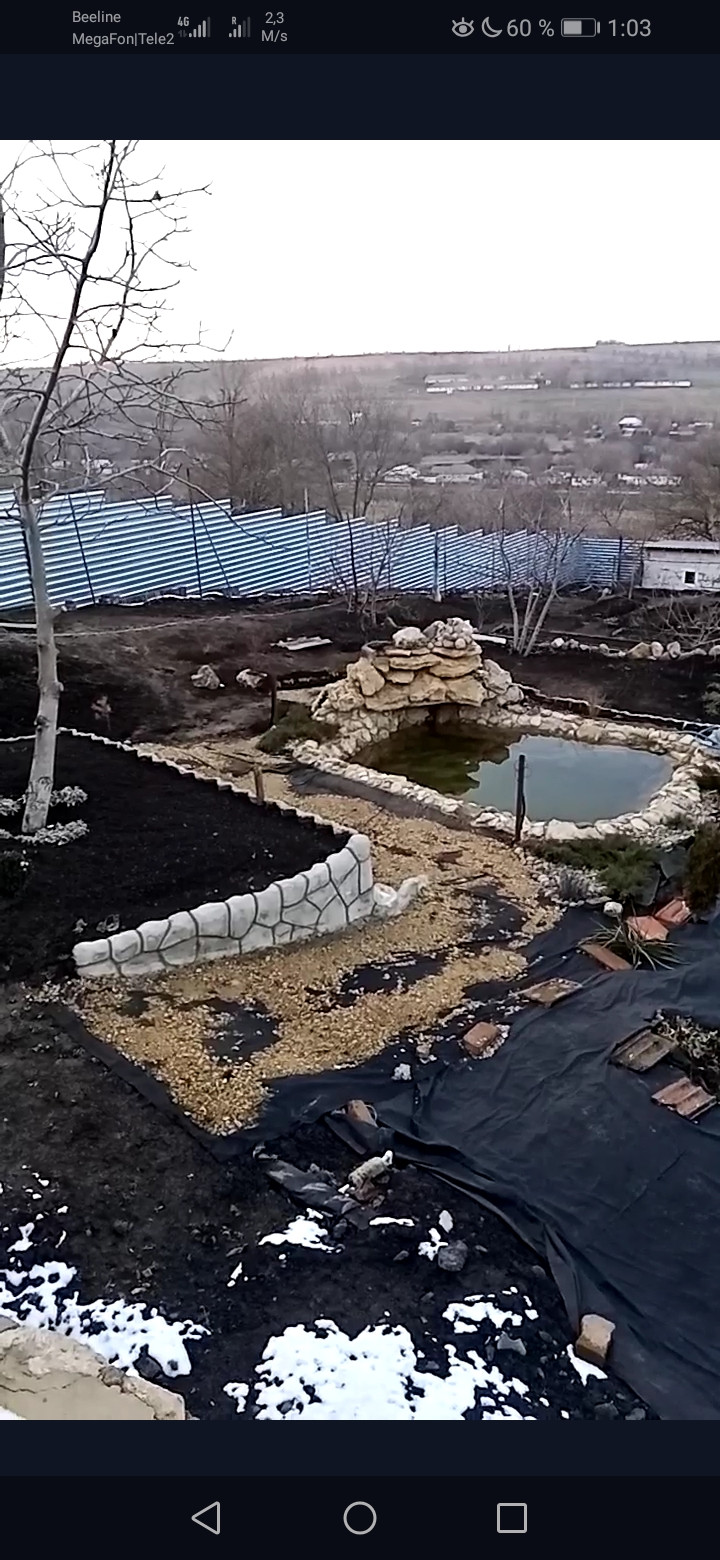 пруд с водопадом и рыбками,