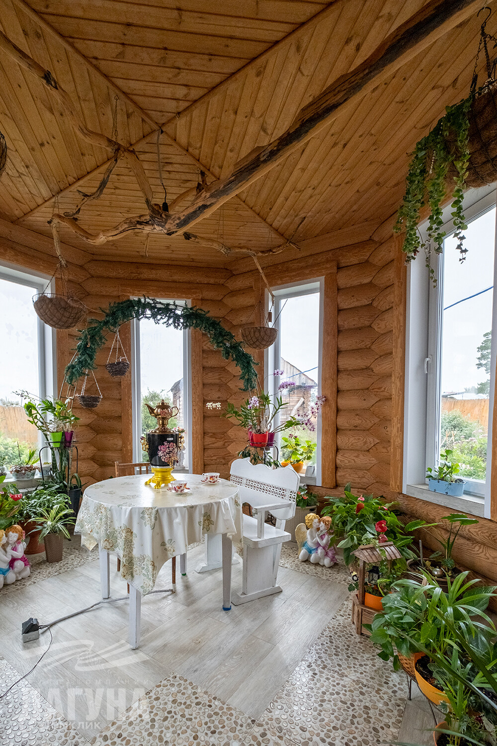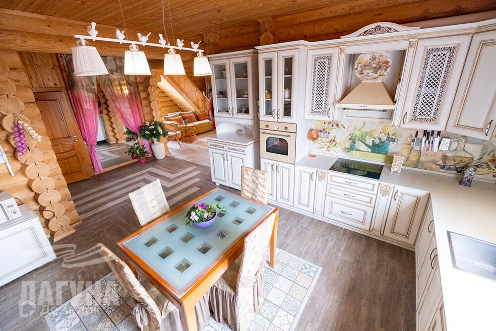 Для строительства дома использовался только зимний лес. Диаметр бревна - 24 см, утеплен двумя слоями джута (15 см), третий слой проконопачен также джутом. Сруб возведен с 1 мая по 1 июня, отопление запущено в октябре. Сруб ошлифован и обработан на 2 раза спец.средствами – СЕНЕЖ.