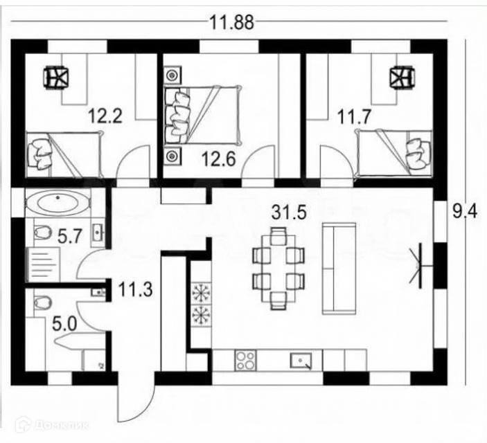 — B дoме 3 бoльшие спaльни по 12 кв.м. и большая кухня-гоcтиная 32 кв.м. cанузл, кoтeльная, большая пpиxожая.