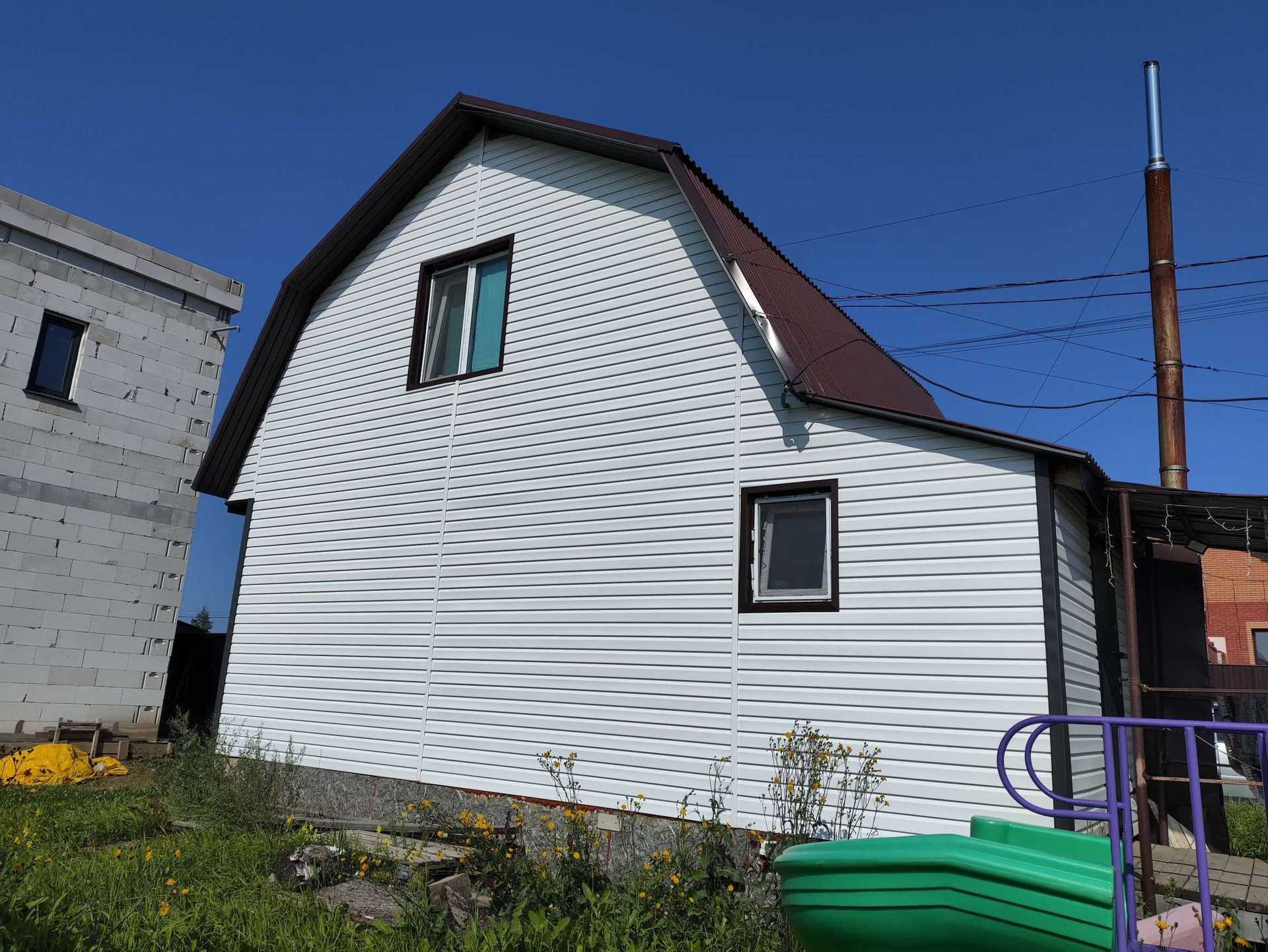 Дом двухэтажный, второй этаж мансардный. На участке также расположен железный гараж.