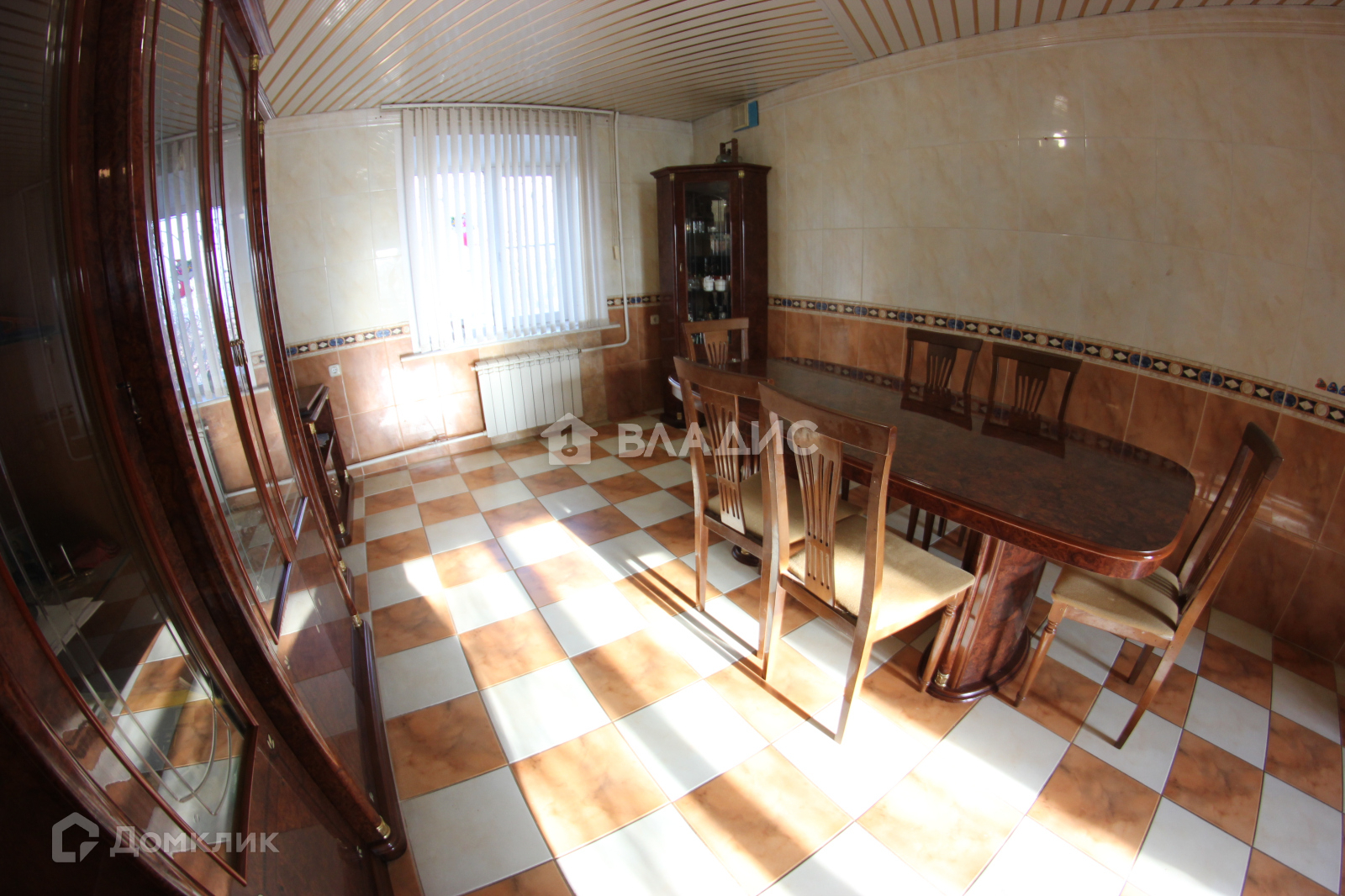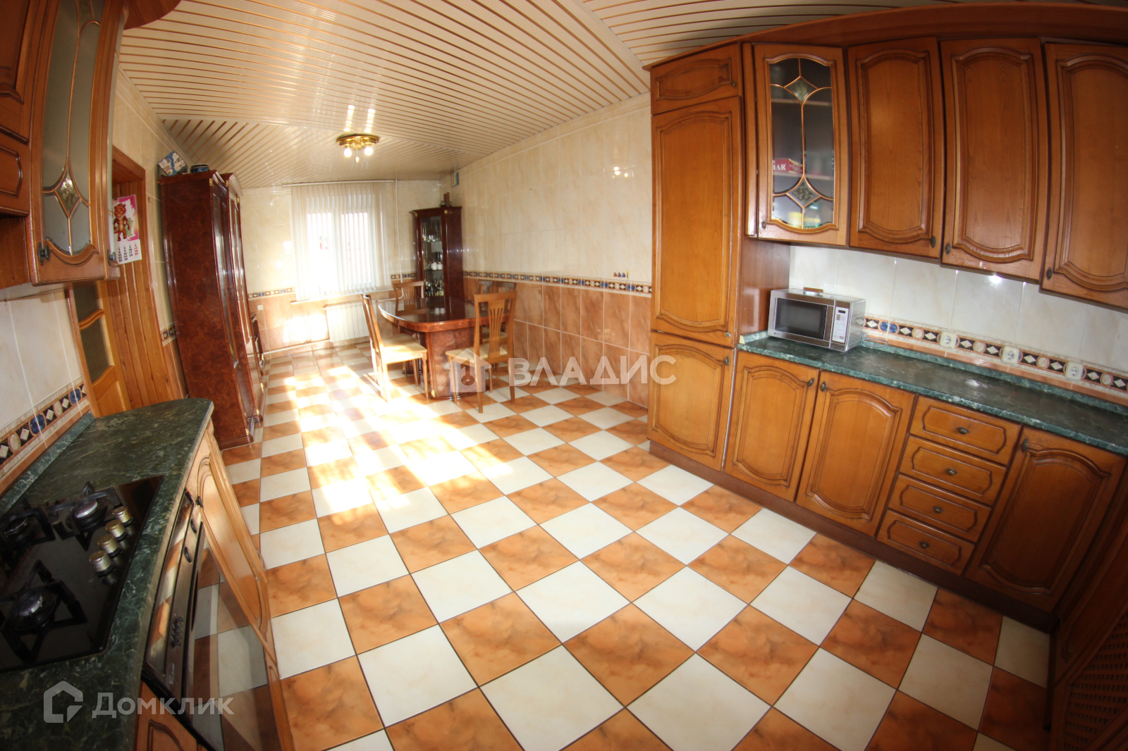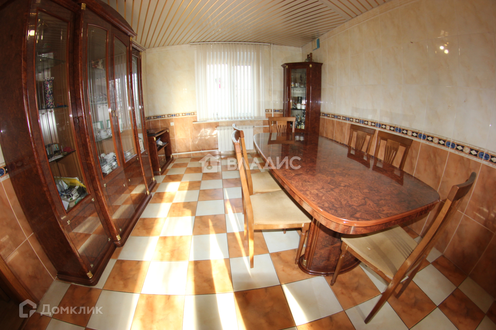 - Кухня-гостиная. Кухонный гарнитур из массива дуба пр-во Италия. Стол и шесть стульев, две витрины для посуды, комод, вся мебель пр-во Италия. Техника: холодильник, газовая духовка, газовая варочная панель, посудомойка.