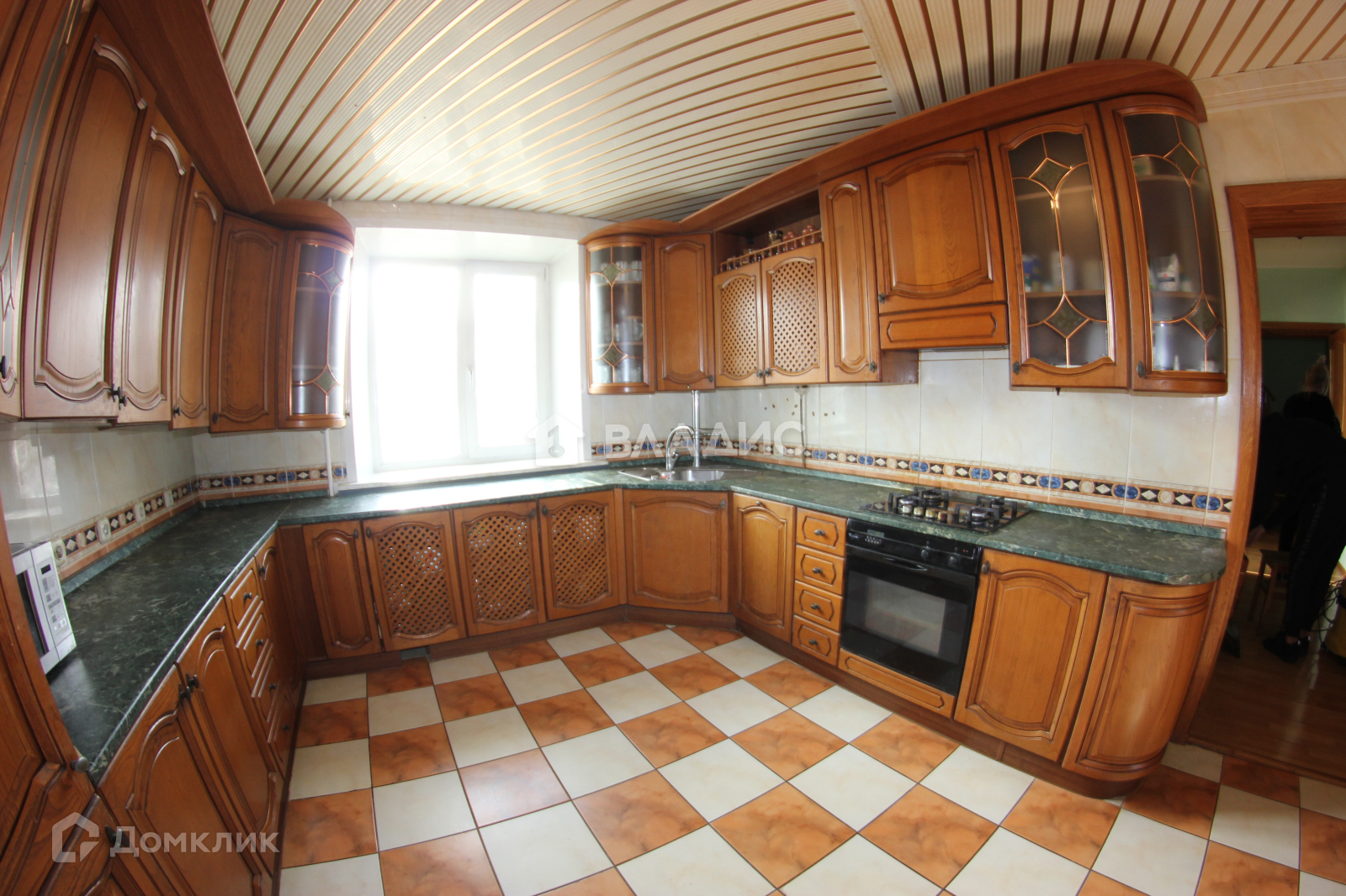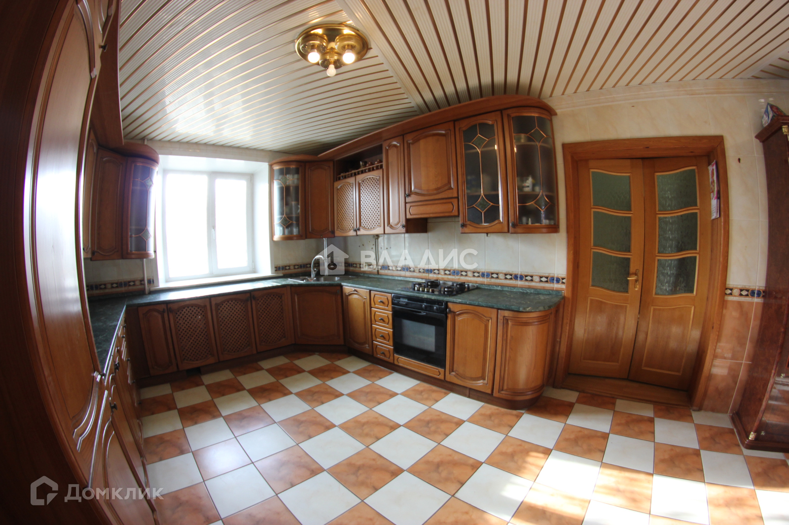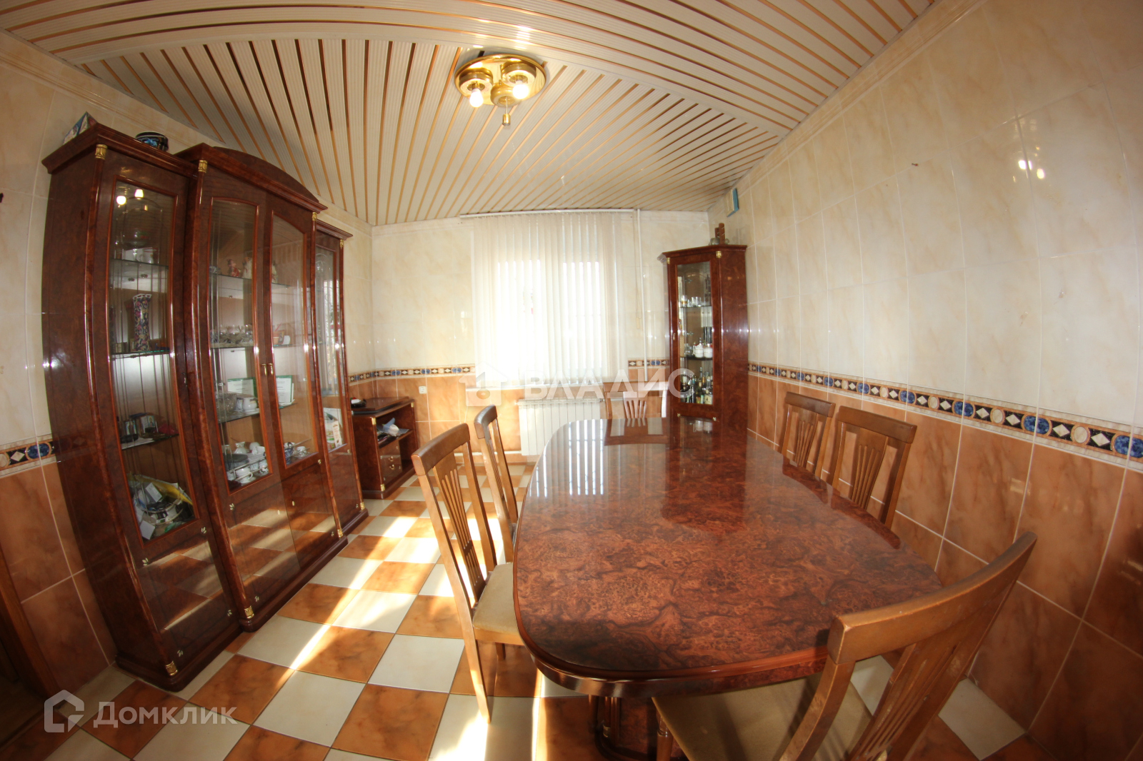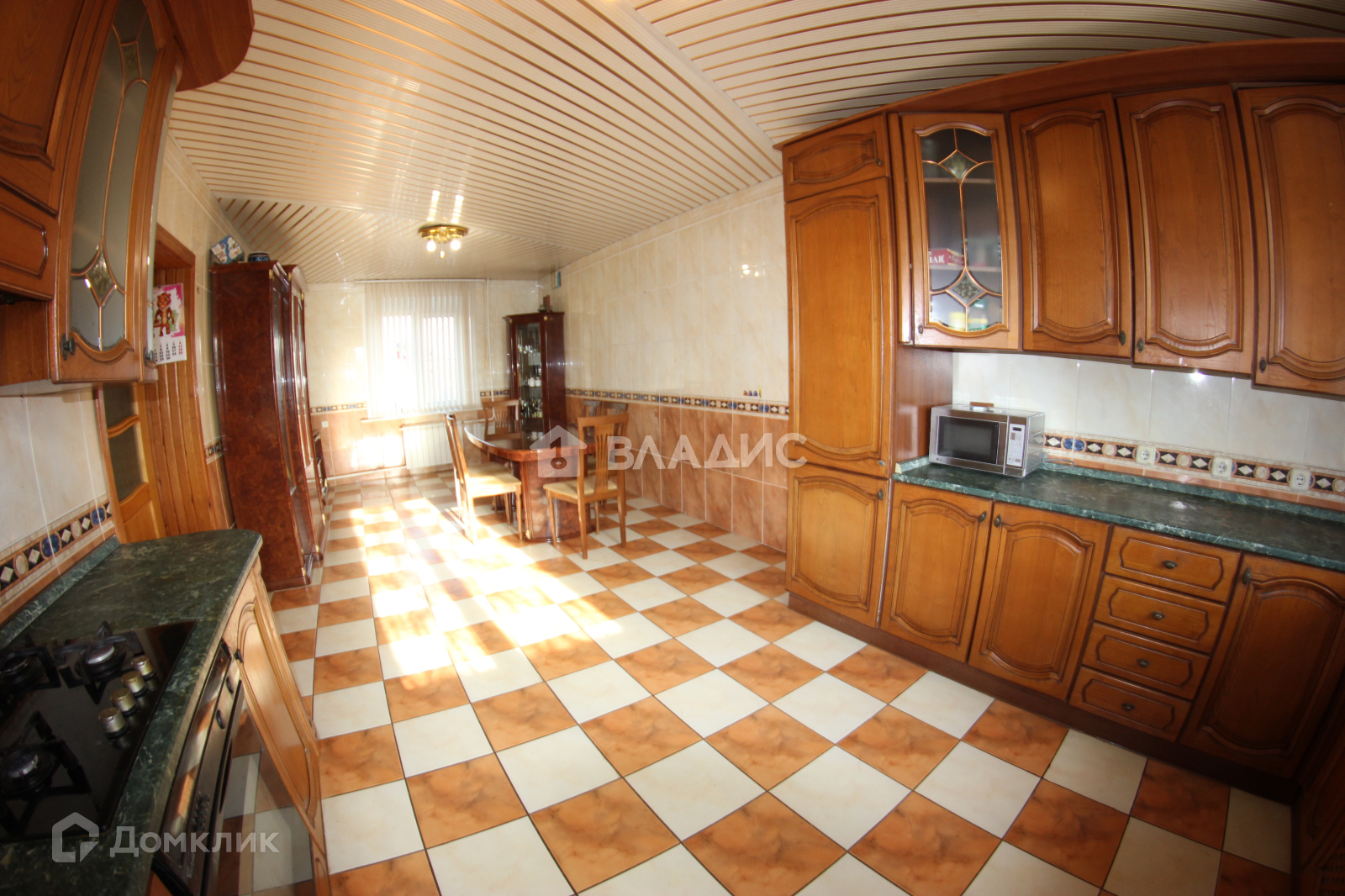 - Кухня-гостиная. Кухонный гарнитур из массива дуба пр-во Италия. Стол и шесть стульев, две витрины для посуды, комод, вся мебель пр-во Италия. Техника: холодильник, газовая духовка, газовая варочная панель, посудомойка.