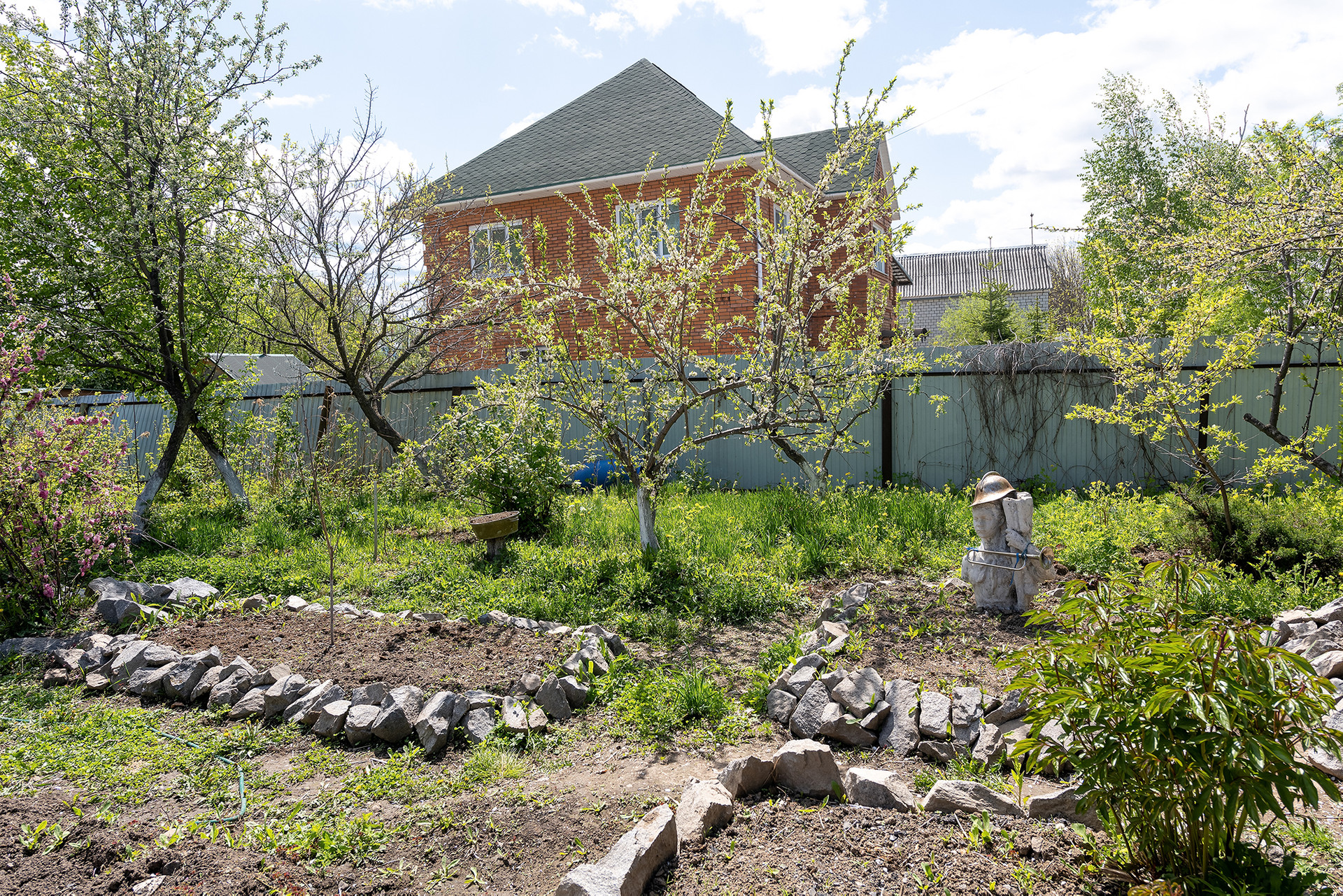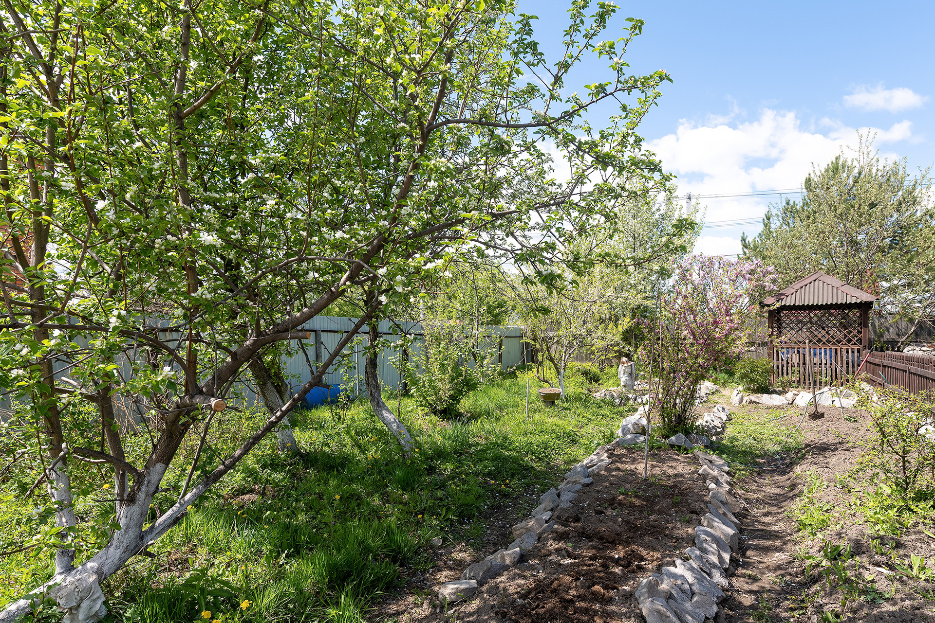На участке есть фруктовые деревья и ягоды: клубника, малина, вишня, жимолость, персики, абрикосы, сливы, кишмиш, смородина, виноград, лимонник и др.