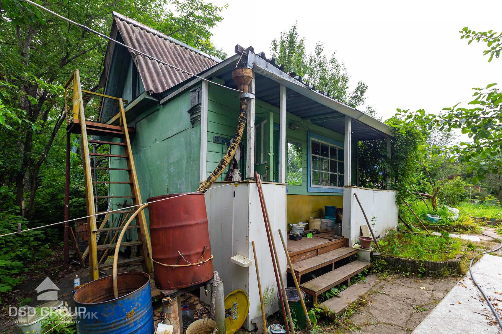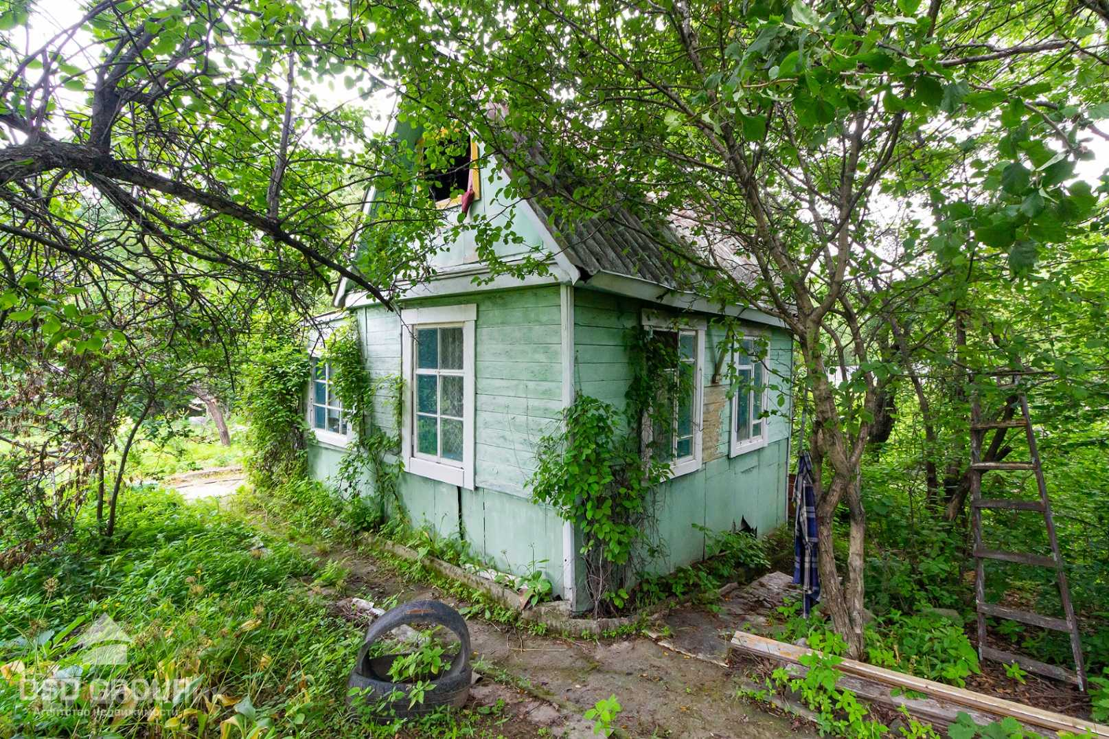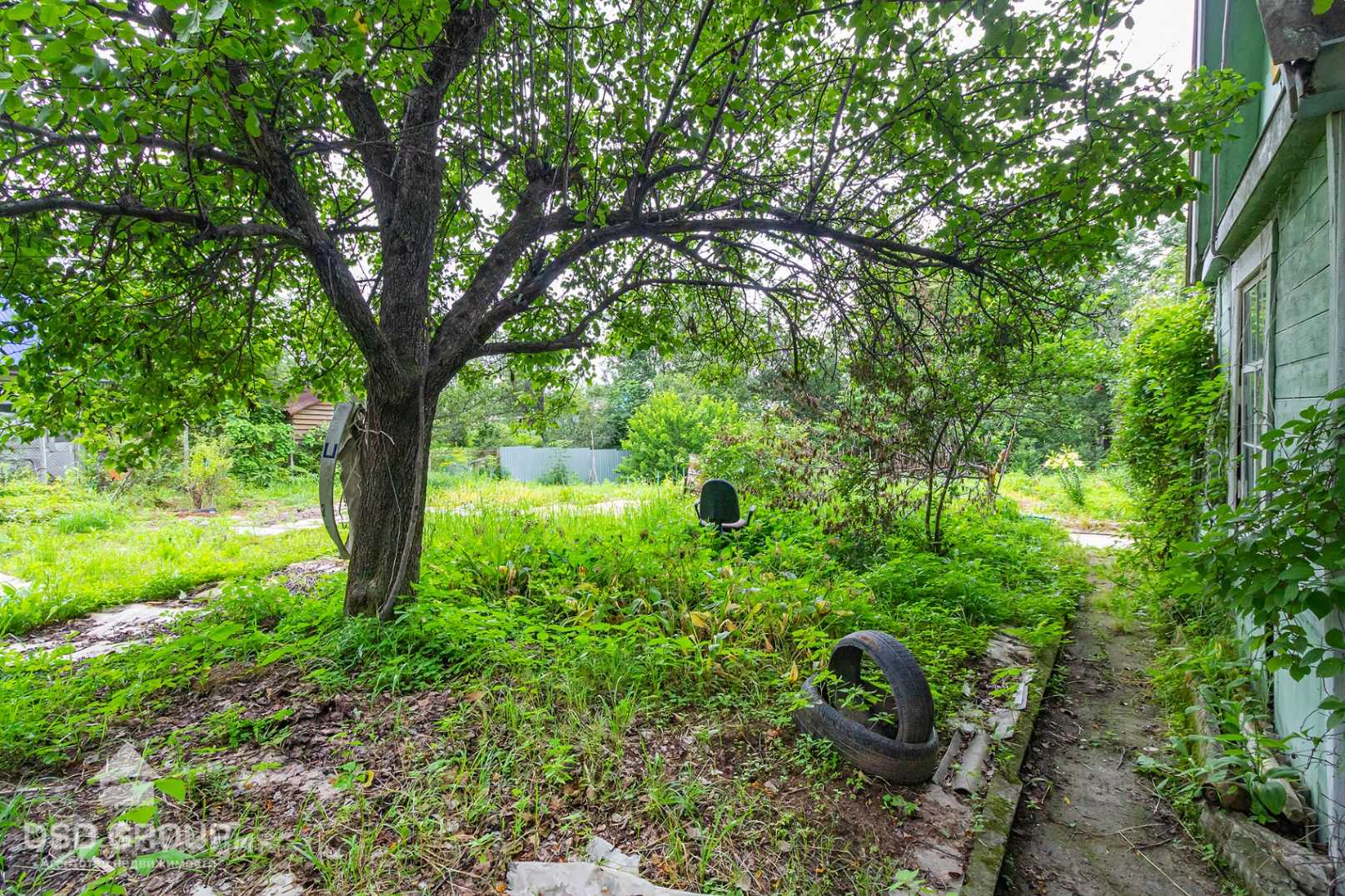 На участке есть дачный домик из бруса с мансардой, а также баня.
