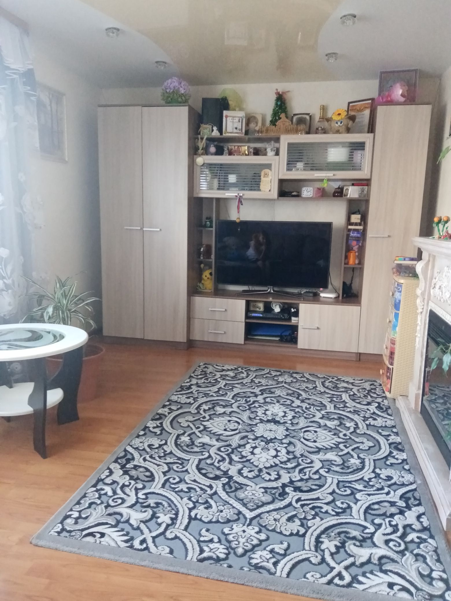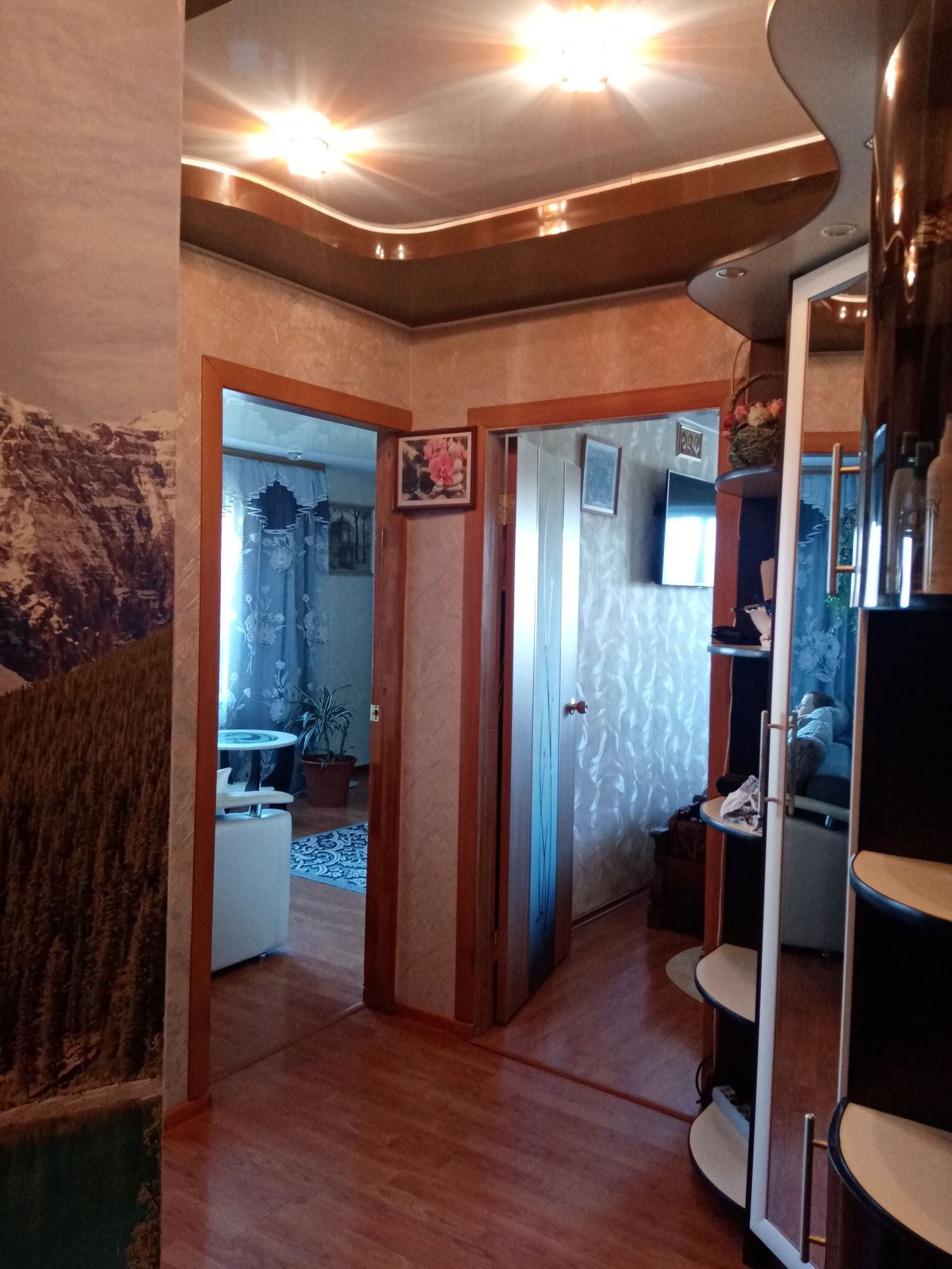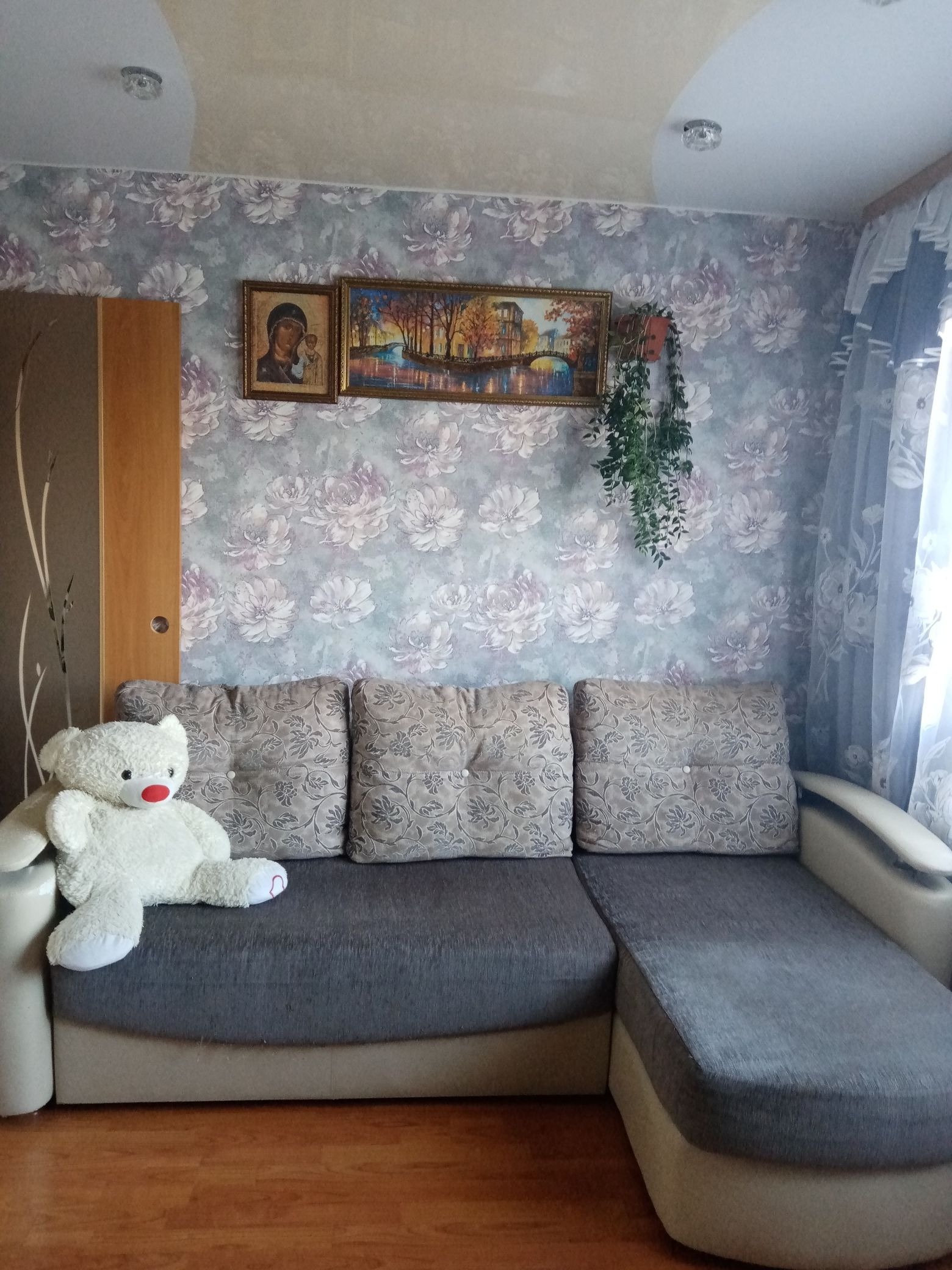 Потолки натянуты во всех комнатах и кухне. Санузел раздельный, недавно делался ремонт, на полу плитка, стены панели. Кухонный гарнитур остаётся, в остальном можно договориться.