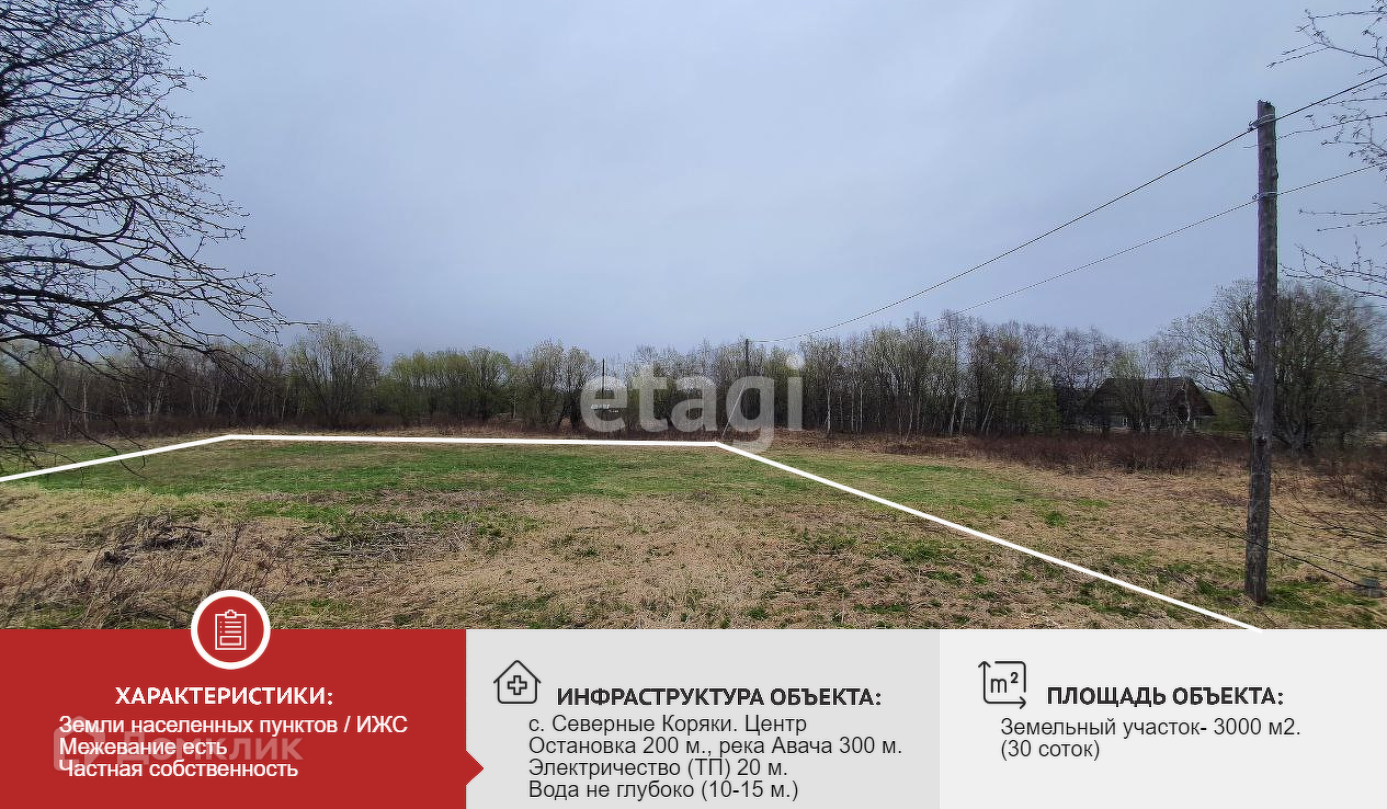 Продается недорогой просторный земельный участок площадью 30 соток в самом центре села Северные Коряки. Участок ровный, прямоугольной формы, в собственности, отмежеван, не испорчен никакими постройками. Отличный вариант для тех, кто хочет построить с чистого листа свое загородное имение в экологически чистом районе. К преимуществам данного участка можно добавить еще несколько моментов, это- удобство подъезда к нему, близость линии электропередачи, неглубокое залегание водоносного слоя, автобусная остановка 200 метров, река Авача 300 метров. Не упустите это привлекательное предложение.