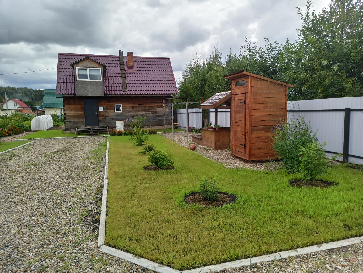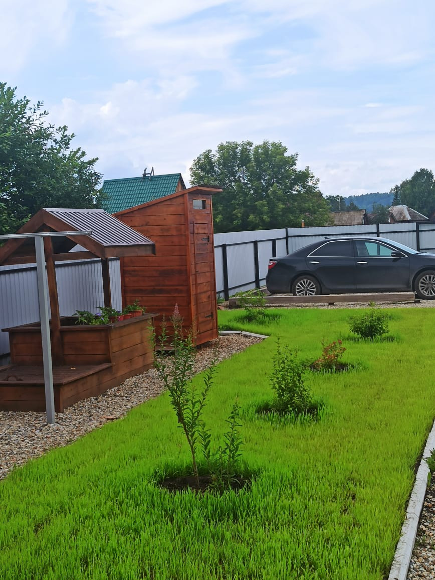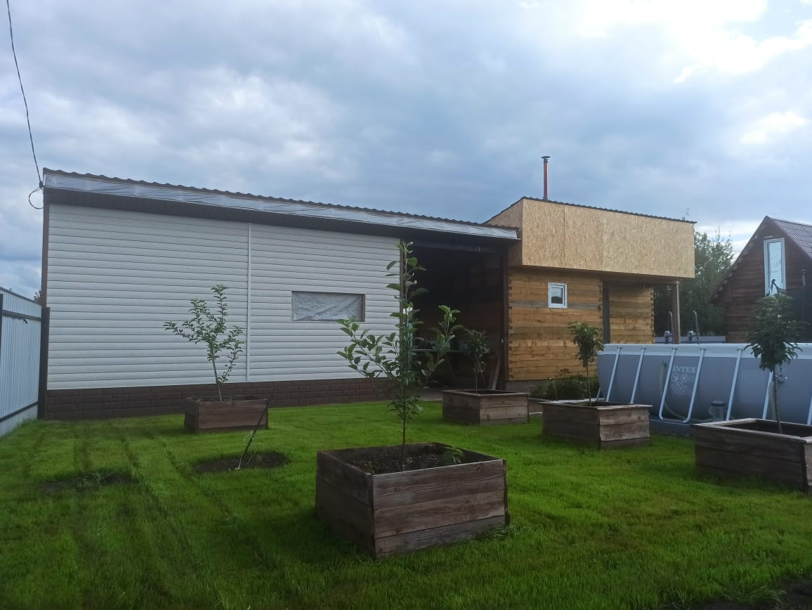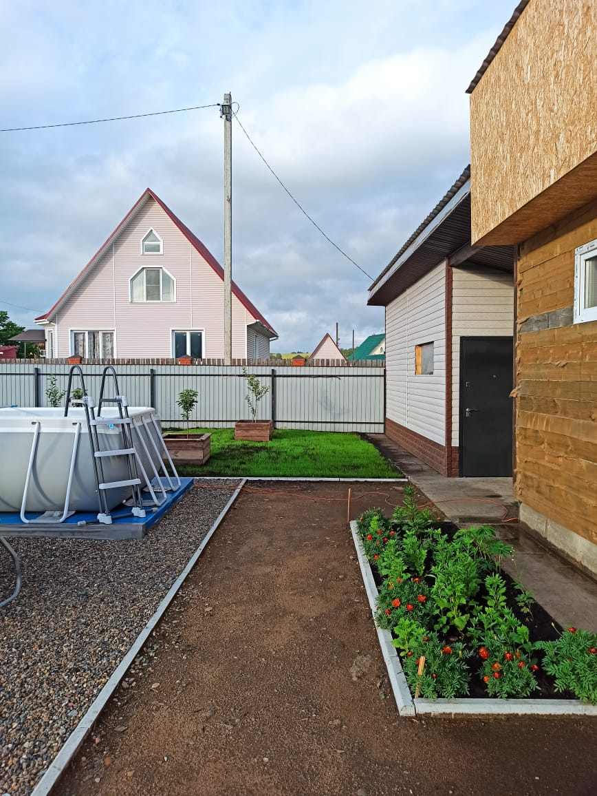 Вся свободная земля засеяна газоном. Выделены зона барбекю, подиум под установку бассейна, начато строительство детской площадки.