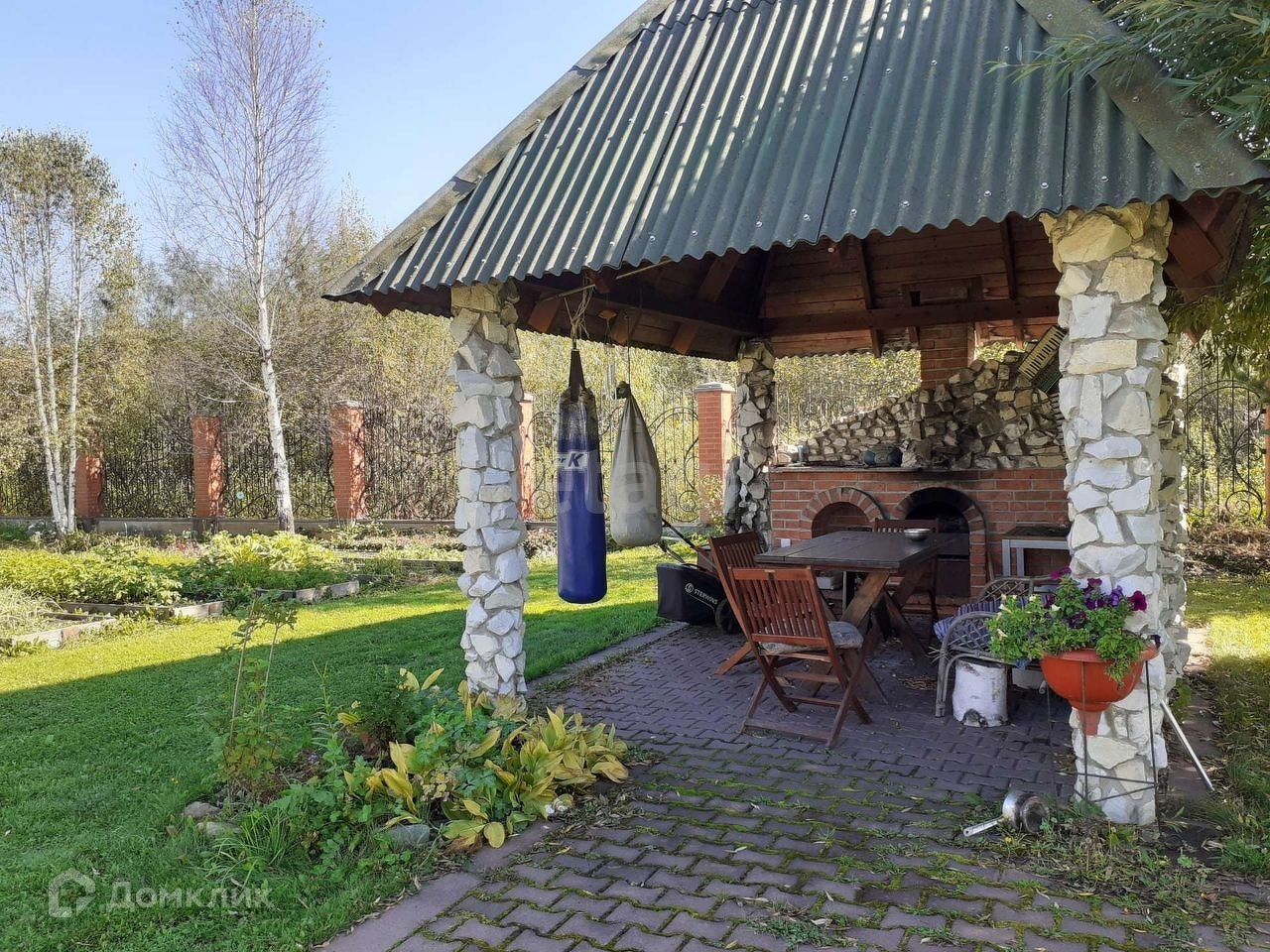 На территории рядом с домом открытая беседка барбекю с кровлей на каменных столбах.
