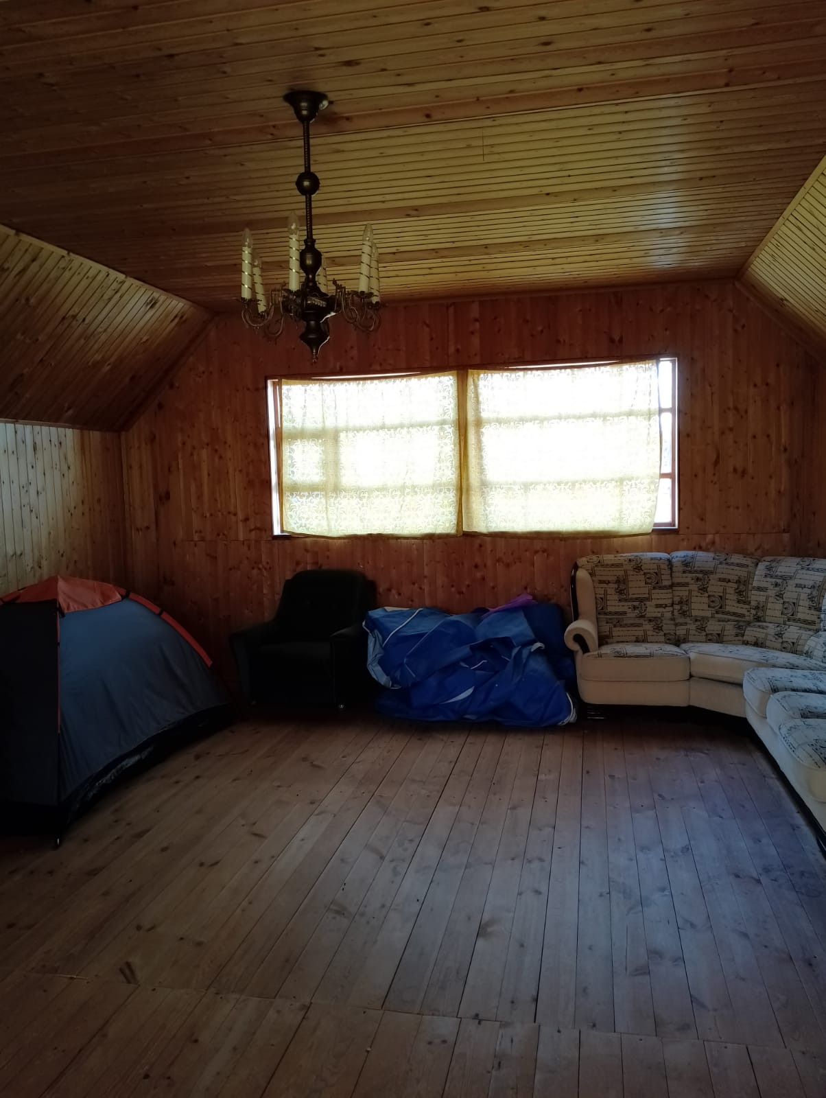 Двухэтажный дом + цокольный этаж с гаражом и вспомогательными помещениями.  Материал стен дома: доска, каркас: брус, фундамент - бетон. Сам дом стоит на бревне.  2 этажа: 1 этаж: 3 комнаты со спальными местами, веранда; 2 этаж: большая  мансарда с кладовыми помещениями.  Отопление: масляные обогреватели.