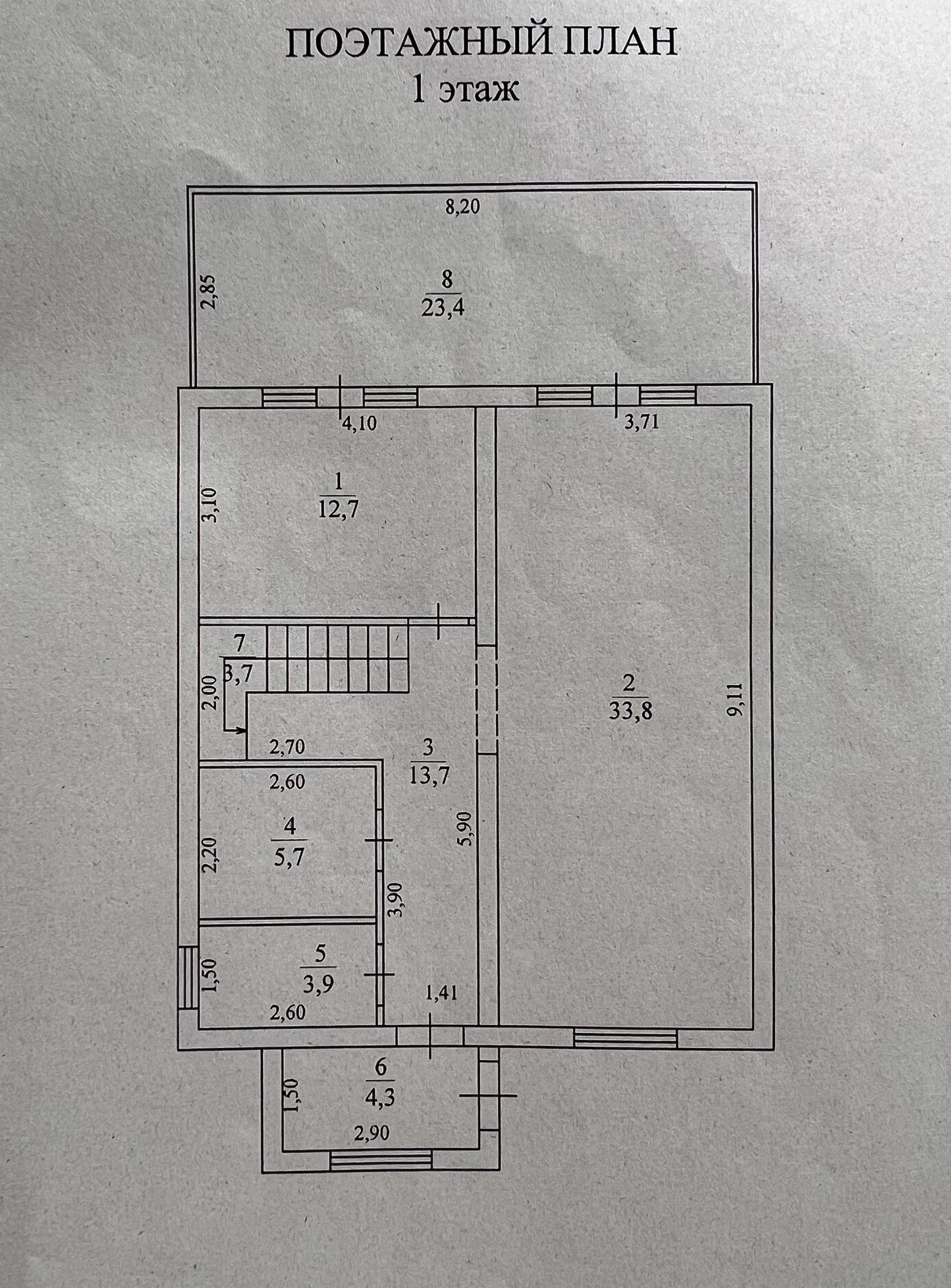 1 этаж - Просторная кухня-гостиная (33,8 кв.м.) с выходом на террасу (23,4 кв.м.), 1 спальня (12,7 кв.м.), бойлерная (3,9 кв.м.), сан. узел (5,7 кв.м.), прихожая (4,3 кв.м.);