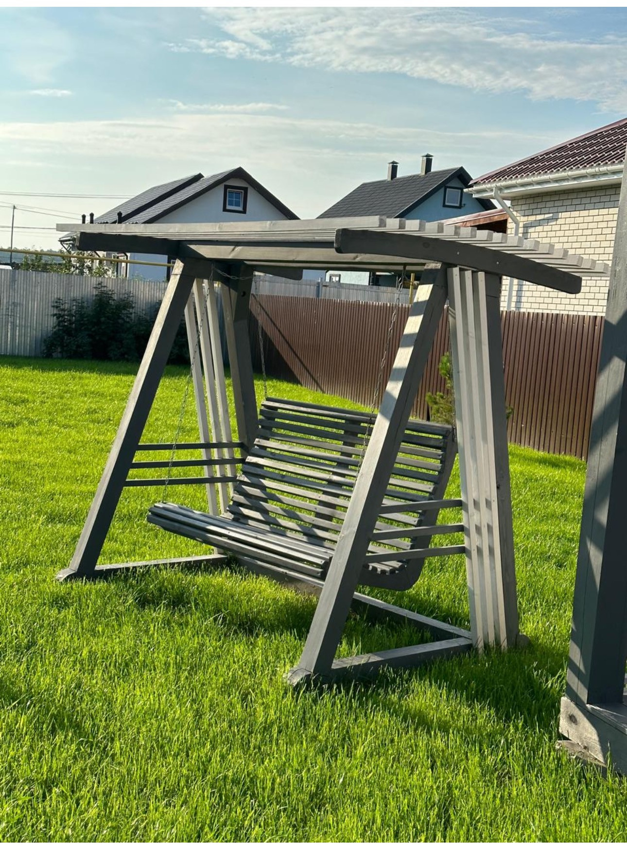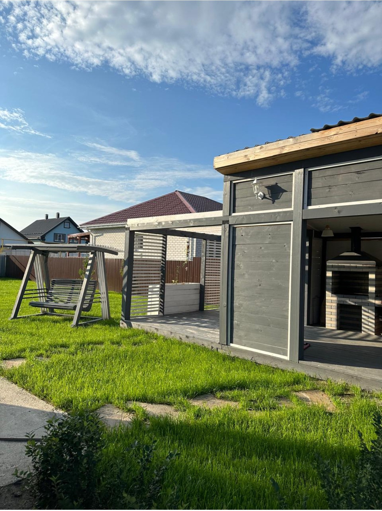 Беседка состоит из двух частей: закрытая с мангалом и открытая. Стол для большой компании и две скамьи.