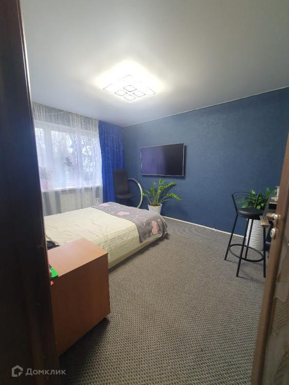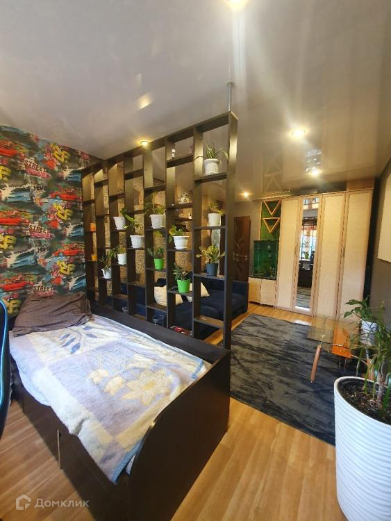 Комната разделена перегородкой, что позволяет функционально использовать пространство.