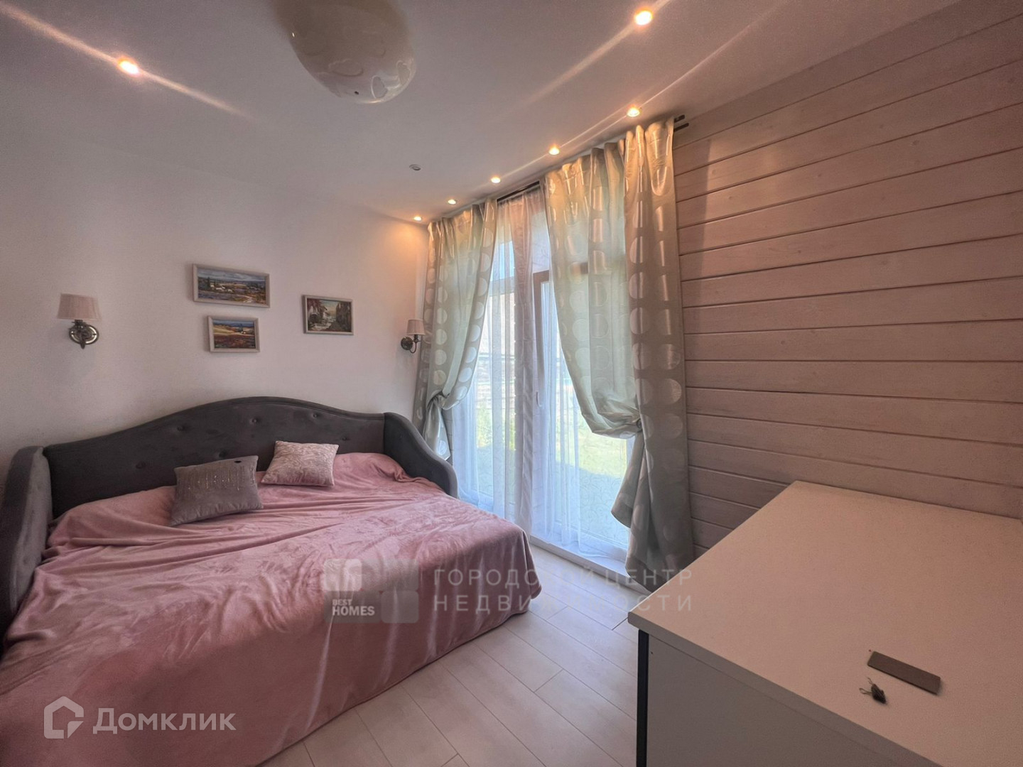 Есть кухня, совмещенная с гостиной, два санузла, спальня с детской зоной.