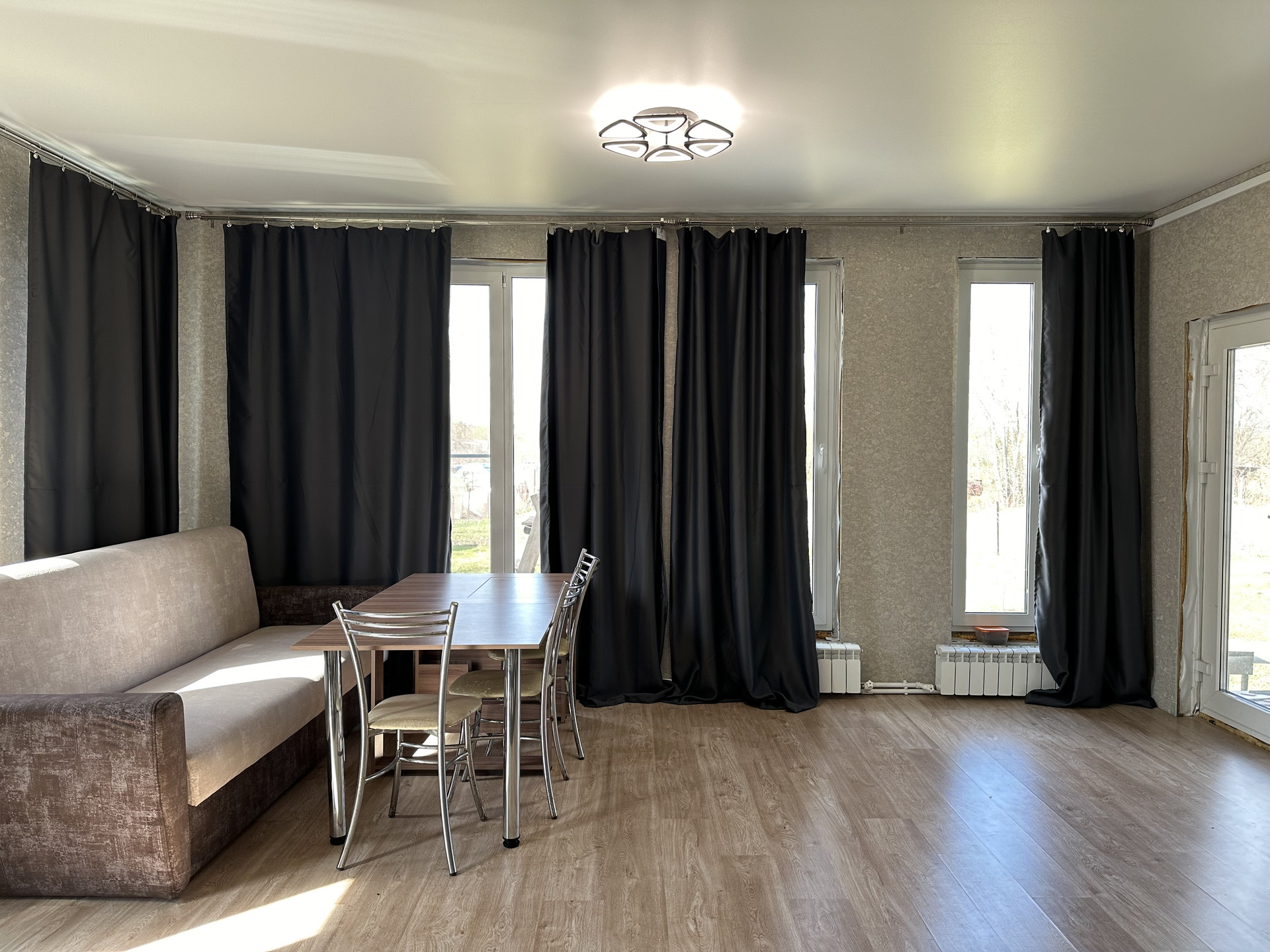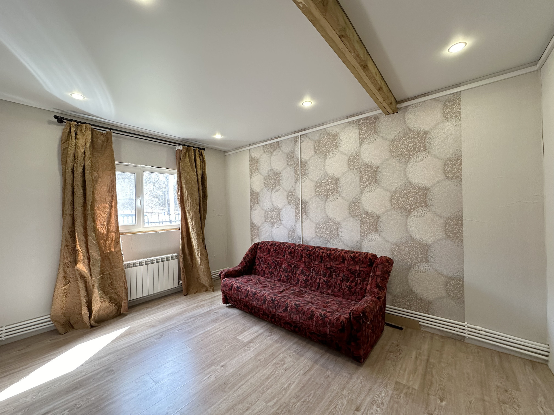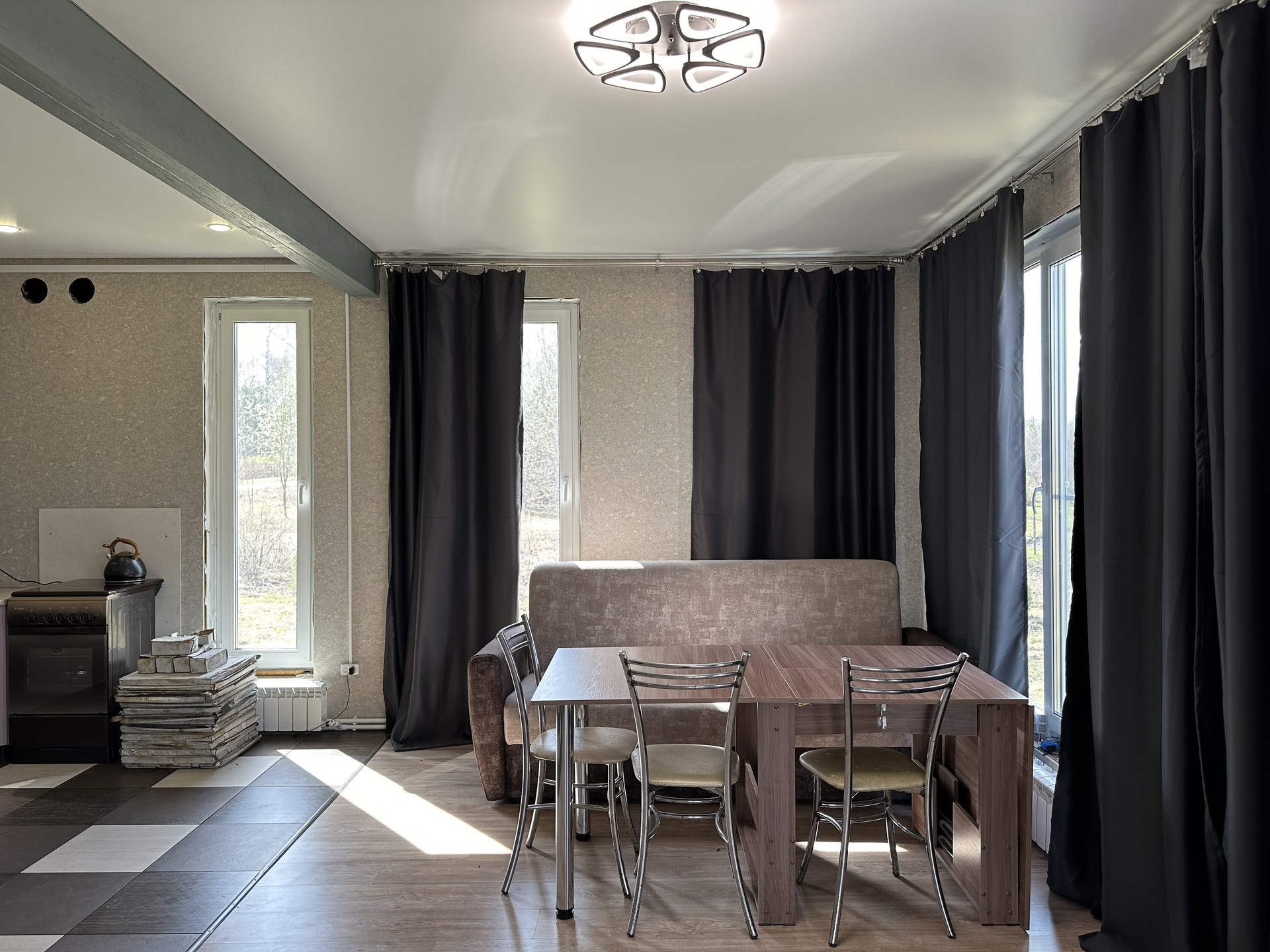 3 отдельных спальни: 17+15+13 кв.м.; кухня-гостиная около 38 кв.м. с выходом на веранду, санузел, гардеробная, тамбур и коридор. Вся мебель и техника остаются в подарок новым хозяевам.