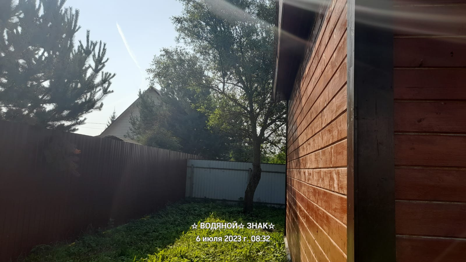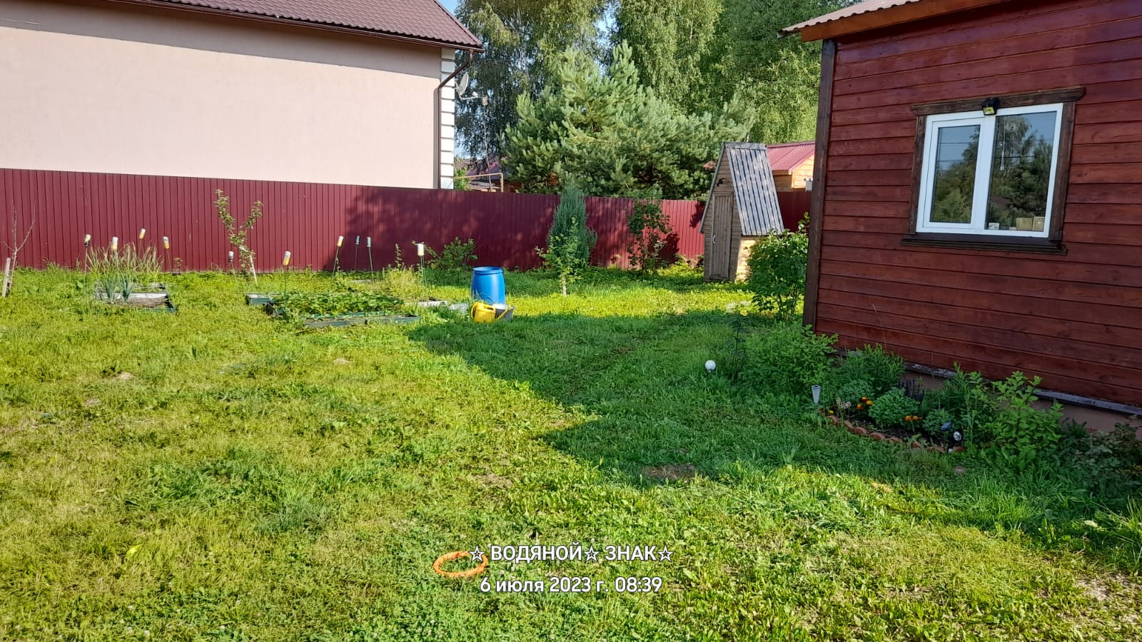 На участке имеются растения – малина, смородина (красная, черная, белая), яблони, сирень, можжевельник.