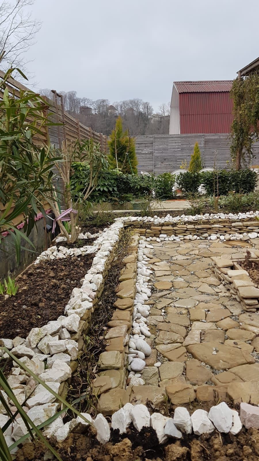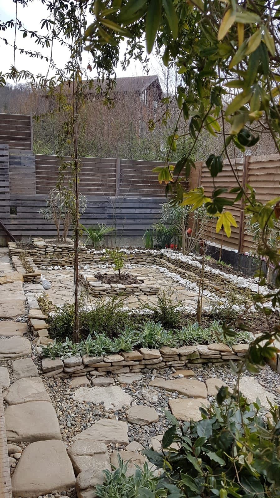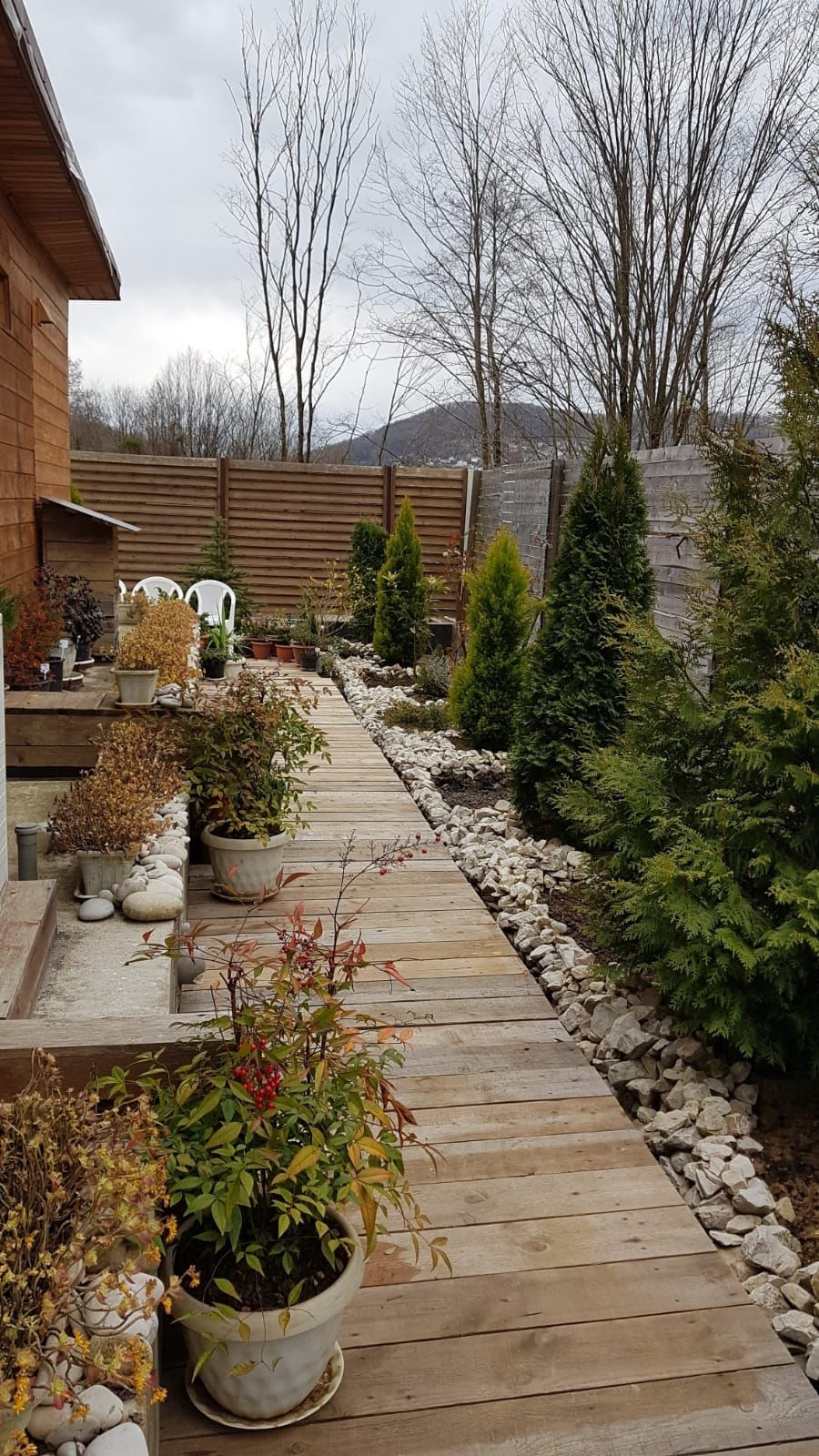 Живописный сад по всему периметру участка с красивыми ёлками и растениями.