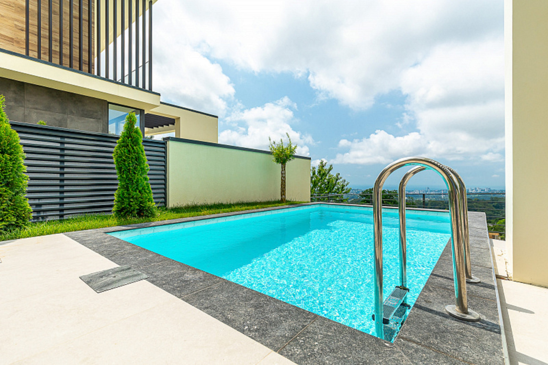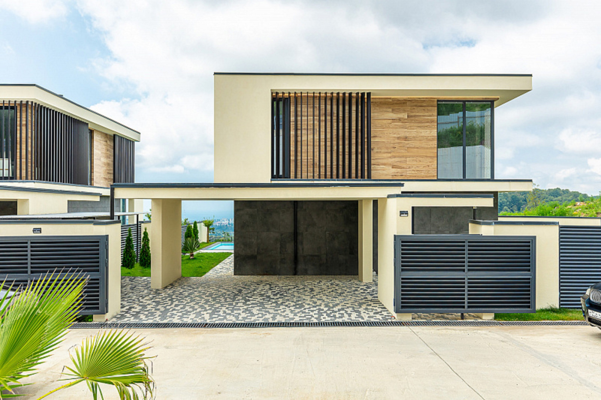 Вилла расположена в закрытом коттеджном посёлке.Территория просторная, на ней есть зона для отдыха -Патио, открытый бассейн с лаунж зоной, а так же крытый придомовой паркинг.