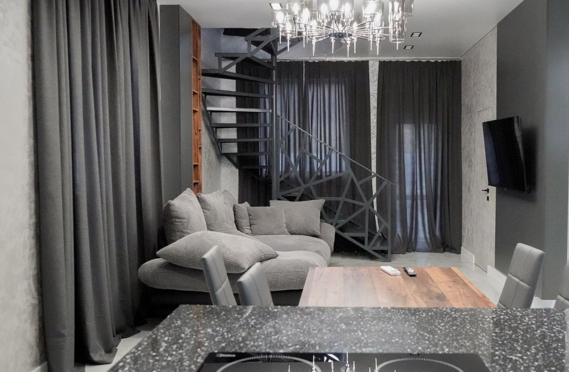 Два этажа, на первом этаже гостиная совмещенная со столовой зоной, гостевая комната, санузел.