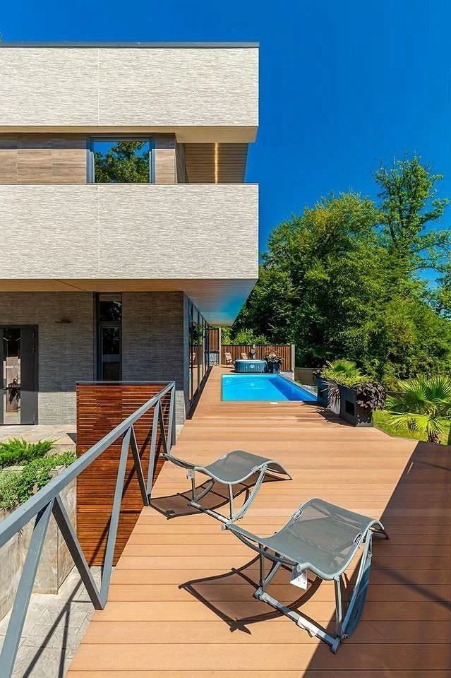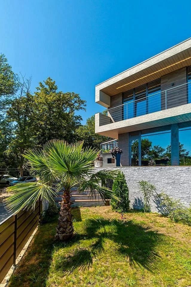 Фасад выполнен из японских само-моющих панелей. Панорамные окна, ландшафтное озеленение, бассейн, джакузи, сауна и стоянка на три автомобиля.