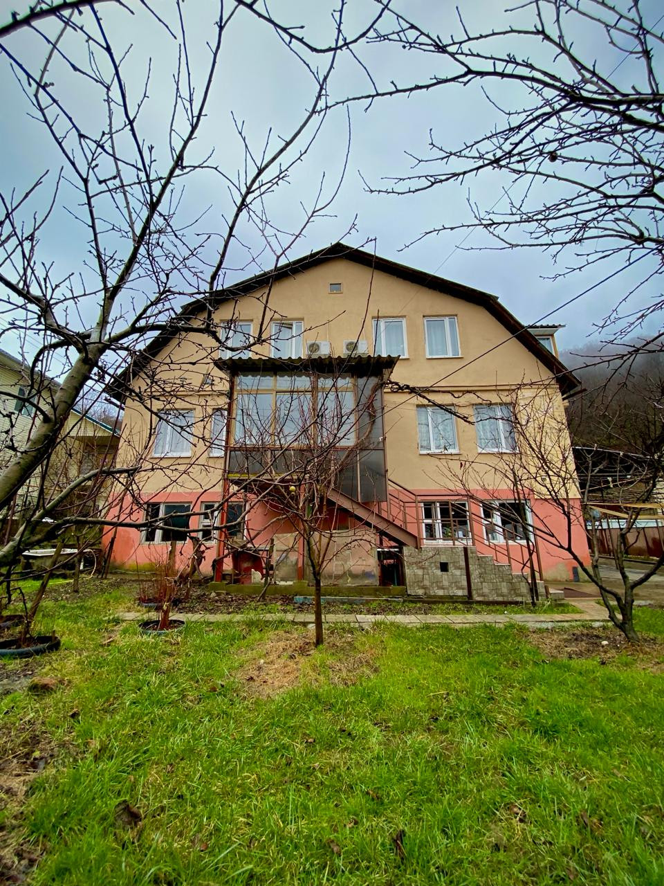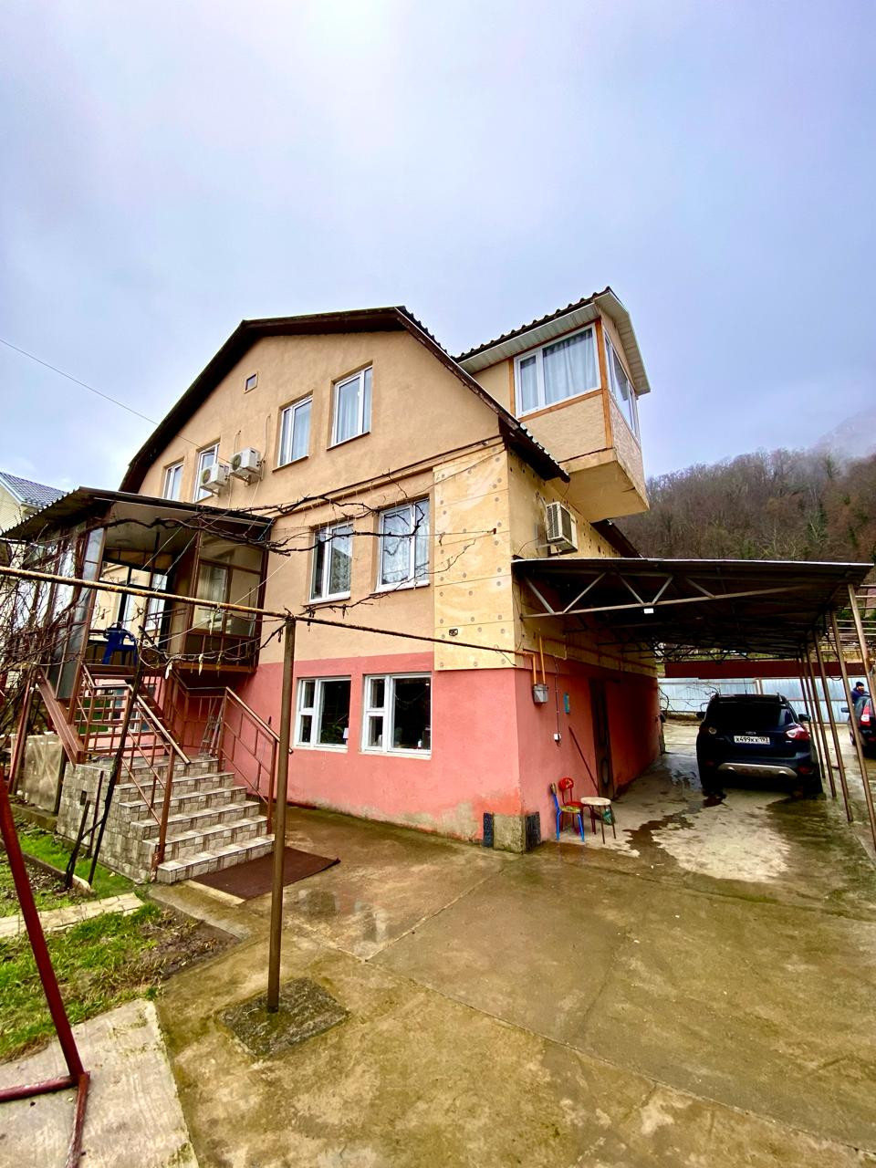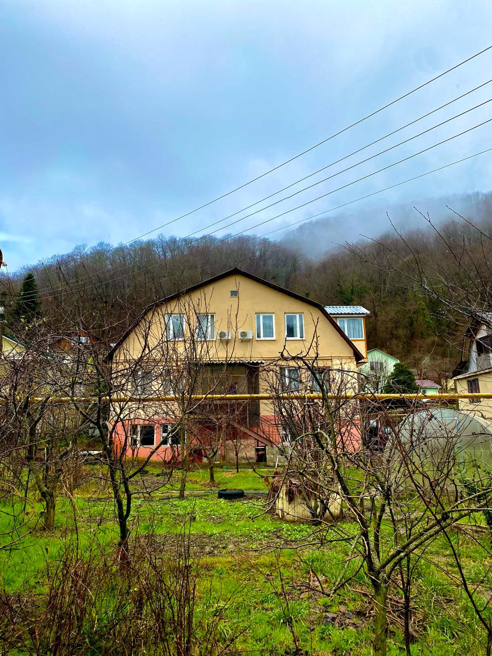 Дом трехэтажный. Первый этаж выполняет функцию подвального помещения, где можно хранить необходимые для дома инвентарь, а также резину для автомобиля и лыжи и сноуборды для поездки на Красную Поляну. Второй и третий этажи полностью жилые, с ремонтом. В доме много спален, две кухни и несколько санузлов.
