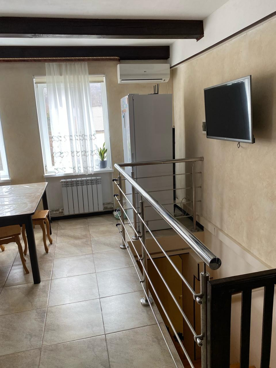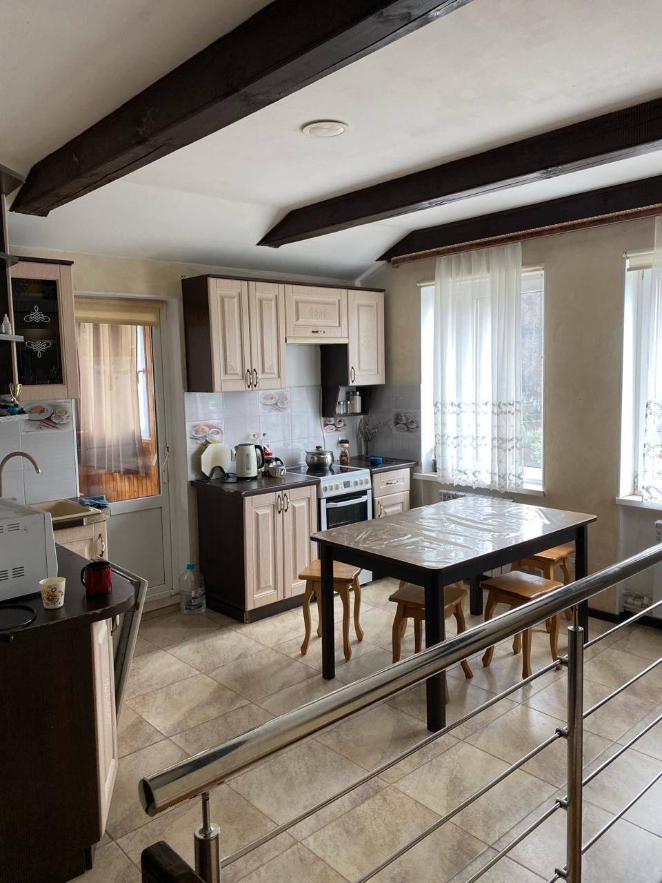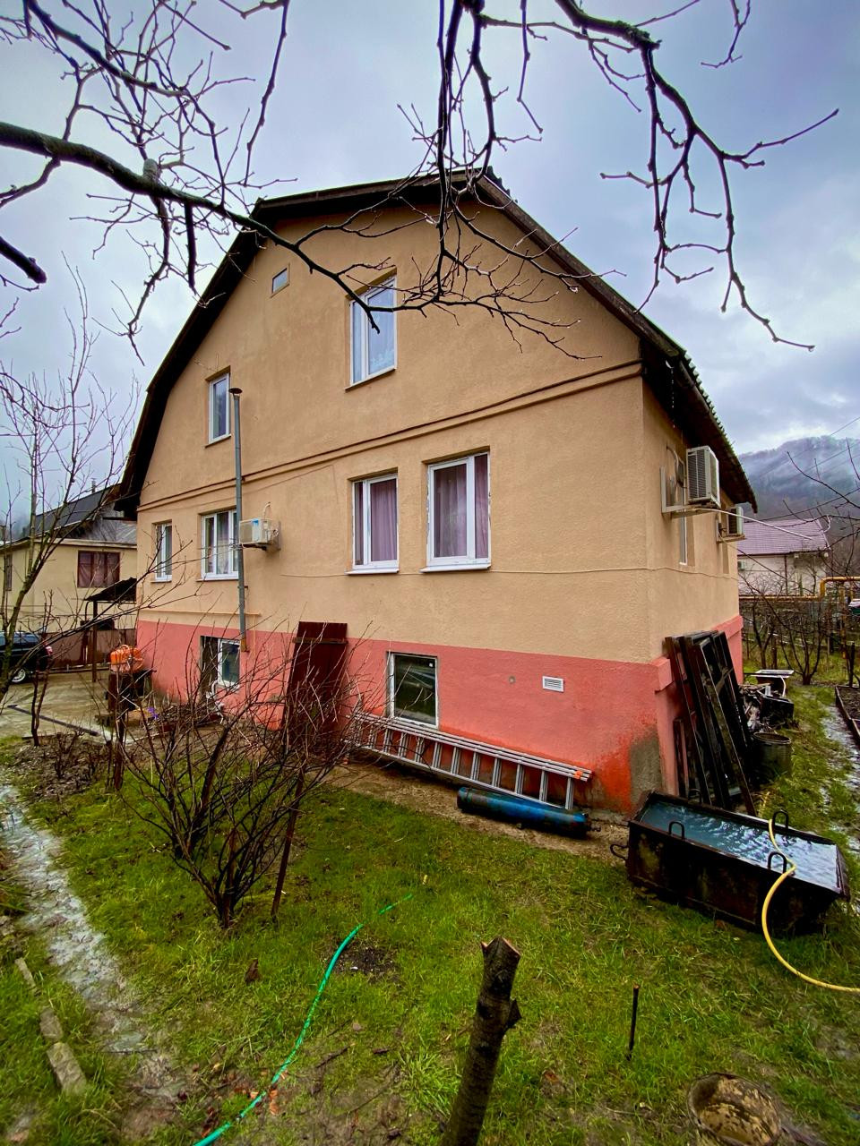 Дом трехэтажный. Первый этаж выполняет функцию подвального помещения, где можно хранить необходимые для дома инвентарь, а также резину для автомобиля и лыжи и сноуборды для поездки на Красную Поляну. Второй и третий этажи полностью жилые, с ремонтом. В доме много спален, две кухни и несколько санузлов.