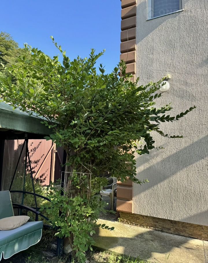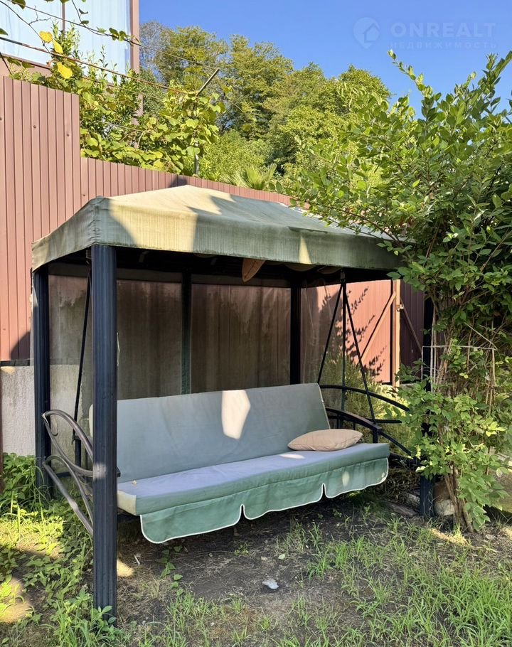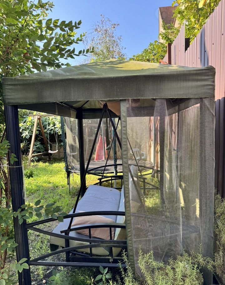 Во дворе мангальная зона, качели, детская площадка. Плодовые деревья, газон. Зелень.