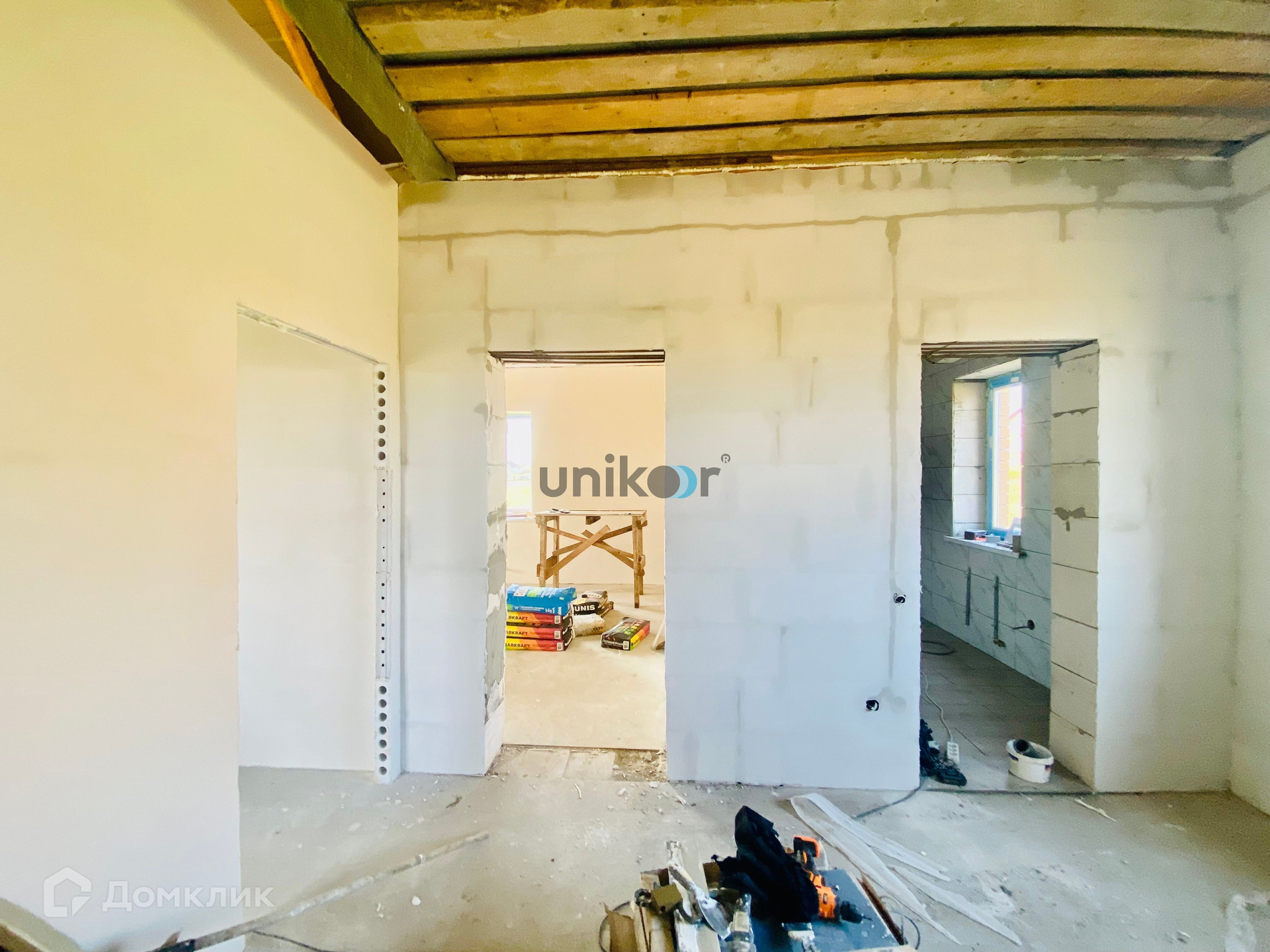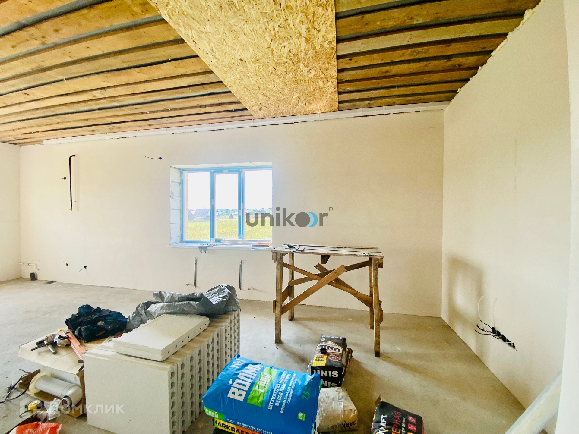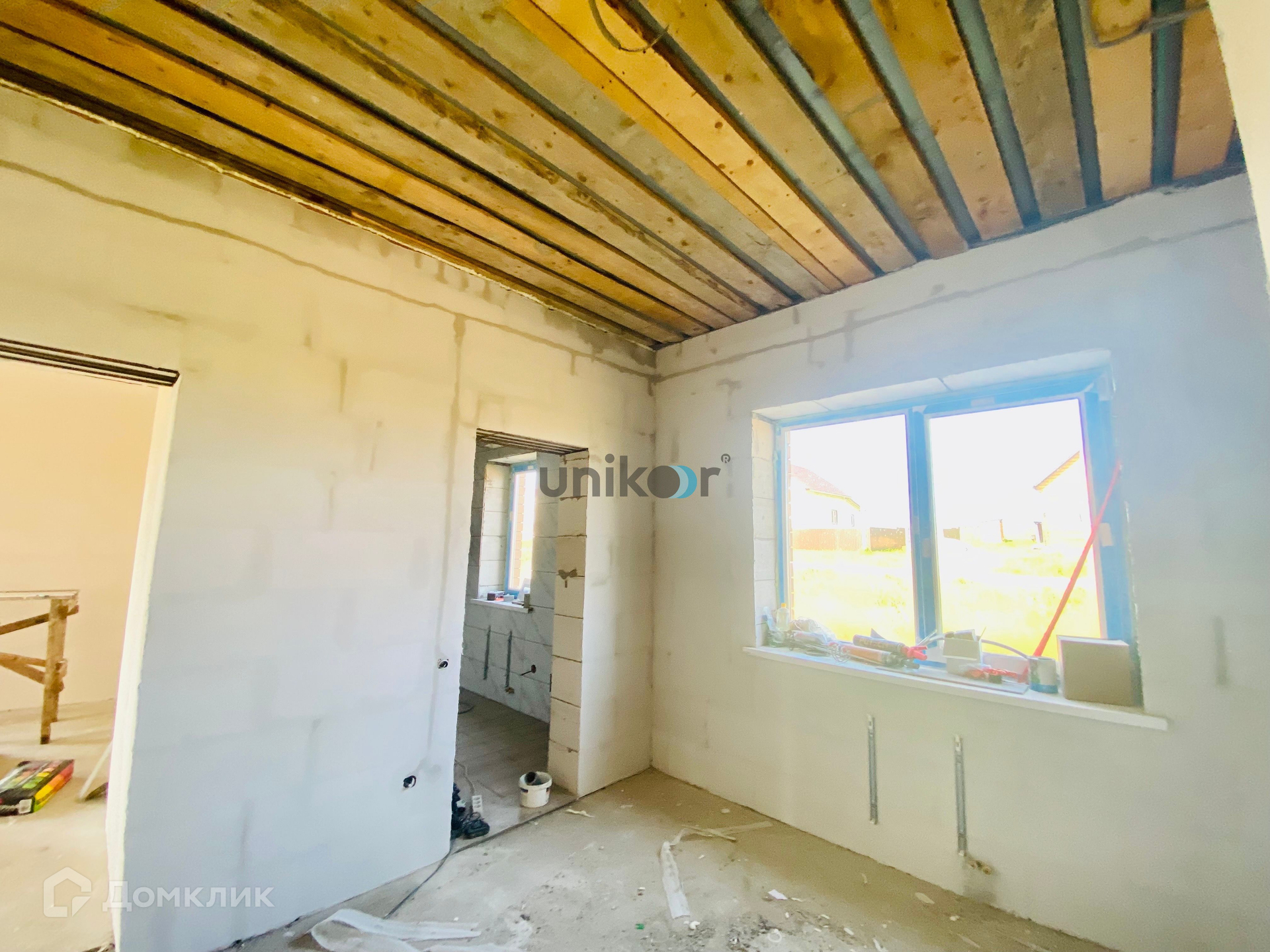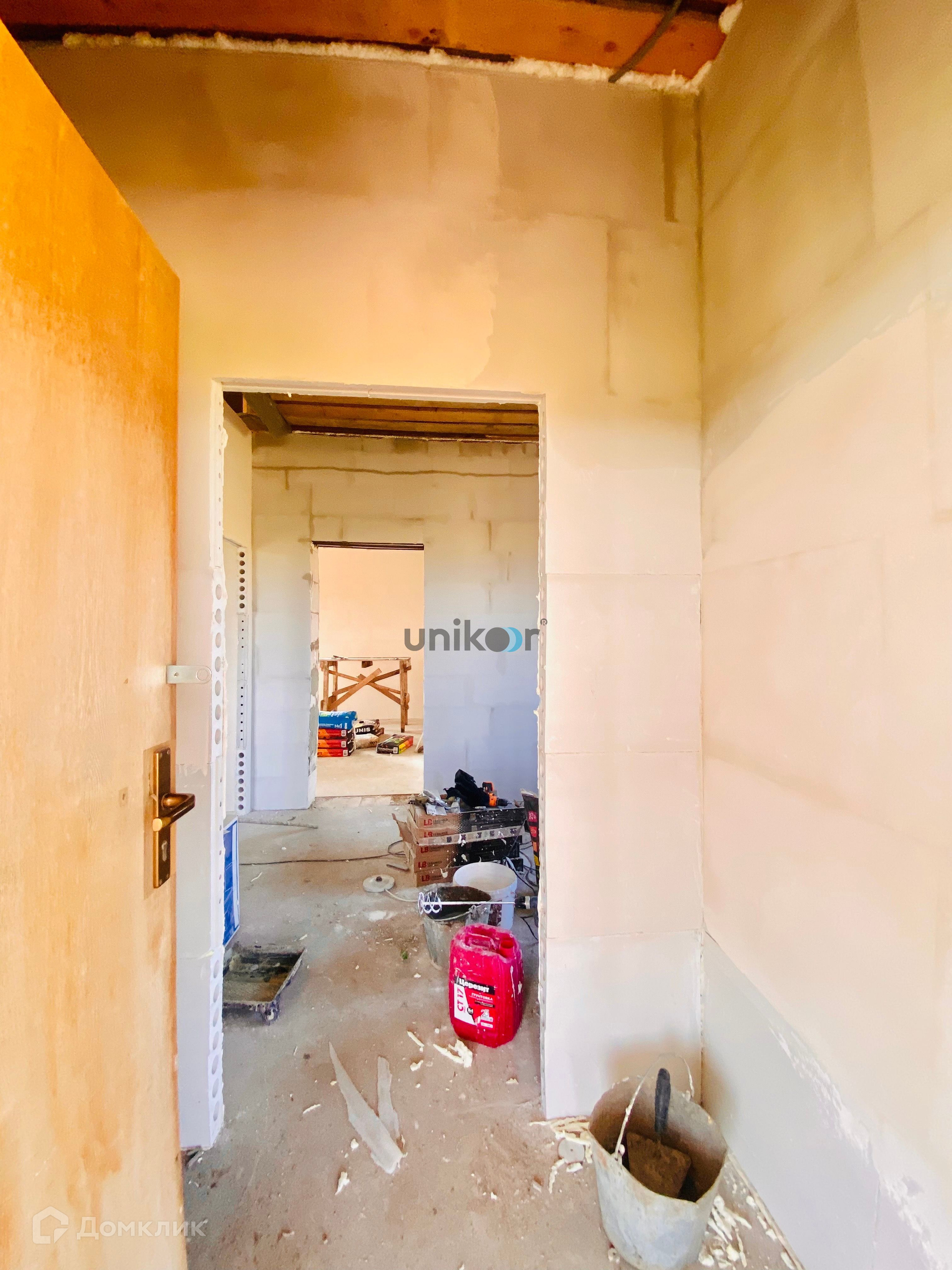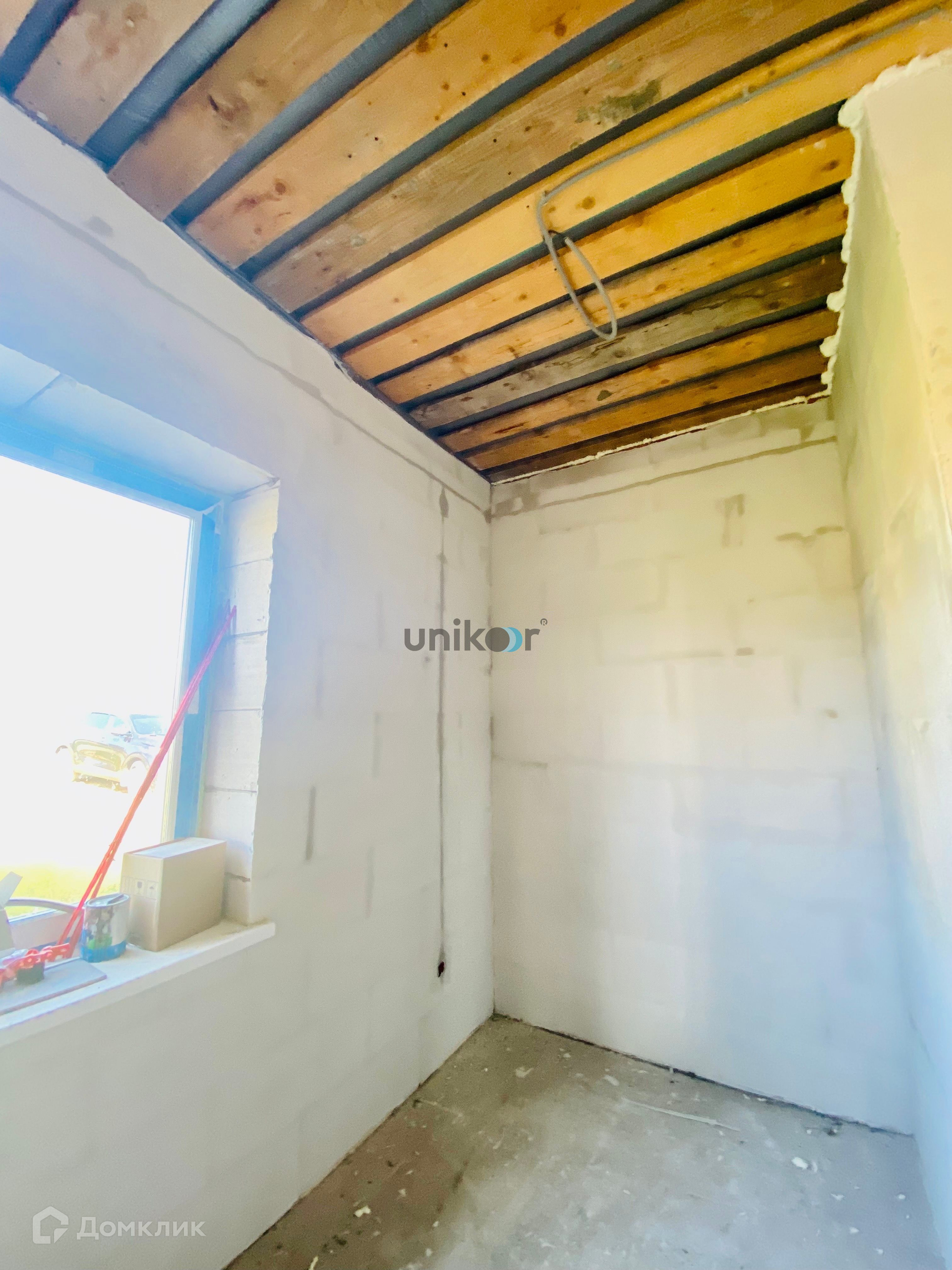 Дом построен из газоблока и облицован кирпичом. Возможно устройство второго этажа или высокой мансарды.