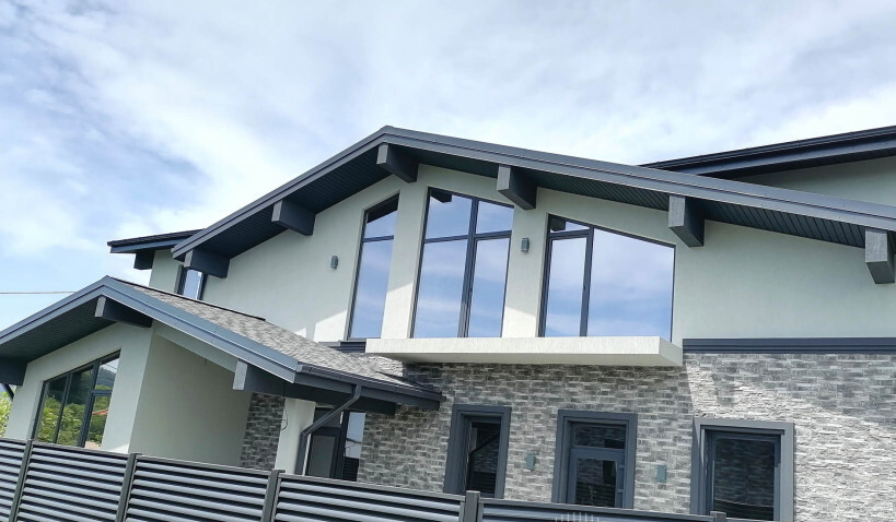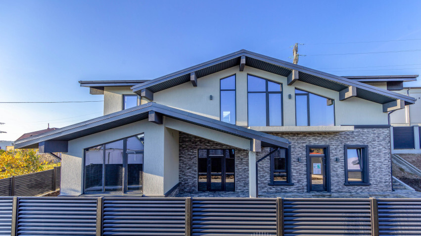 Фасад дома отделан декоративными элементами из камня и штукатурки. Крыша покрыта мягкой кровлей. Высота потолков первого этажа достигает 3,7 м., второго этажа — 3,2 м.