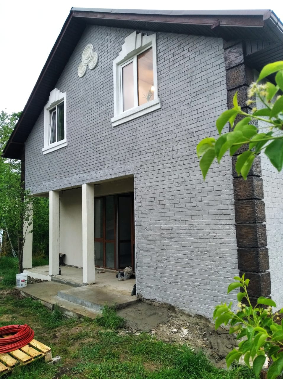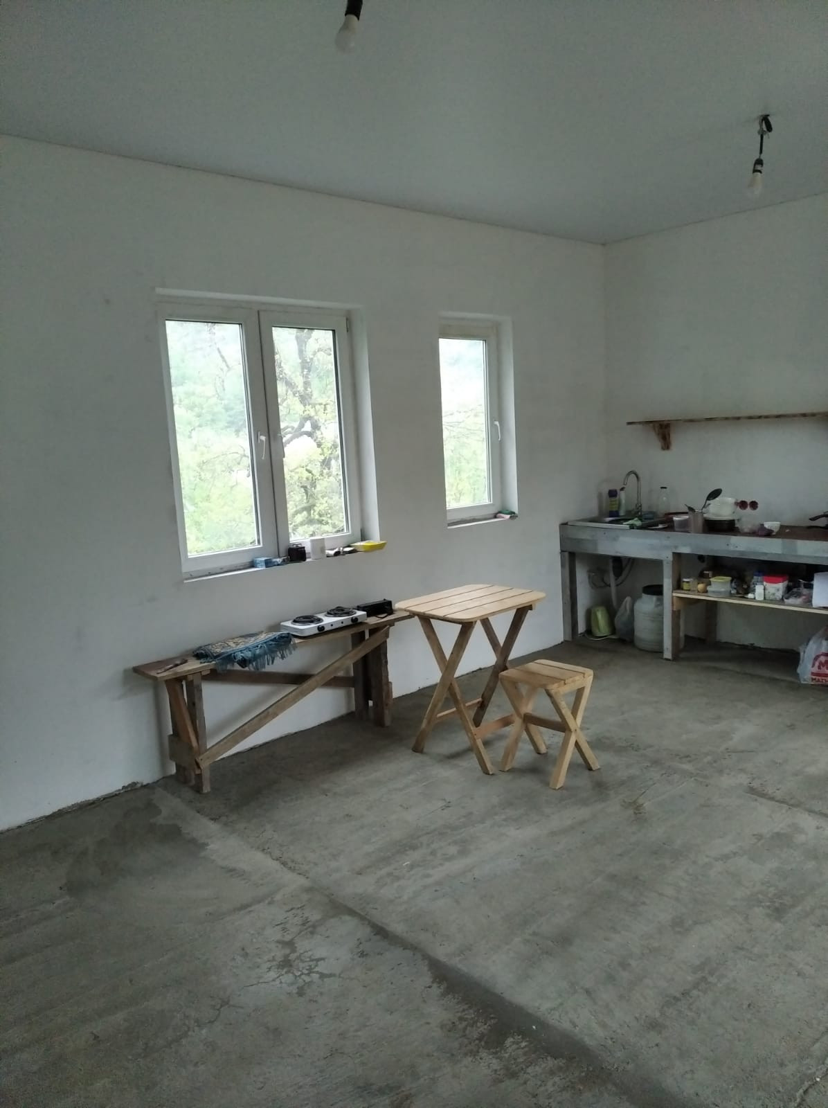 водяное отопление (Электро котел), штукатурка стен. Газ около участка
