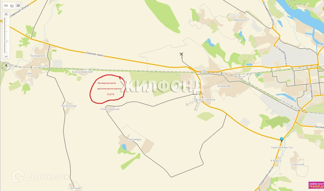 Земельный участок площадью 21,6 га сельскохозяйственного назначения, расположен на юго-западе от аэропорта Толмачево в 3 км от центра логистики, 2 км от железной дороги, станция пригородных электричек Сады и в 6 км от Аэропорта Толмачево. Асфальт почти до самого участка, магистральная газовая труба рядом - в 80 м от участка. Возможно выделение и продажа меньшей площади (1Га за 1 100 000руб.)