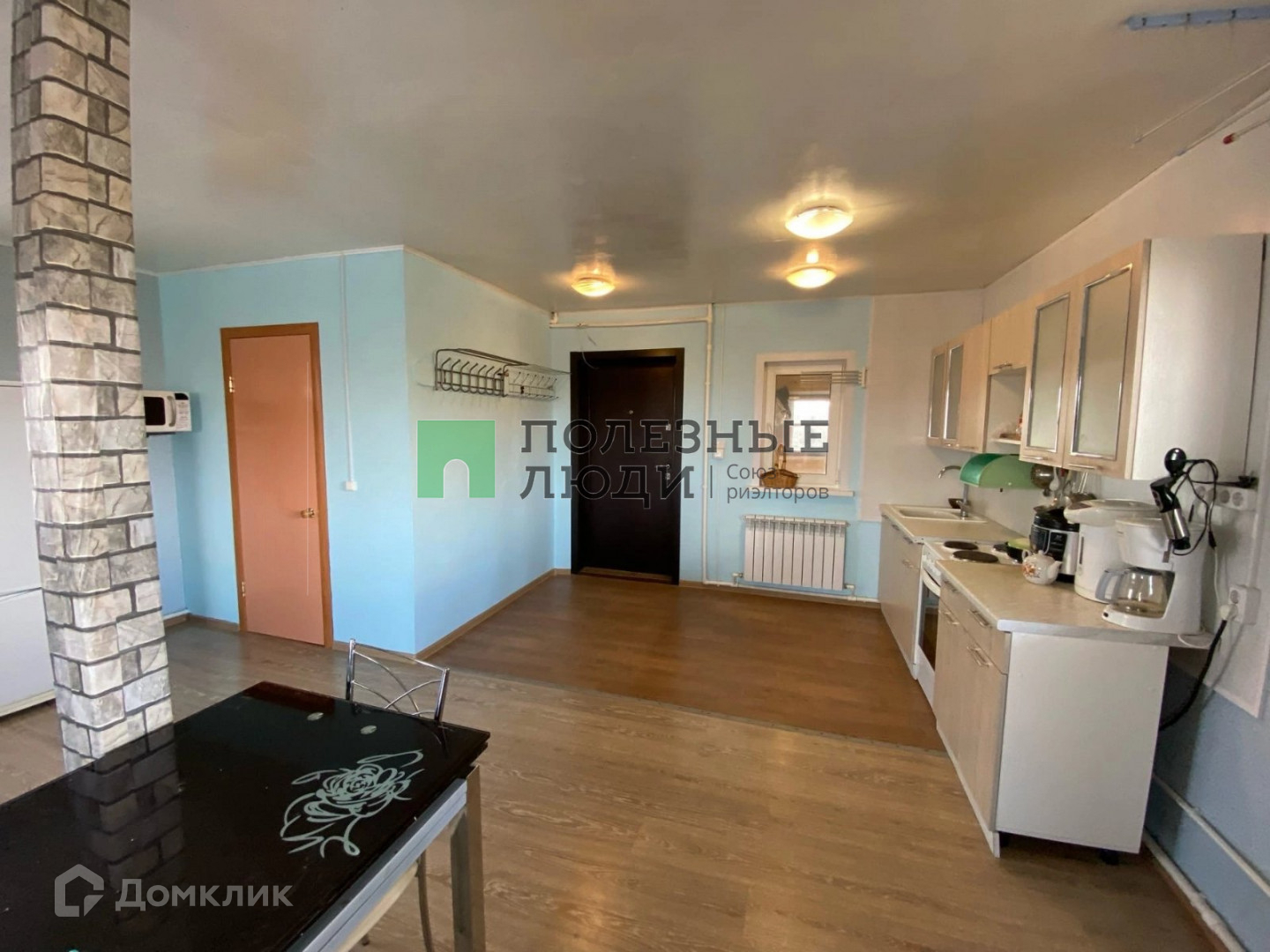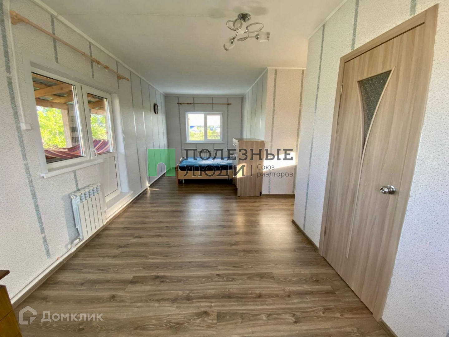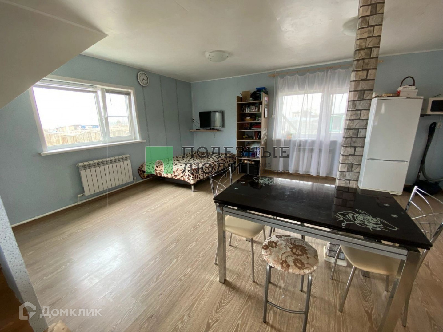 Первый этаж - просторная кухня, совмещенная с залом (45 кв.м.), совмещенный туалет (установлена душевая кабина), на втором этаже 3 комнаты (одна проходная и 2 изолированных). Потолок крашеный, на полу ламинат, на кухне и в туалете линолеум, свежие обои.