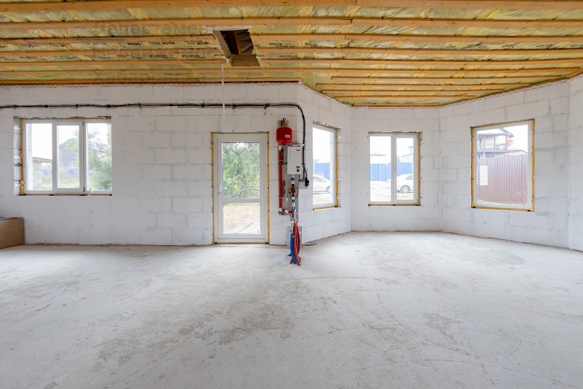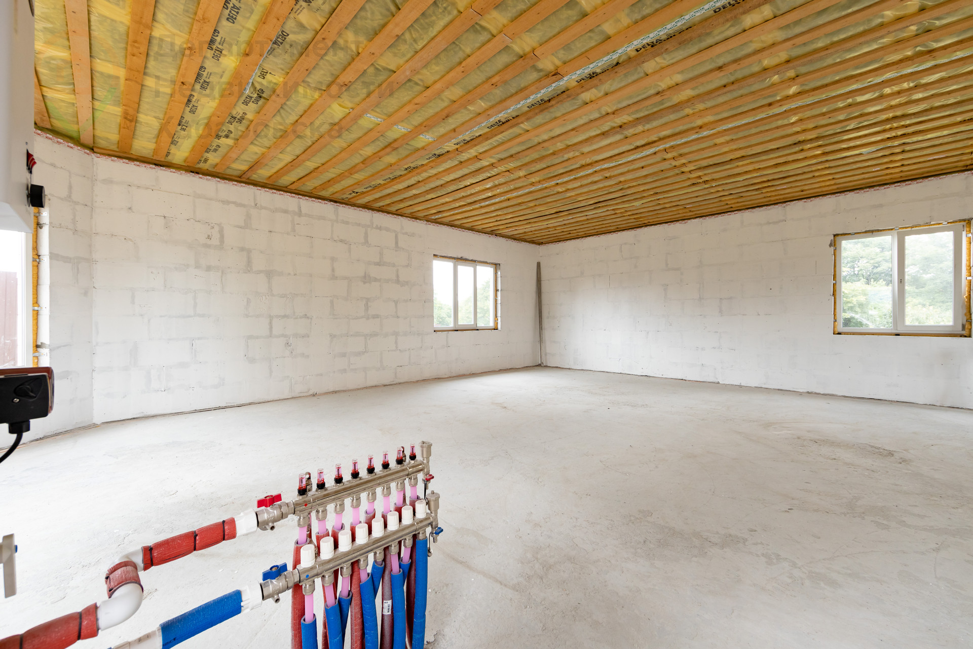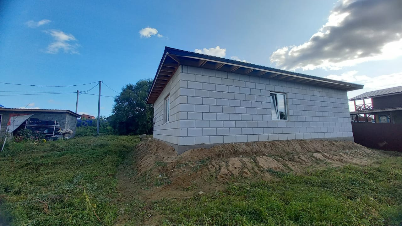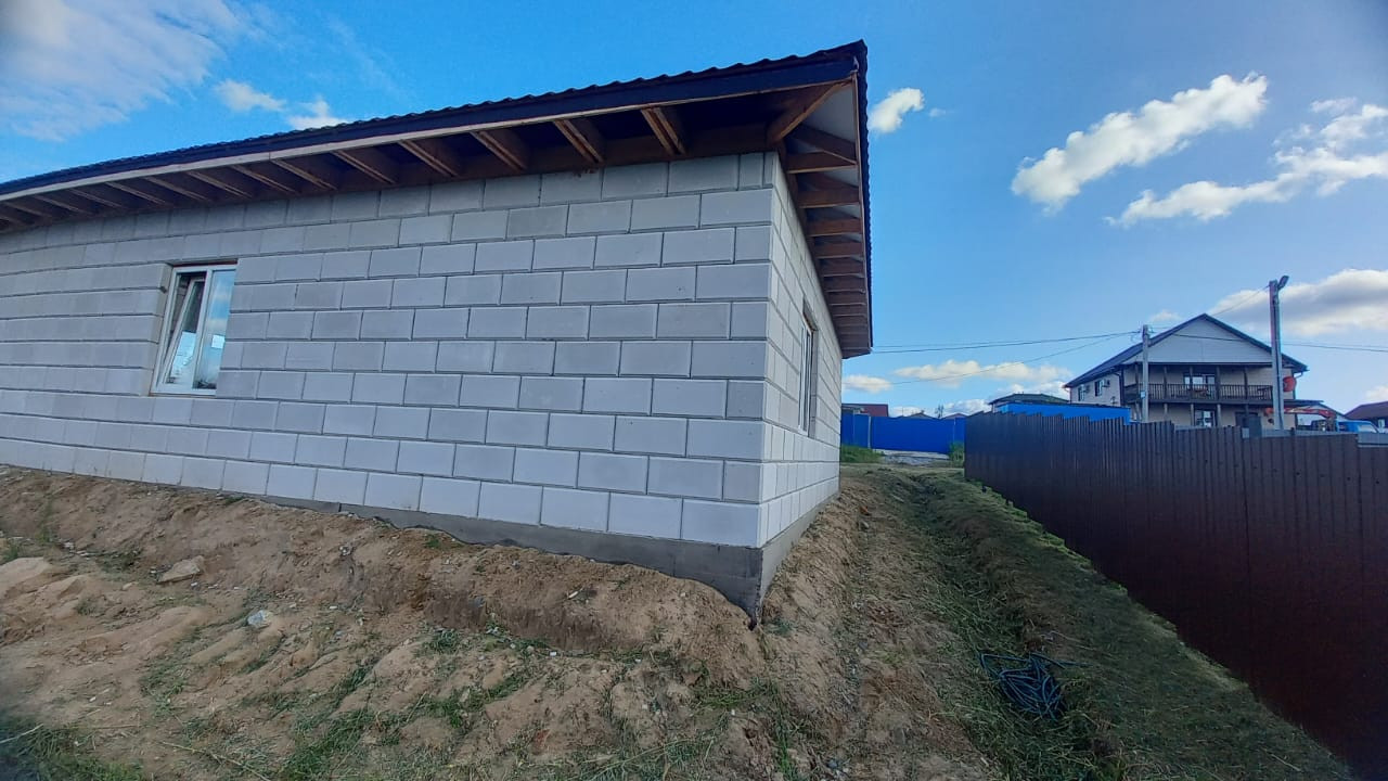 О доме: один этаж- очень удобно, 96 квадратов полезной площади (не площадь застройки, как указывают иногда) кровля опирается на стены и внутри несущих конструкций нет! При строительстве использован только сертифицированный бетон и газобетон, утеплитель "Knauf", все материалы только лучшего качества. Сваи на глубине 3 метра, лента на песчаной подушке и пенополистироле, гидроизолирована и укрыта песком. Грунт из периметра вынут и уложен песок с тромбовкой водой. Теплый пол выполнен из трубы 20 диаметра, коллектор "TIM",  котёл  (Zota), в системе антифриз. Окна и двери из профиля "Rehau" Балки над проёмами и армопояс выполнены внутри блока с утеплением, что исключает мостики холода.