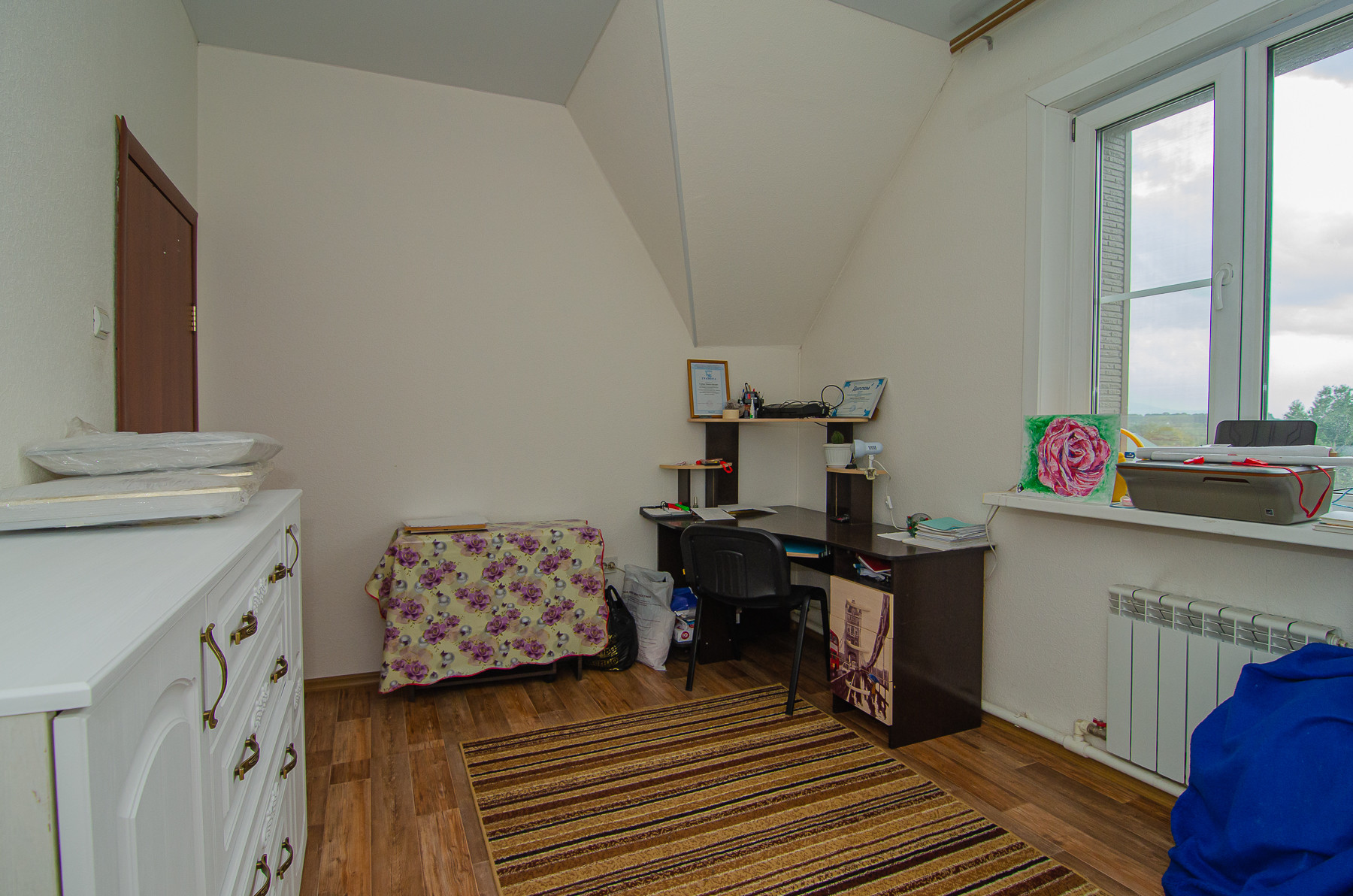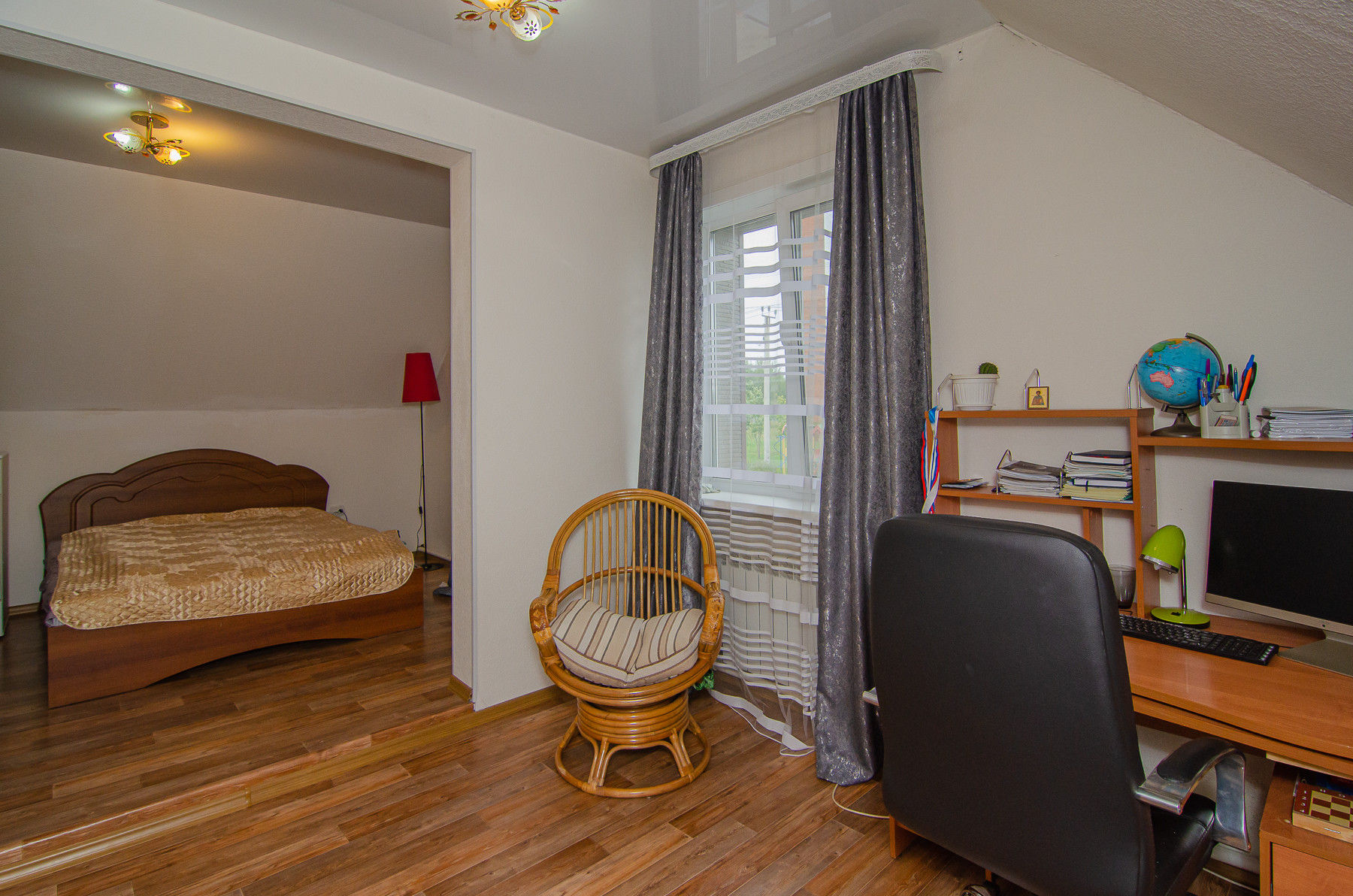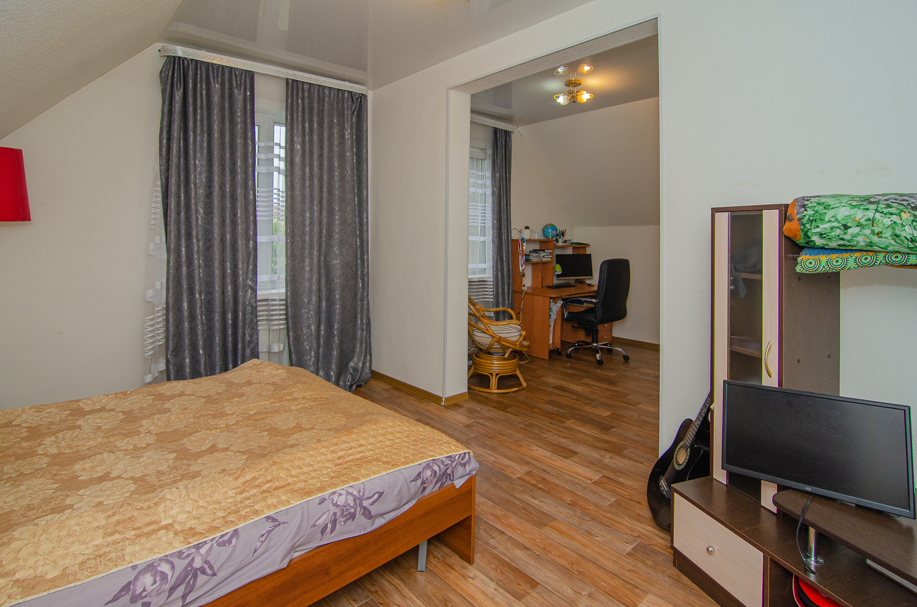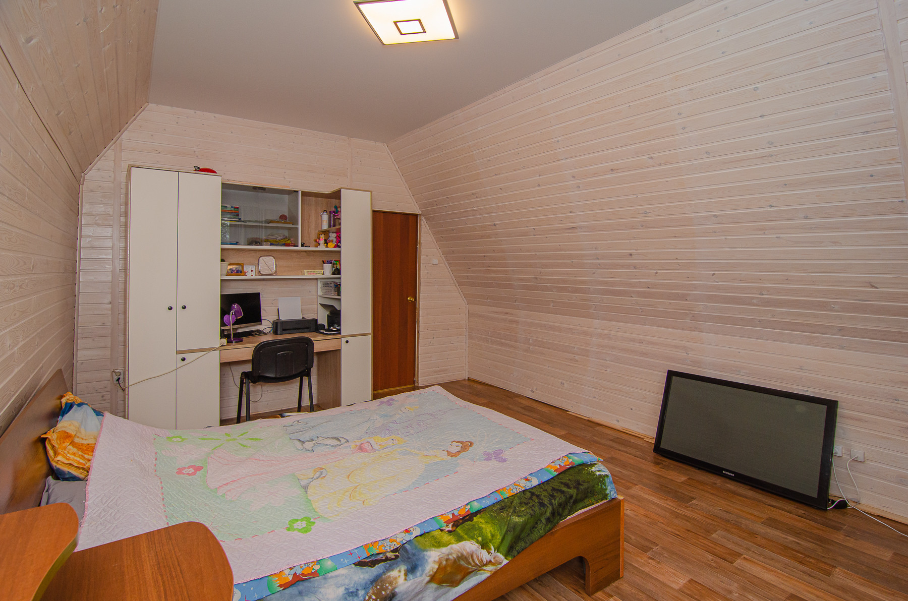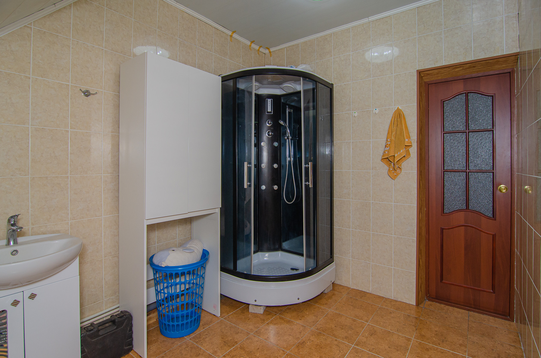 Второй этаж занимают три спальные комнаты, две из них оборудованы рабочими кабинетами, в третьей имеется рабочая зона (стены евровагонка, покрытая белым маслом) и санузел с душевой кабиной, так же отделан кафелем, есть подводка для второй стиральной машины.