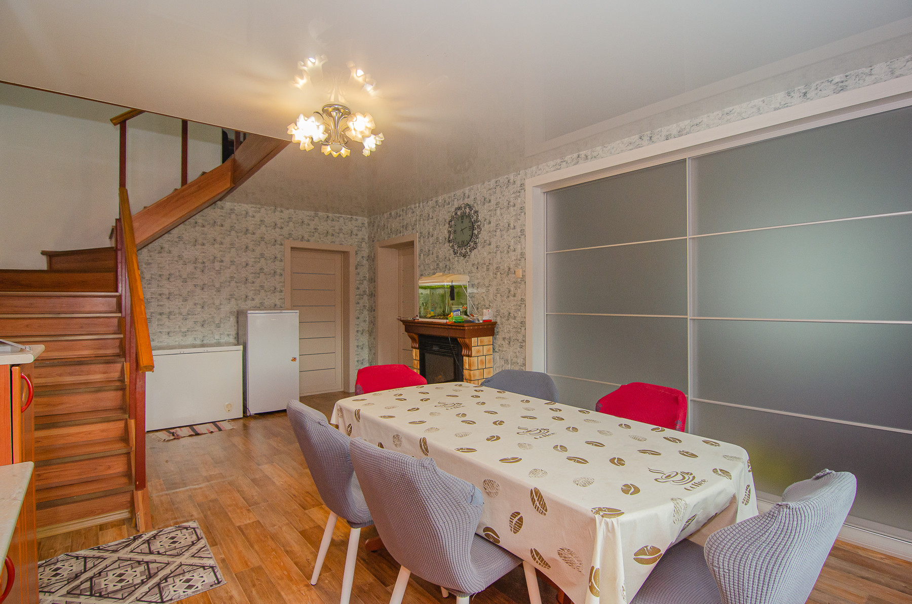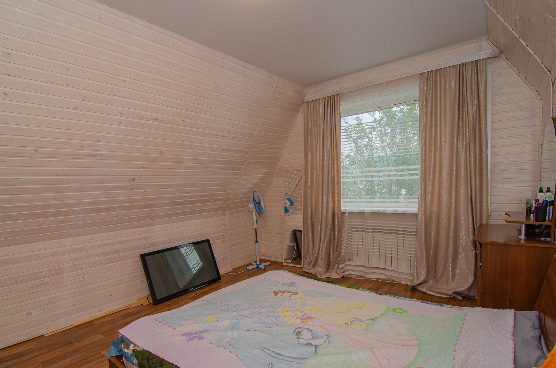 Все стены в доме ровные, оклеены обоями, на полу линолеум. Потолки натяжные, кроме санузла на втором этаже – евровагонка.