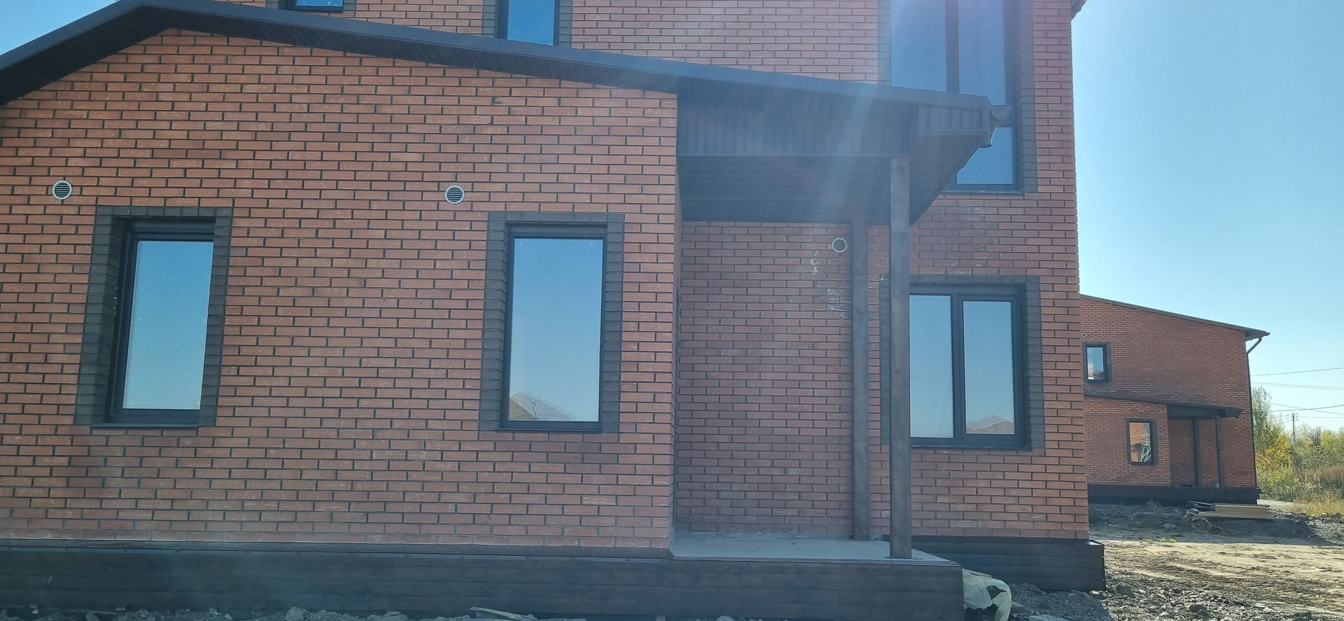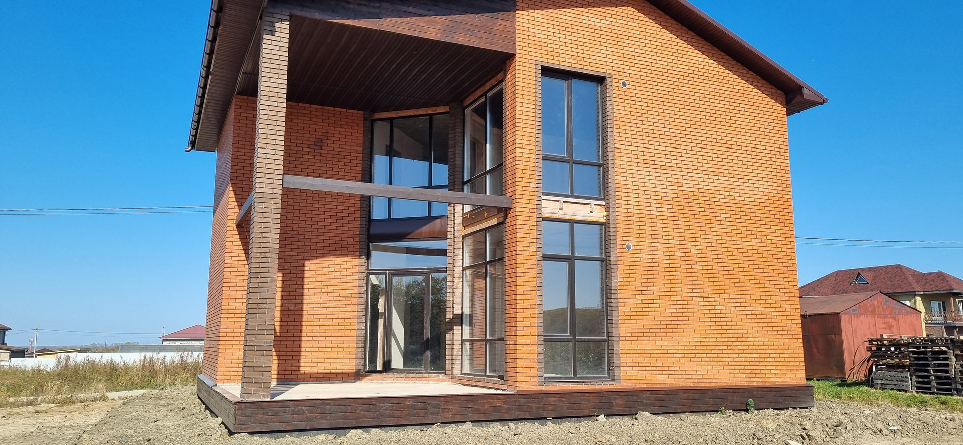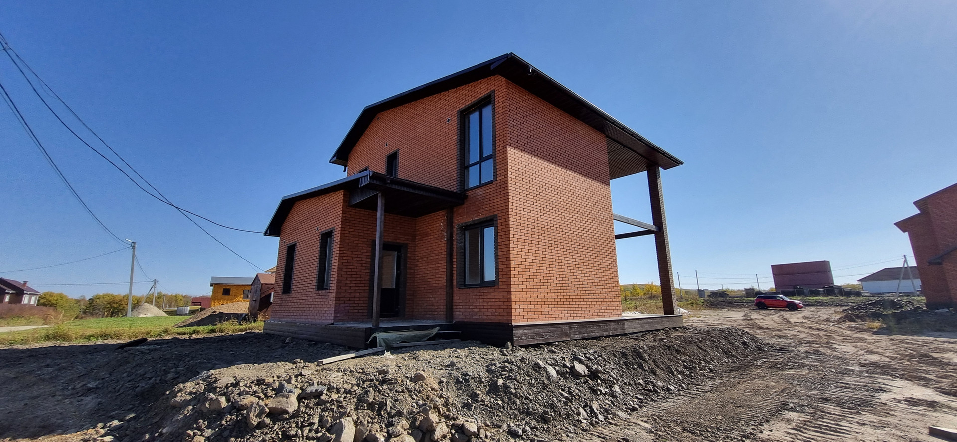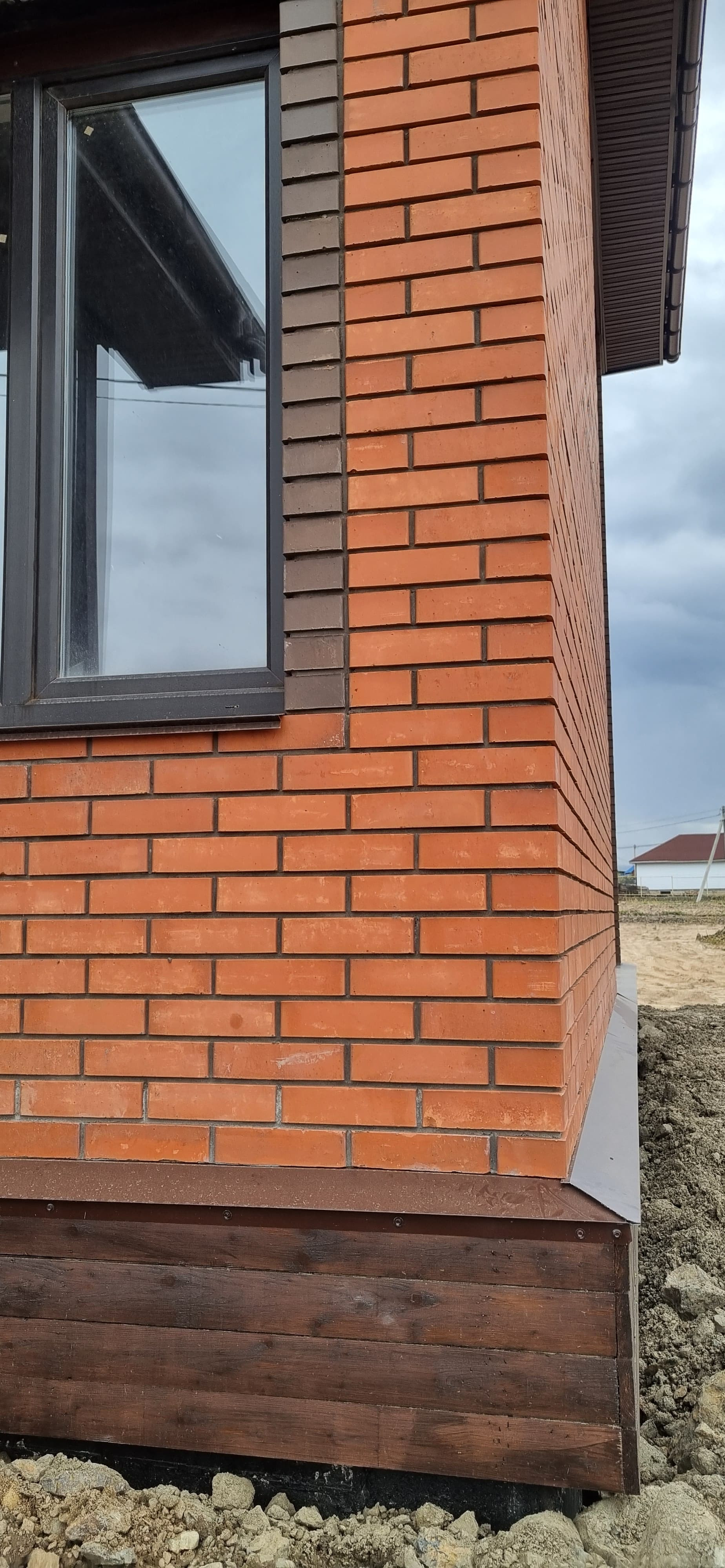 - Облицован фасадным красным и коричневым кирпичом.