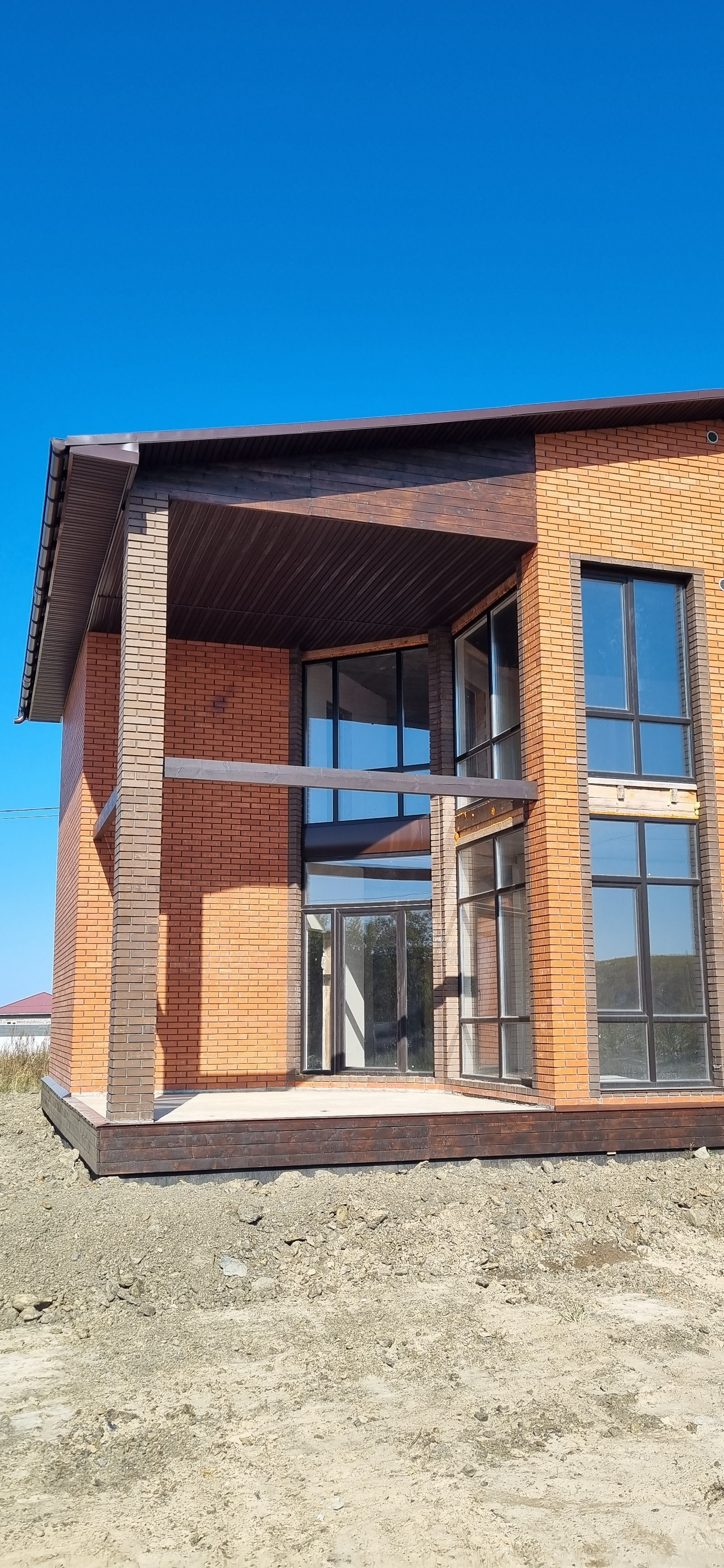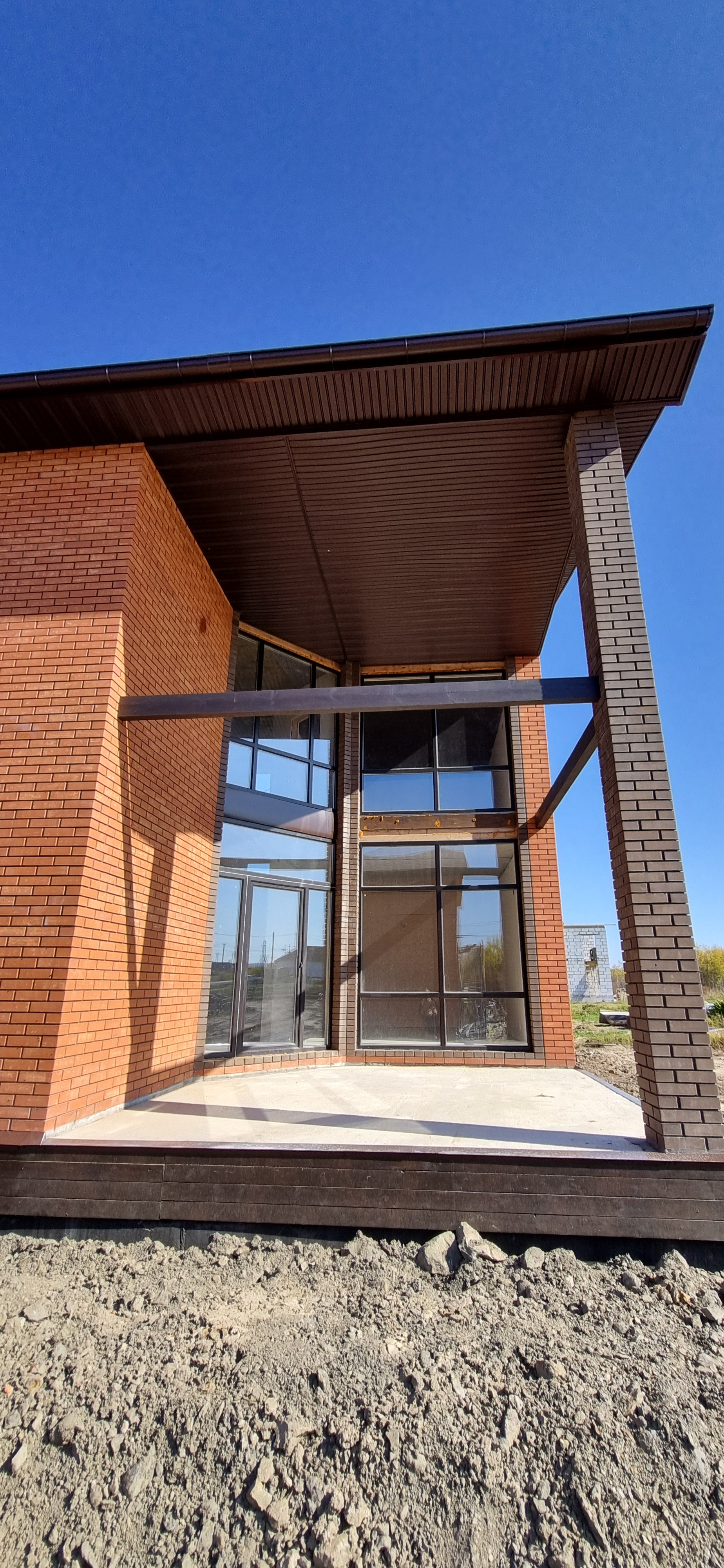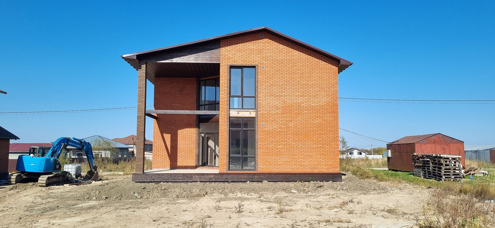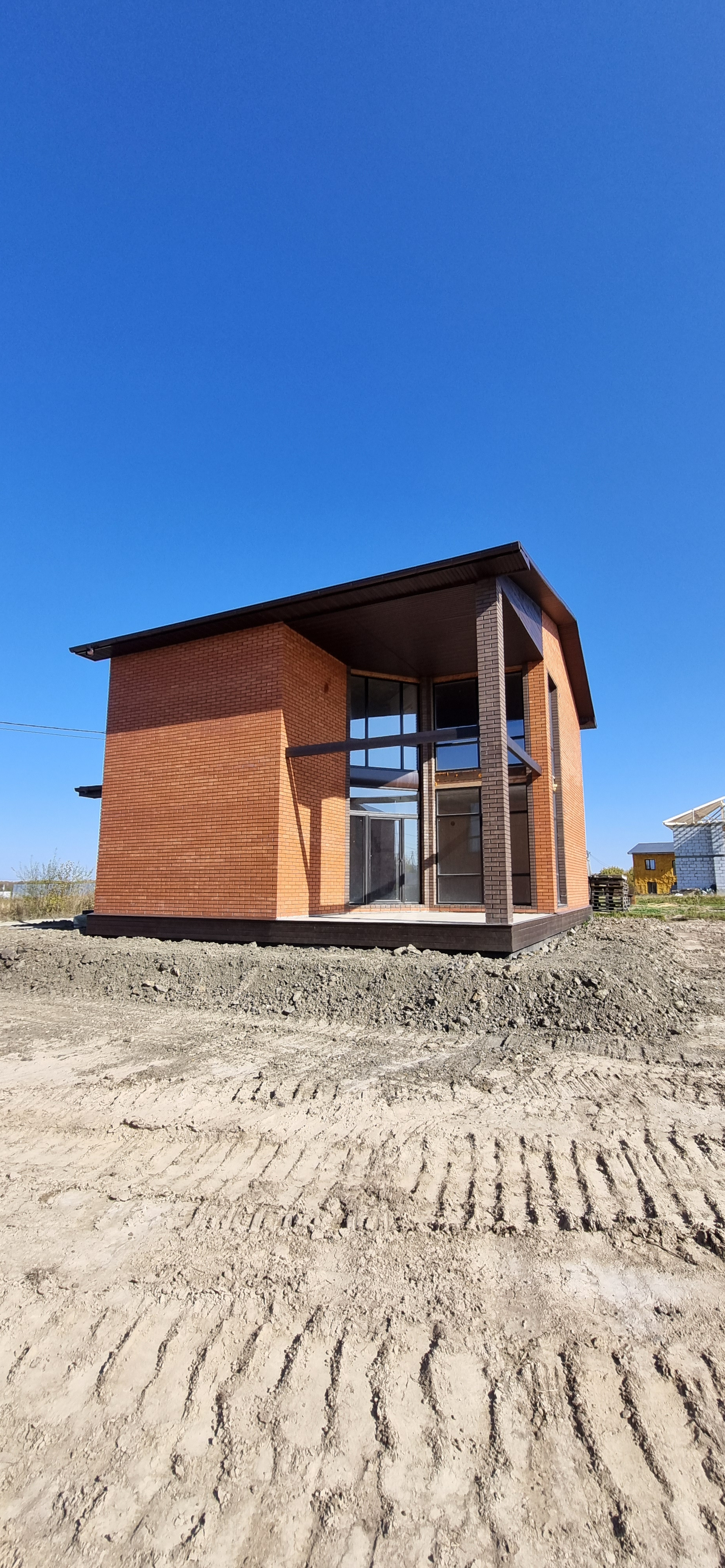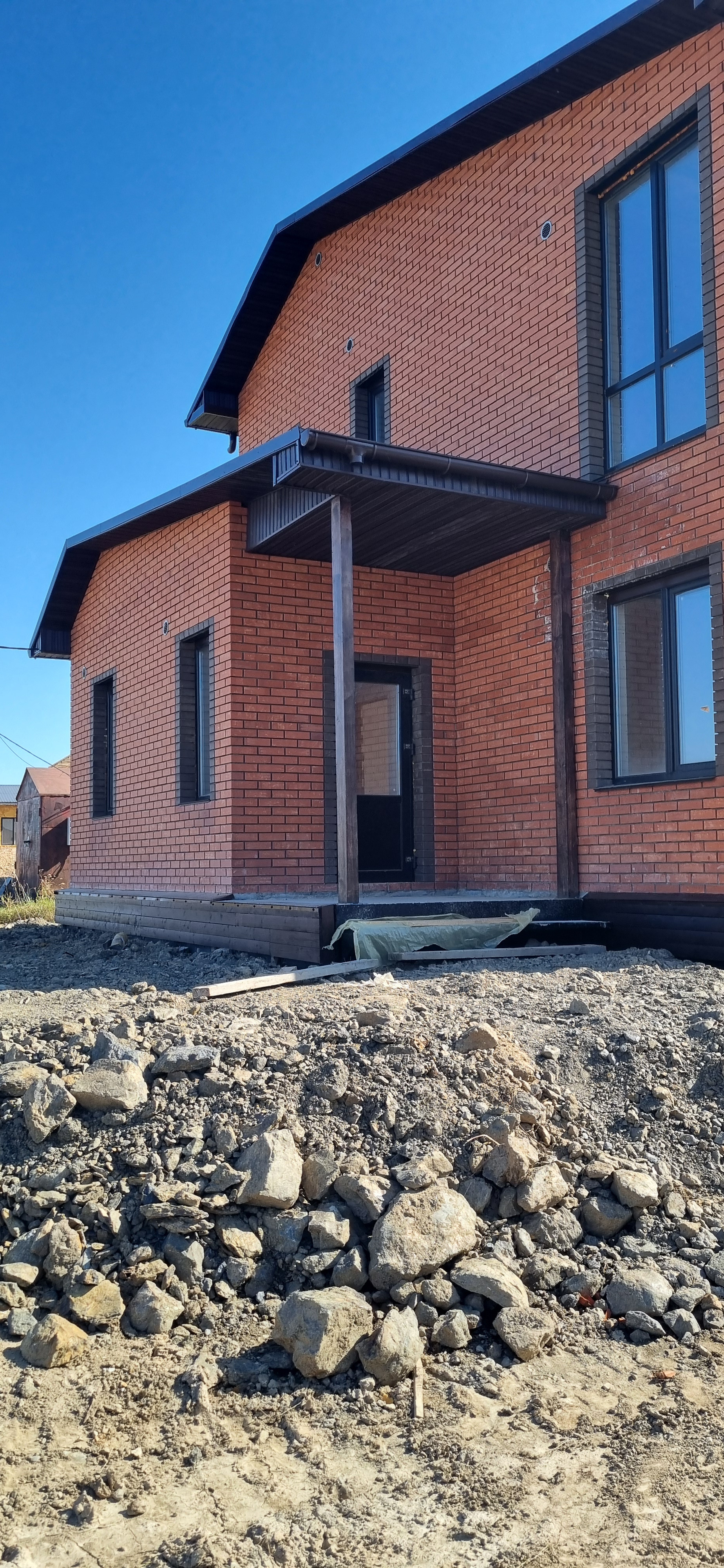 - Облицован фасадным красным и коричневым кирпичом.