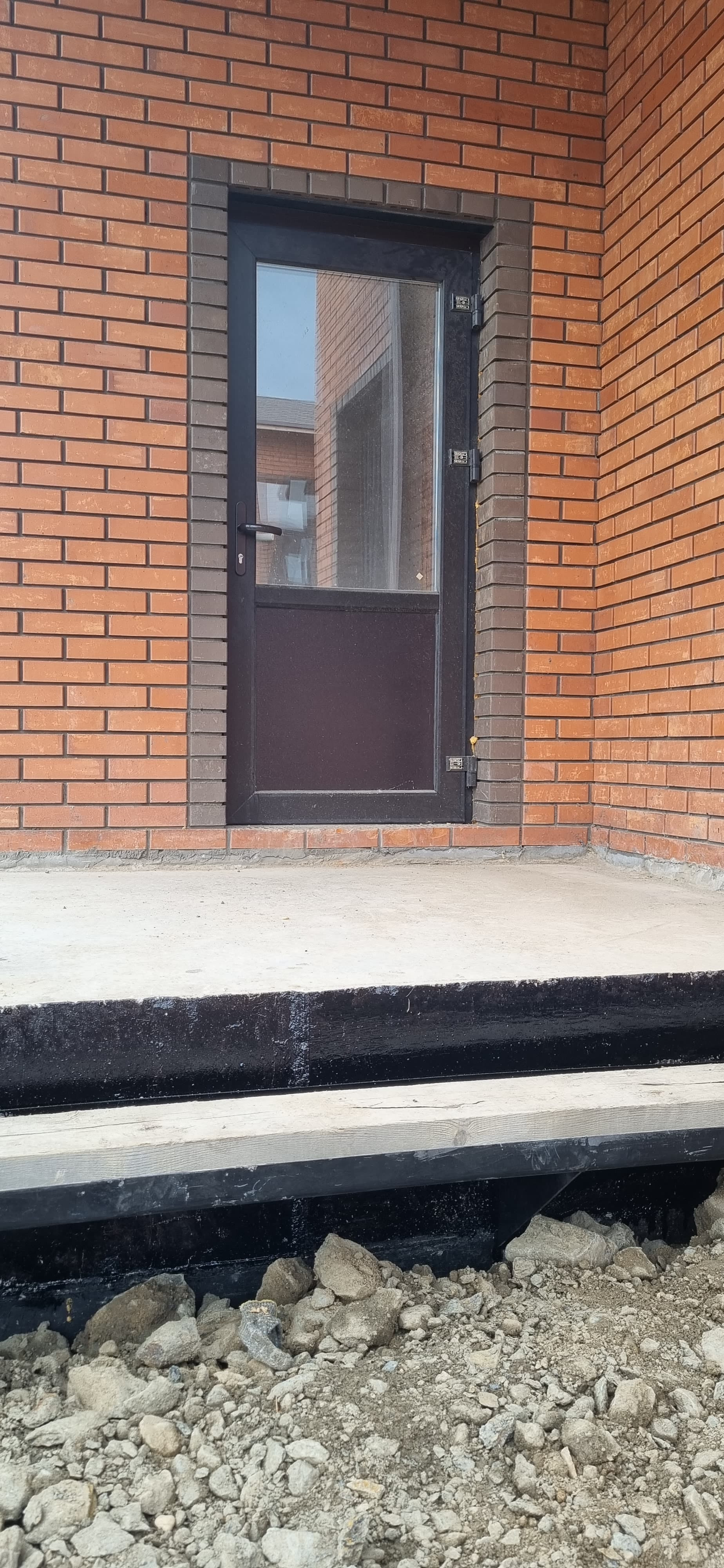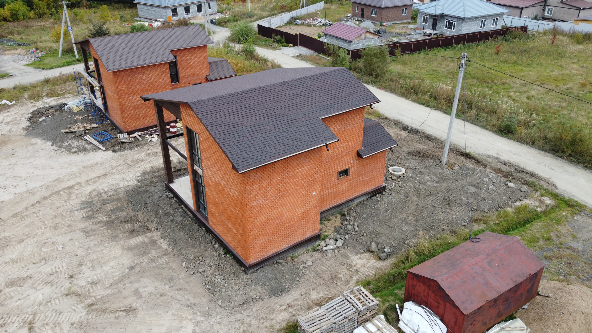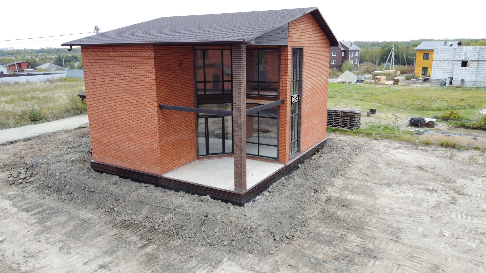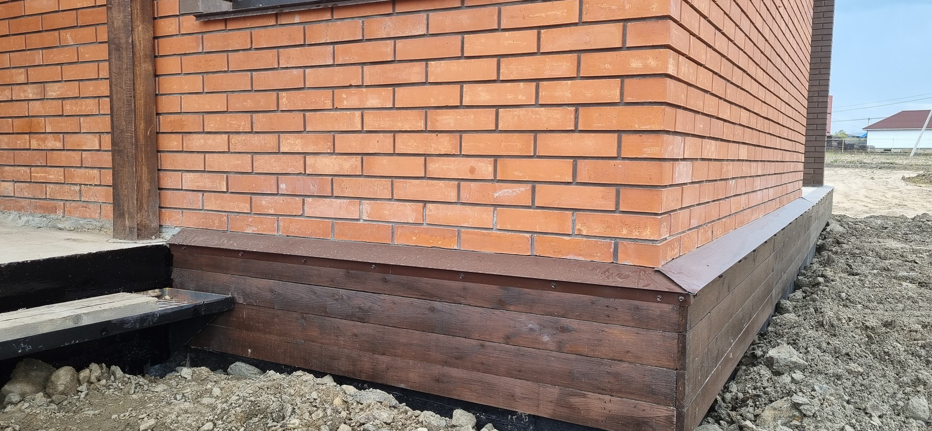 - Облицован фасадным красным и коричневым кирпичом.
