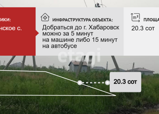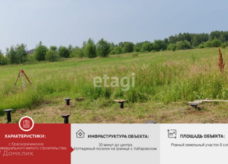 Продам отличный земельный участок под индивидуальное жилищное строительство в с. Краснореченское, в непосредственной близости к городу Хабаровску (добраться можно за 5 минут на машине либо 15 минут на автобусе). Участок ровный, хорошо освещен со всех сторон солнцем, сухой, расположен в динамично развивающемся районе, рядом строятся жилые дома. Оди... |
