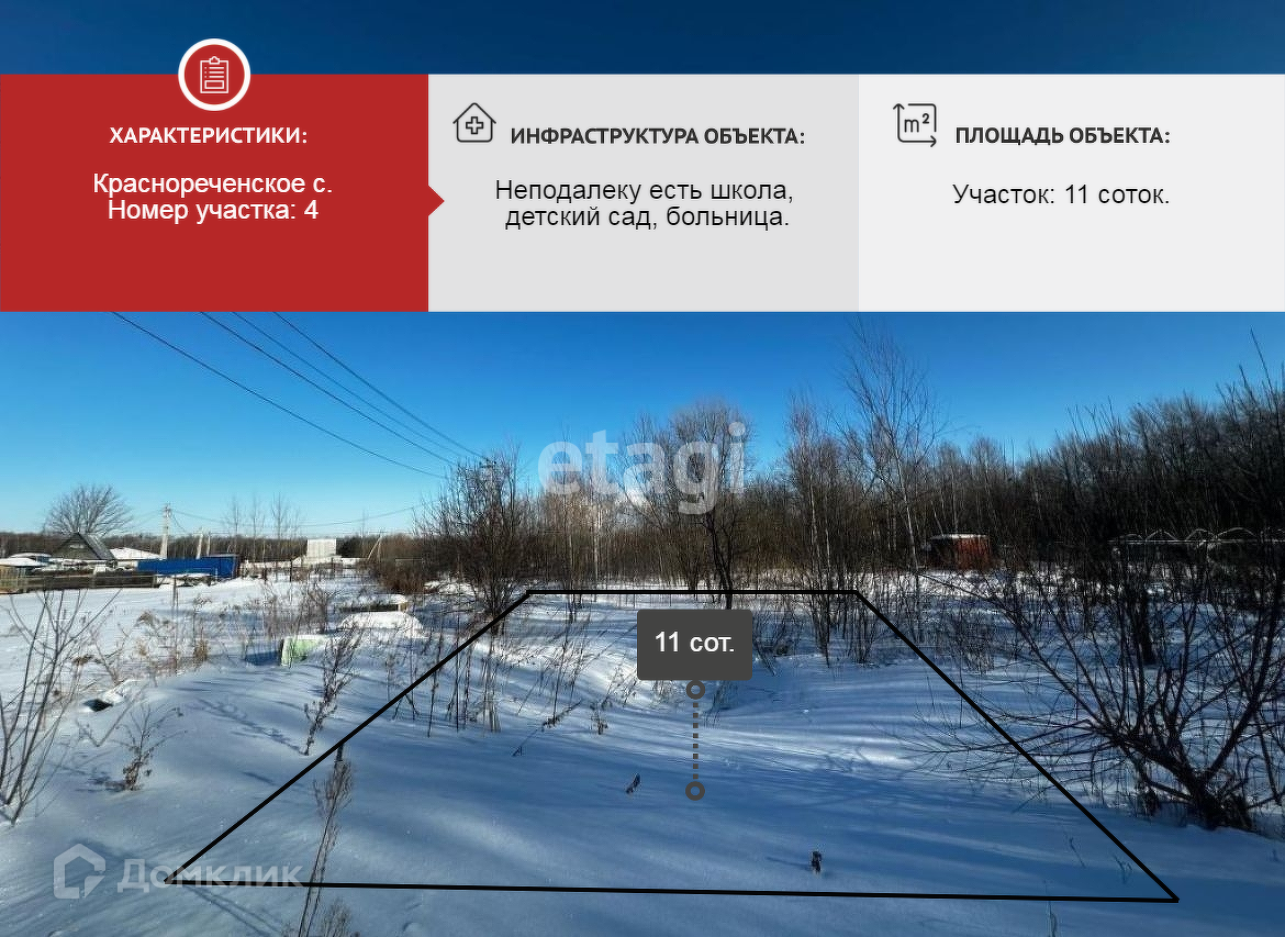Продается земельный участок в с. Краснореченское, уч. № 4, в 90 метрах на северо-восток от участка № 7 по пер. Южному, 11 соток : местность ровная, очищен от деревьев, (земля не обработана), рядом расположен коттеджный поселок , который газифицирован и электрифицирован, дороги проходимые.